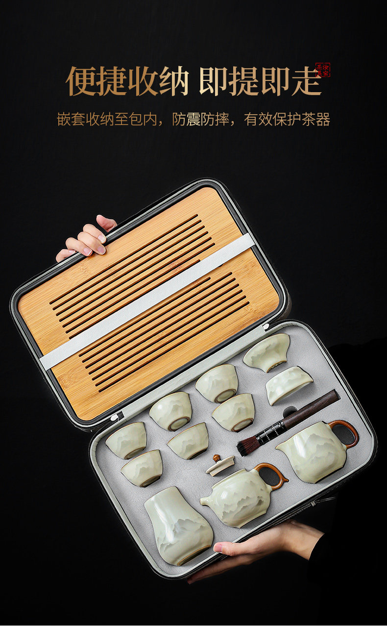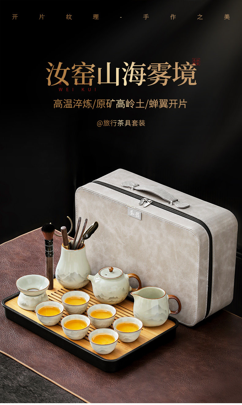 Ru Kiln Travel Tea Set with Tea Tray, Portable Outdoor Camping Ceramic Teapot for Making Tea on the Go