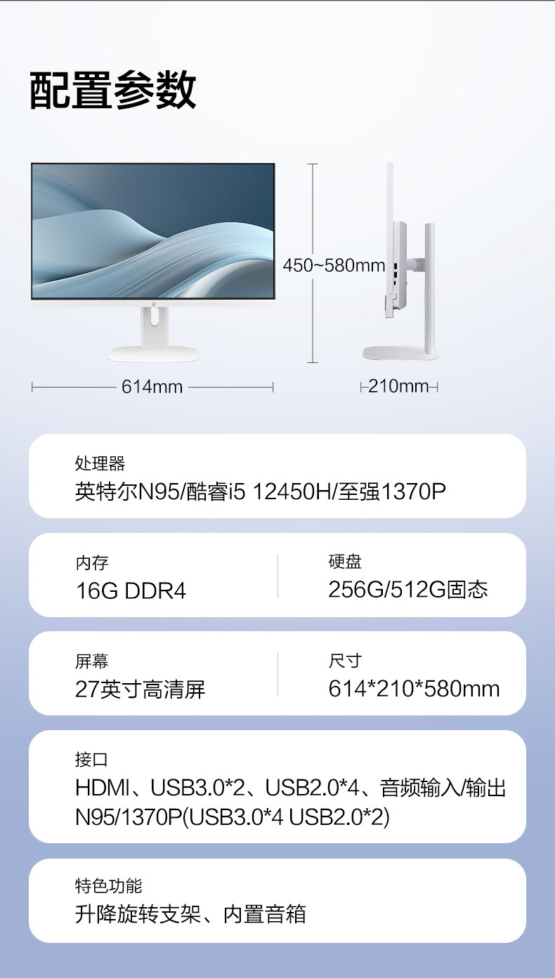 | Color Classification | 23.8inch /Quad-Core N95/16G+256G/Black,27inch /Quad-Core N95/16G+256G/White,23.8inch /Quad-Core N95/16G+512G/Black Small Screen Hot Selling,27inch /Quad-Core N95/16G+512G/White Hot Selling Recommendation,23.8inch / Octa-Core I5 12450H/16G+512G/White Store Manager’S Main Recommendation,27inch / Octa-Core I5 12450H/16G+512G/White Store Manager’S Main Recommendation,27inch /Octa-Core W1370P/16G+512G/White |
