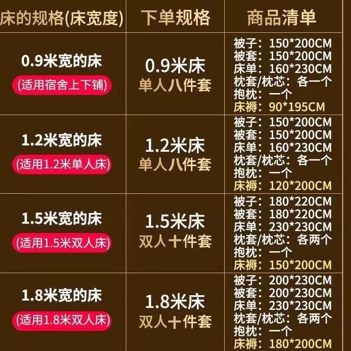 | Size | [0.9m Wide Bed]1.5*2m Summer Quilt Eight-Piece Set,[0.9m Wide Bed]1.5*2m 1.5kg Quilt Eight-Piece Set,[0.9m Wide Bed]1.5*2m 2kg Quilt Eight-Piece Set,[0.9m Wide Bed]1.5*2m 2.5kg Quilt Eight-Piece Set,[0.9m Wide Bed]1.5*2m 3kg Quilt Eight-Piece Set,[0.9m Wide Bed]1.5*2m 4kg Quilt Eight-Piece Set,[1.2m Wide Bed]1.5*2m 1.5kg Eight-Piece Set,[1.2m Wide Bed]1.5*2m 2kg Quilt Eight-Piece Set,[1.2m Wide Bed]1.5*2m 2.5kg Eight-Piece Set,[1.2m Wide Bed]1.5*2m 3kg Eight-Piece Set,[1.2m Wide Bed]1.5*2m 4kg Eight-Piece Set,[1.5m Wide Bed) 1.8*2.2m 2kg Is Ten Pieces,[1.5m Wide Bed]1.8*2.2m 3kg Ten-Piece Set,1.5 Beds 180*220 4kg Winter Ten-Piece Set,[1.8m Bed]2*2.3m 2kg Ten-Piece Set,[1.8m Wide Bed]2*2.3m 3kg Ten-Piece Set,[1.8m Wide Bed]2*2.3m 4kg Winter Ten Pieces,[2m Wide Bed]2.2*2.4m 3kg Ten-Piece Set,[2m Wide Bed]2.2*2.4m 4kg Ten-Piece Set |