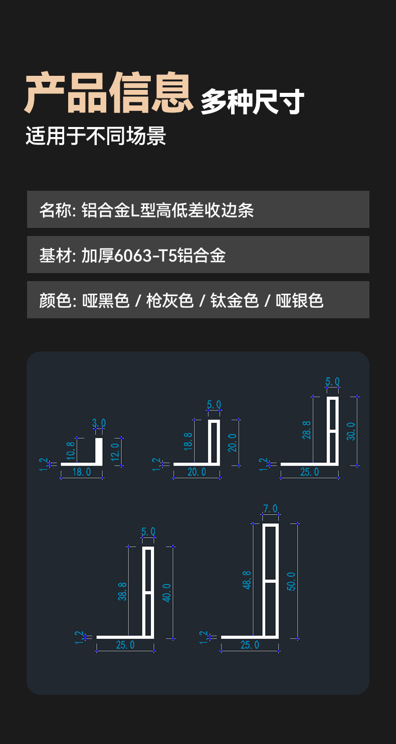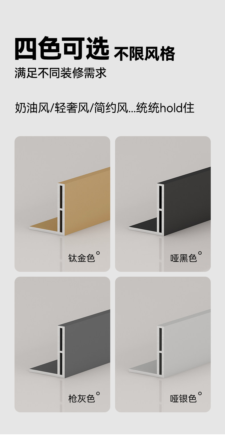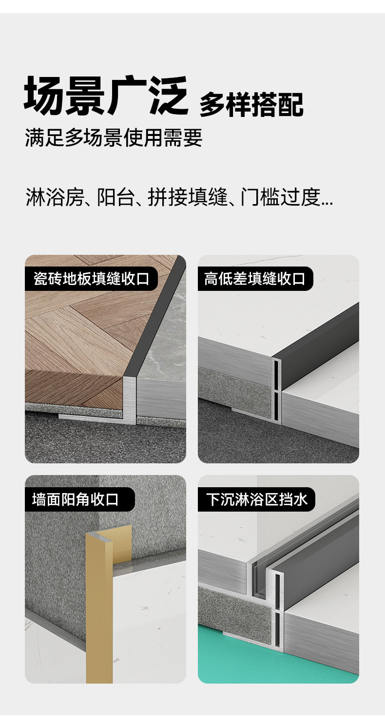 | Color Classification | Gunmetal Gray (Solid 3mm Thick) * 12 Tile Floor Edging Trim,Gunmetal Gray 5*20 High-Low Edge Trim (Thickened 1).2mm),Gunmetal Gray Reinforced 5*30 High-Low Edge Trim (Thickened 1).2mm),Gun Gray Reinforced 5*40 Sunken Edge Strip (Thickened 1.2mm),Gun Gray Reinforced 7*50 Sunken Water Retaining Strip (Thickened 1.2mm),Matt Black (Solid 3mm Thick)*12 Tile Floor Edge Strips,Matt Black 5*20 High and Low Difference Edge Strips (Thickened 1.2mm),Matt Black Reinforced 5*30 High and Low Difference Edge Strips (Thickened 1.2mm),Matt Black Reinforced 5*40 Sunken Edge Strip (Thickened 1.2mm),Matt Black Reinforced 7*50 Sunken Water Retaining Strip (Thickened 1.2mm),Titanium (Solid 3mm Thick)*12 Tile Floor Edge Strips,Titanium 5*20 High and Low Difference Edge Strips (Thickened 1.2mm),Titanium Reinforced 5*30 High and Low Difference Edge Strips (Thickened 1.2mm),Titanium Reinforced 5*40 Sunken Edge Strip (Thickened 1.2mm),Titanium Reinforced 7*50 Sunken Water Retaining Strip (Thickened 1.2mm),Matt Silver (Solid 3mm Thick)*12 Tile Floor Edge Strips,Matt Silver 5*20 High and Low Difference Edge Strips (Thickened 1.2mm),Matt Silver Reinforced 5*30 High and Low Difference Edge Strips (Thickened 1.2mm),Matt Silver Reinforced 5*40 Sunken Edge Strip (Thickened 1.2mm),Matt Silver Reinforced 7*50 Sunken Water Retaining Strip (Thickened 1.2mm),Free Samples (Contact Customer Service to Place an Order) |