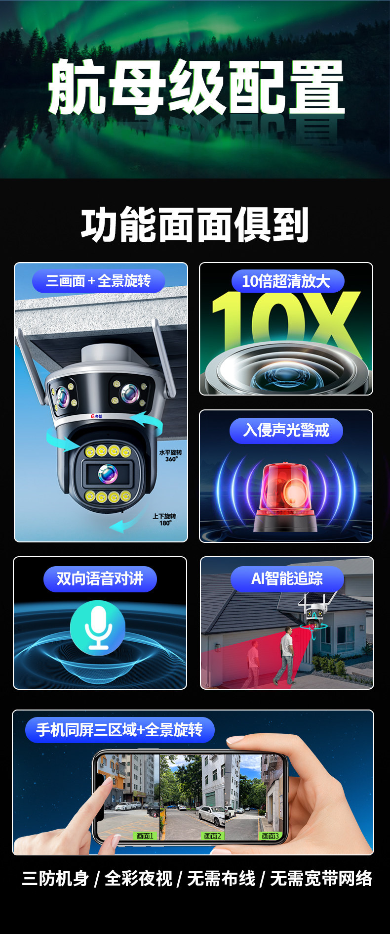 Three-Screen Wireless Camera, Outdoor Waterproof, Mobile Phone Remote Monitoring, Home Use, 360-Degree No Blind Spots, High-Definition Night Vision