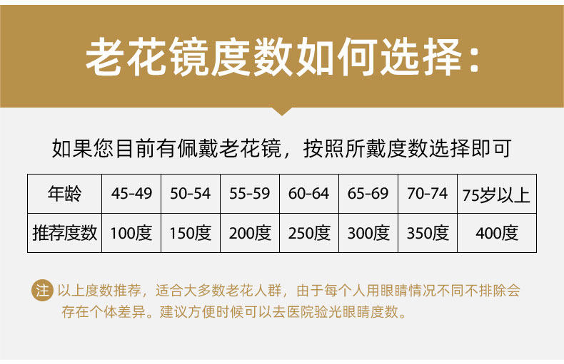 | Lens Refractive Index | +50 Degrees[Recommended for under 45 Years Old],+100 Degrees[Recommended for Ages 45-49],+150 Degrees[Recommended for Ages 50-54],+200 Degrees[Recommended for Ages 55-59],+250 Degrees[Recommended for Ages 60-64],+300 Degrees[Recommended for Ages 65-69],+350 Degrees[Recommended for Ages 70-74],+400 Degrees[Recommended for Ages 74 and Above],[Private Customization][Suitable for 0-400 Degrees,Astigmatism 0-200 Degrees] |