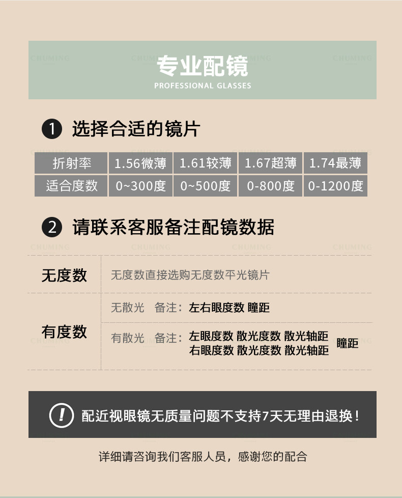 | Lens Refractive Index | Frame + 0 Degree Anti-Radiation Lenses,Frame + [Thin] 1.56 Anti-Blue Light and Anti-Radiation Lenses [Suitable for 0-300] [Remark the Degree],Frame + [Thinner] 1.61 Anti-Blue Light & Anti-Radiation Lenses [Suitable for 0-500] [Note Prescription],Frame + [Ultra-Thin] 1.67 Blue Light Blocking & Anti-Radiation Lenses [Suitable for 0-800] [Please Specify Prescription],Frame + [Thinnest] 1.74 Anti-Blue Light and Anti-Radiation Lenses [Suitable for 0-1200] [Remark Prescription],Frame + [Thin] 1.56 Anti-Radiation Lens [Suitable for 0-300] [Remark Degree],Frame + [Thinner] 1.61 Radiation-Proof Lens [Suitable for 0-500] [Remark Degree],Frame + [Ultra-Thin] 1.67 Anti-Radiation Lens [Suitable for 0-800] [Remarks],Frame + [Thinnest] 1.74 Radiation-Proof Lens [Suitable for 0-1200] [Remark Degree],Frame + Essilor Wanxin 1.56 Multi-Screen Anti-Blue Light Lenses [Suitable for 0-300] [Remark Degree],Eyeglass Frames + Essilor's Varifocal 1.60 Blue Light Blocking Lenses [Suitable for 0-500] [Please Specify Prescription],Eyeglass Frames + Essilor's Varifocal 1.67 Blue Light Blocking Lenses [Suitable for 0-800] [Please Specify Prescription],Frame + Essilor Wanxin 1.74 Multi-Screen Anti-Blue Light Lenses [Suitable for 0-1200] [Remark Degree],Frame + Essilor Wanxin 1.56 Daily Anti-Radiation Lenses [Suitable for 0-300] [Remark Degree],Frame + Essilor Wanxin 1.60 Daily Anti-Radiation Lenses [Suitable for 0-500] [Remarks on Degree],Frame + Essilor Wanxin 1.67 Daily Anti-Radiation Lenses [Suitable for 0-800] [Remark Degree],Frame + Essilor Wanxin 1.74 Daily Anti-Radiation Lenses [Suitable for 0-1200] [Remark Degree] |