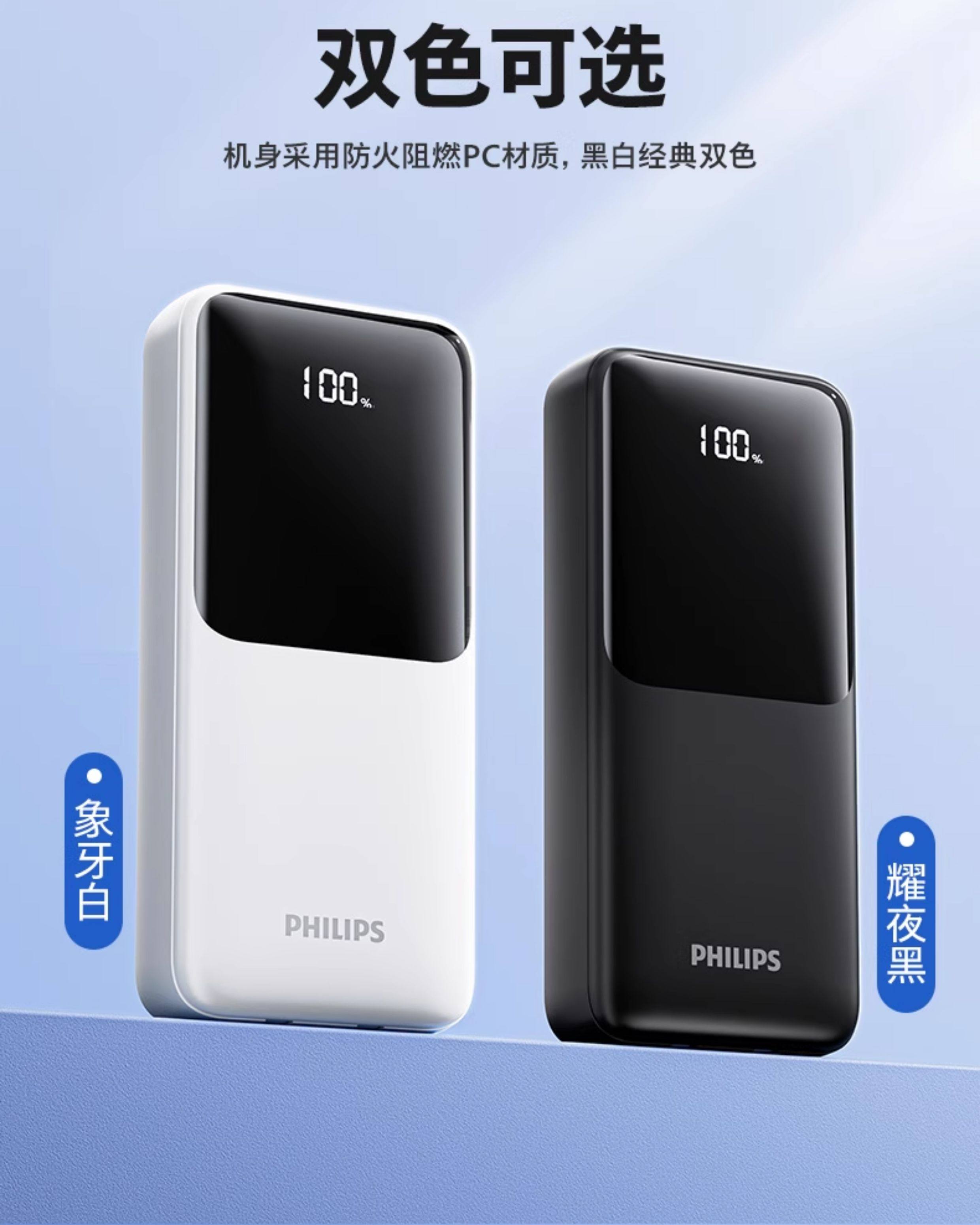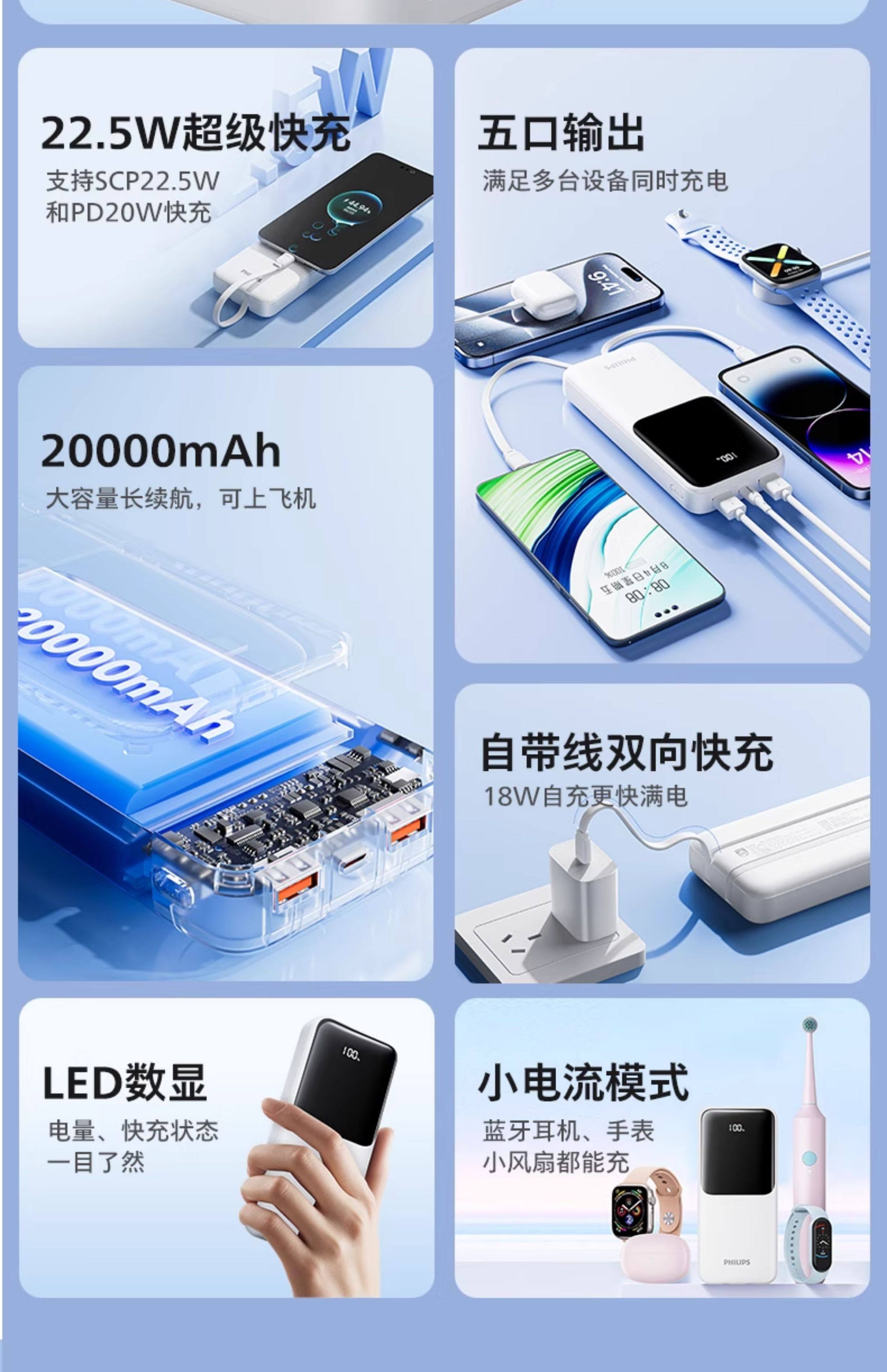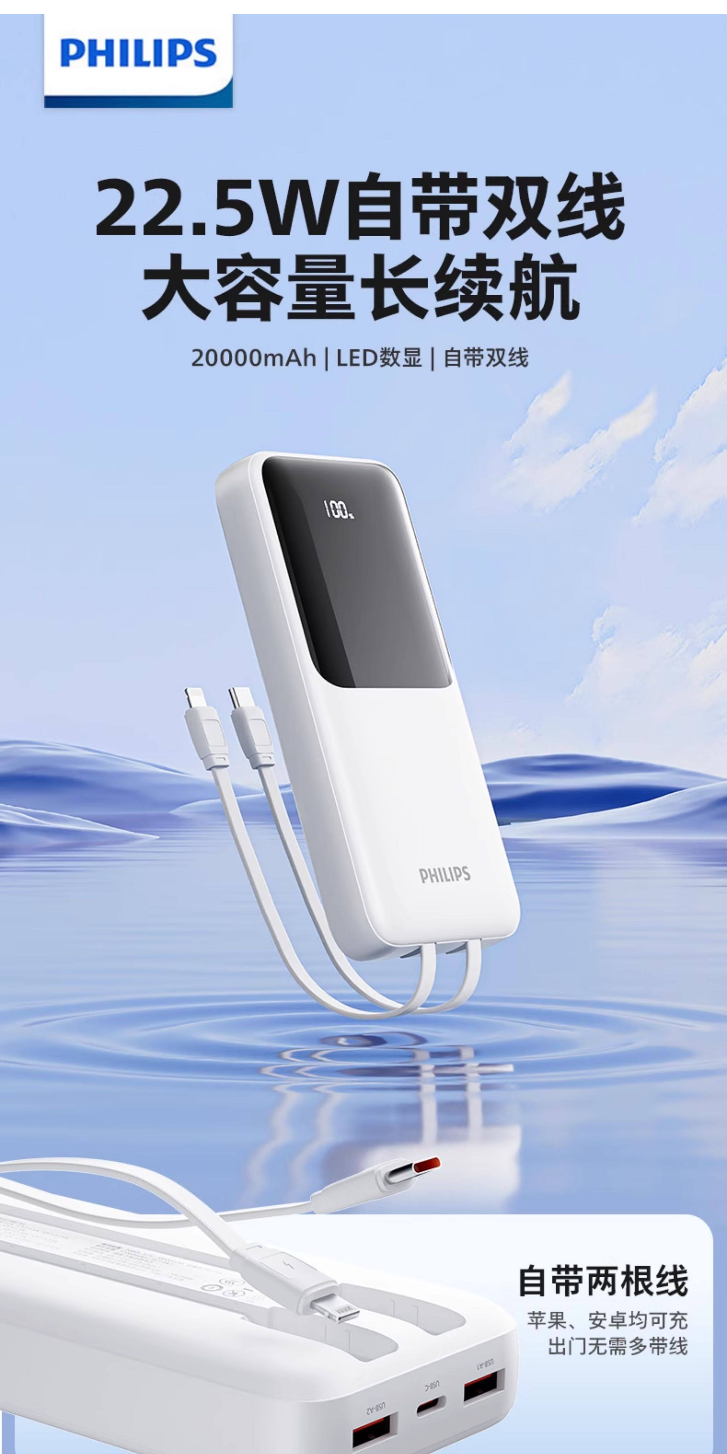 Philips Power Bank Fast Charging Large Capacity 20000 Mah Built-In Cord Mobile Power Supply Suitable for iPhone 16 Apple 15 Huawei Xiaomi Mobile Phone Compact and Portable 3C Certified Aircraft Can Be Carried
