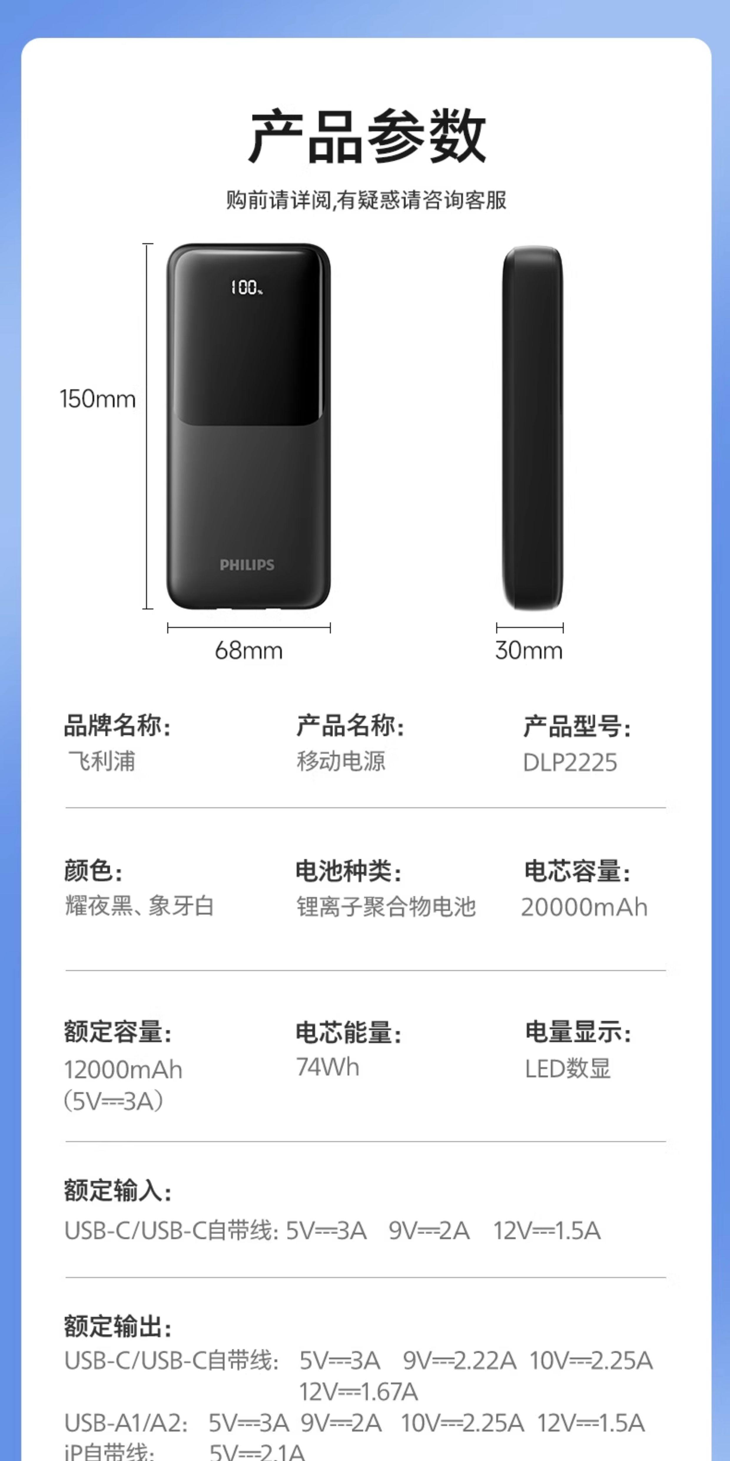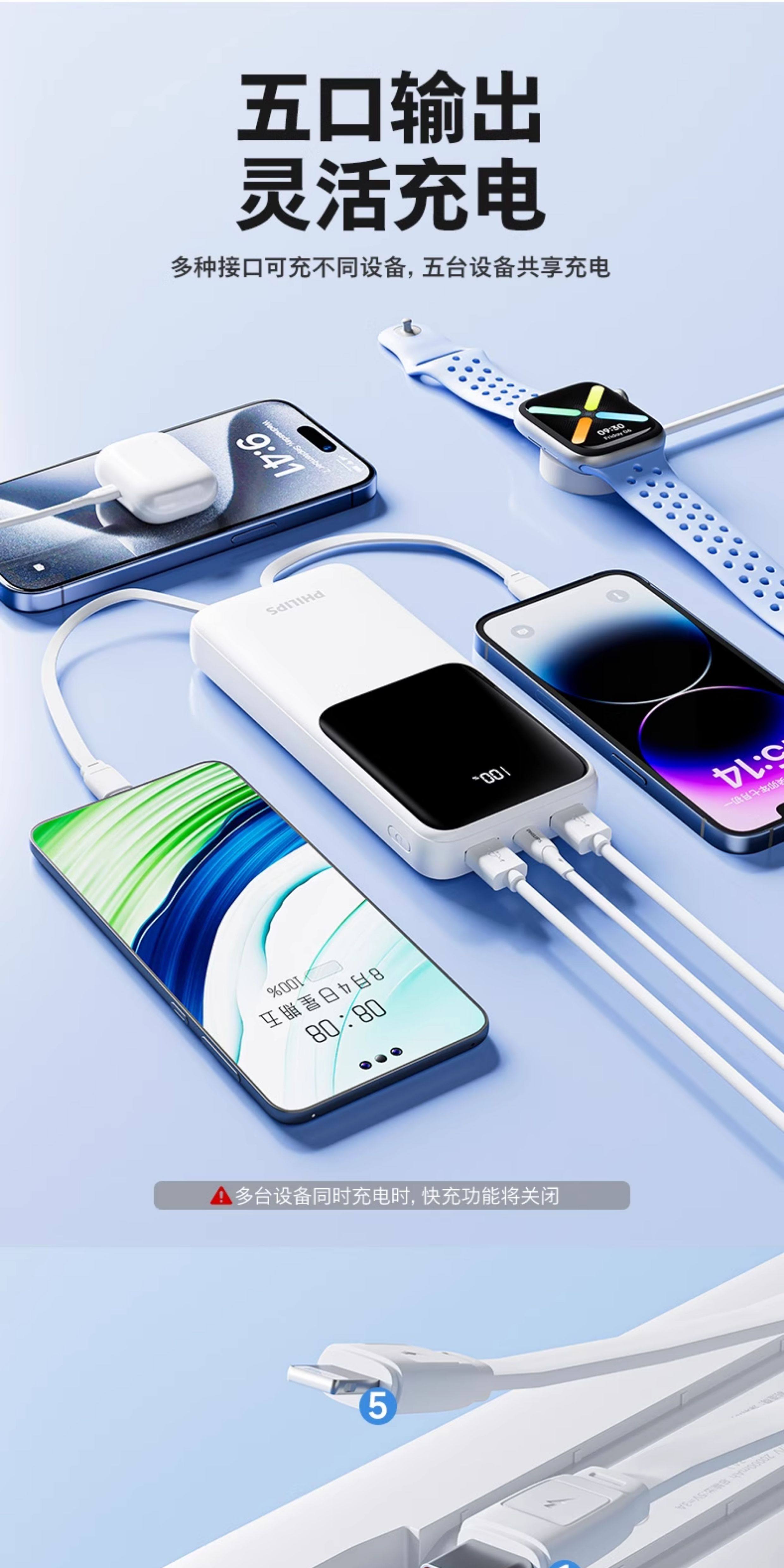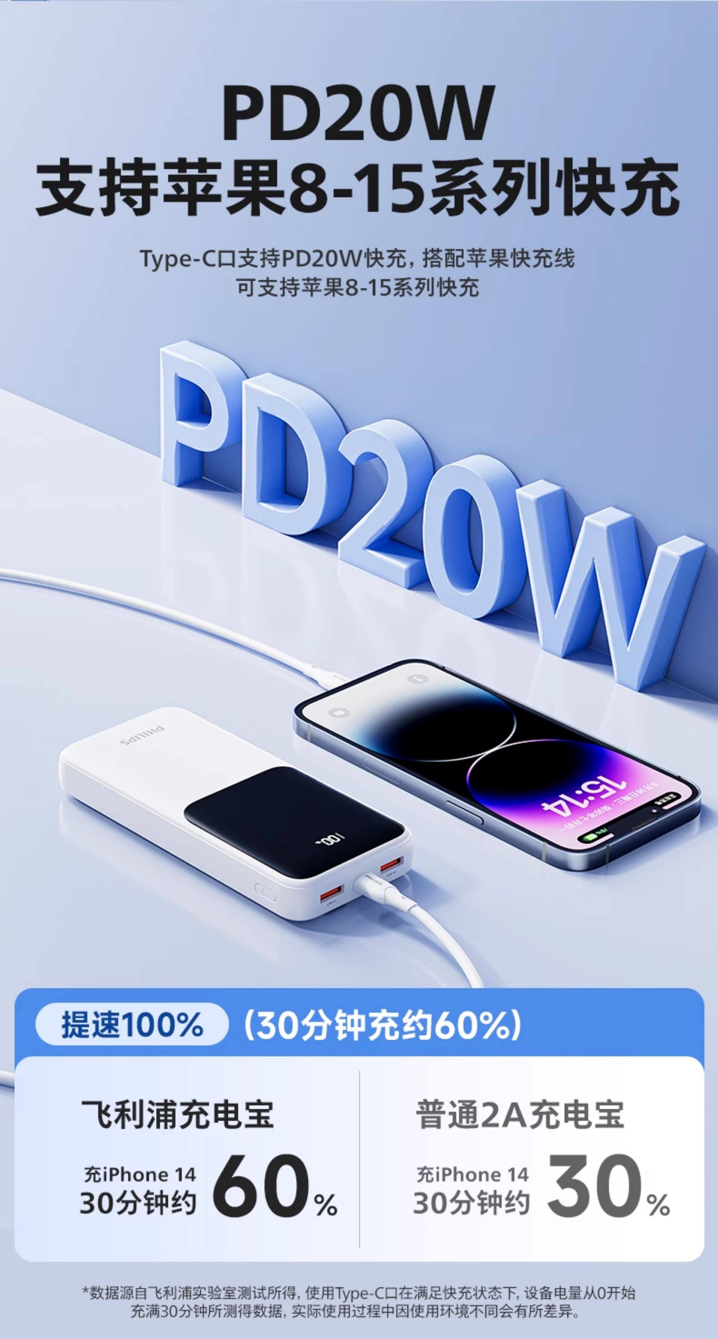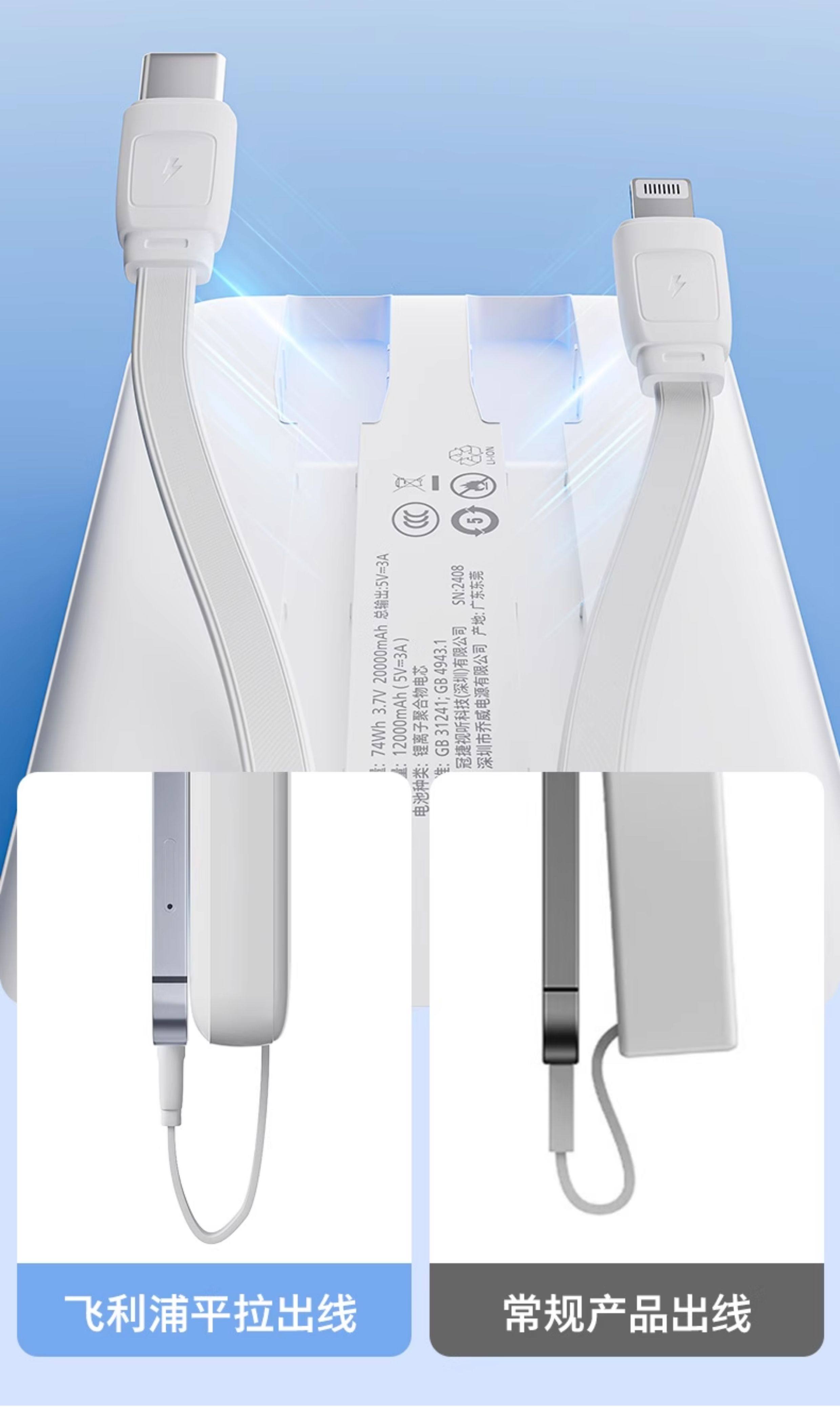Philips Power Bank Fast Charging Large Capacity 20000 Mah Built-In Cord Mobile Power Supply Suitable for iPhone 16 Apple 15 Huawei Xiaomi Mobile Phone Compact and Portable 3C Certified Aircraft Can Be Carried