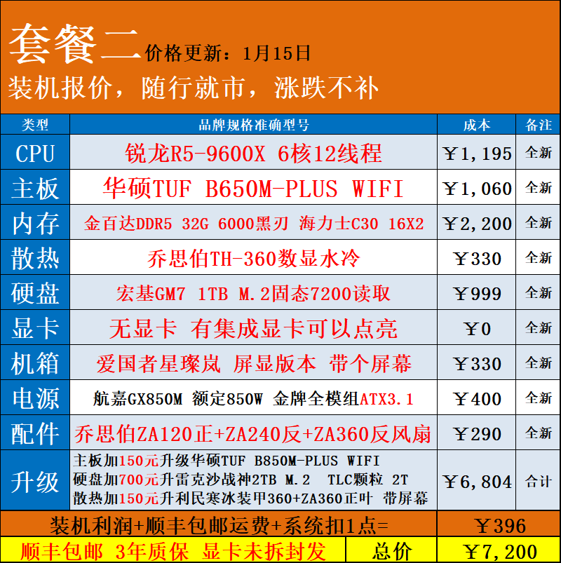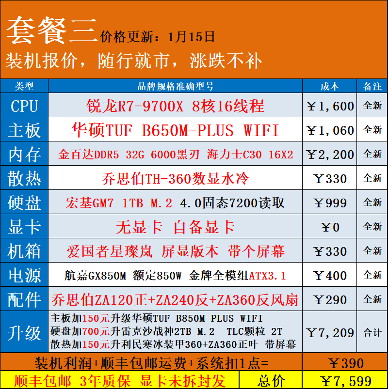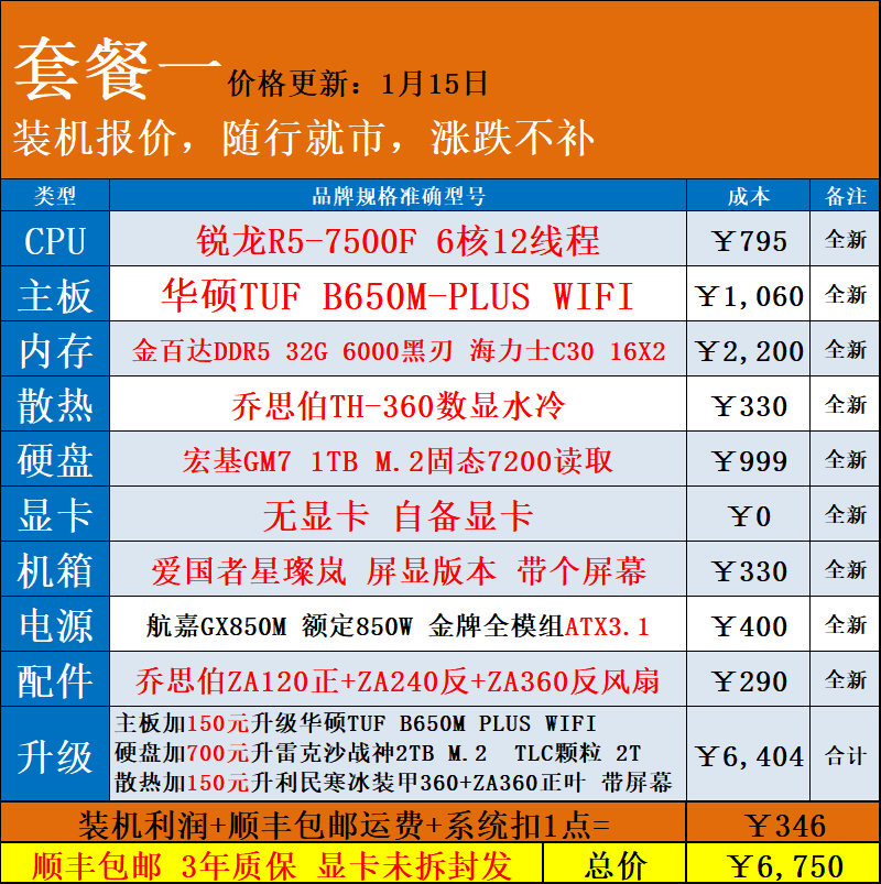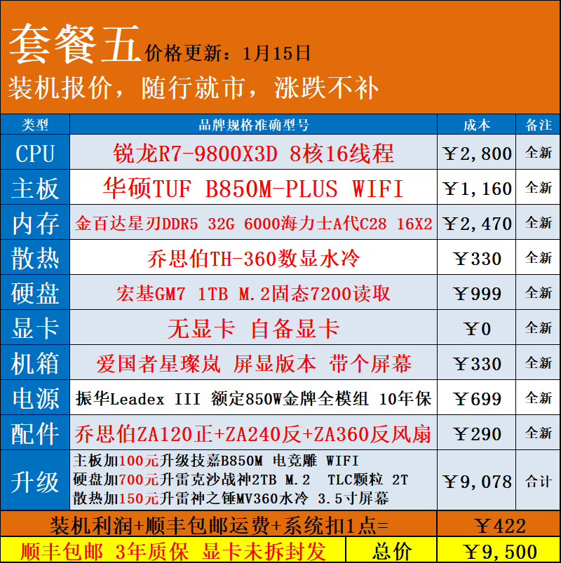 | Package Type | Package 1 R5 7500F+ Without Card,Package 2 R5 9600X+ Without Card,Package Three R7 9700X+ Without Card,Package 4 7800X3D+ Without Graphics Card,Package 5 9800X3D+ Without Graphics Card |