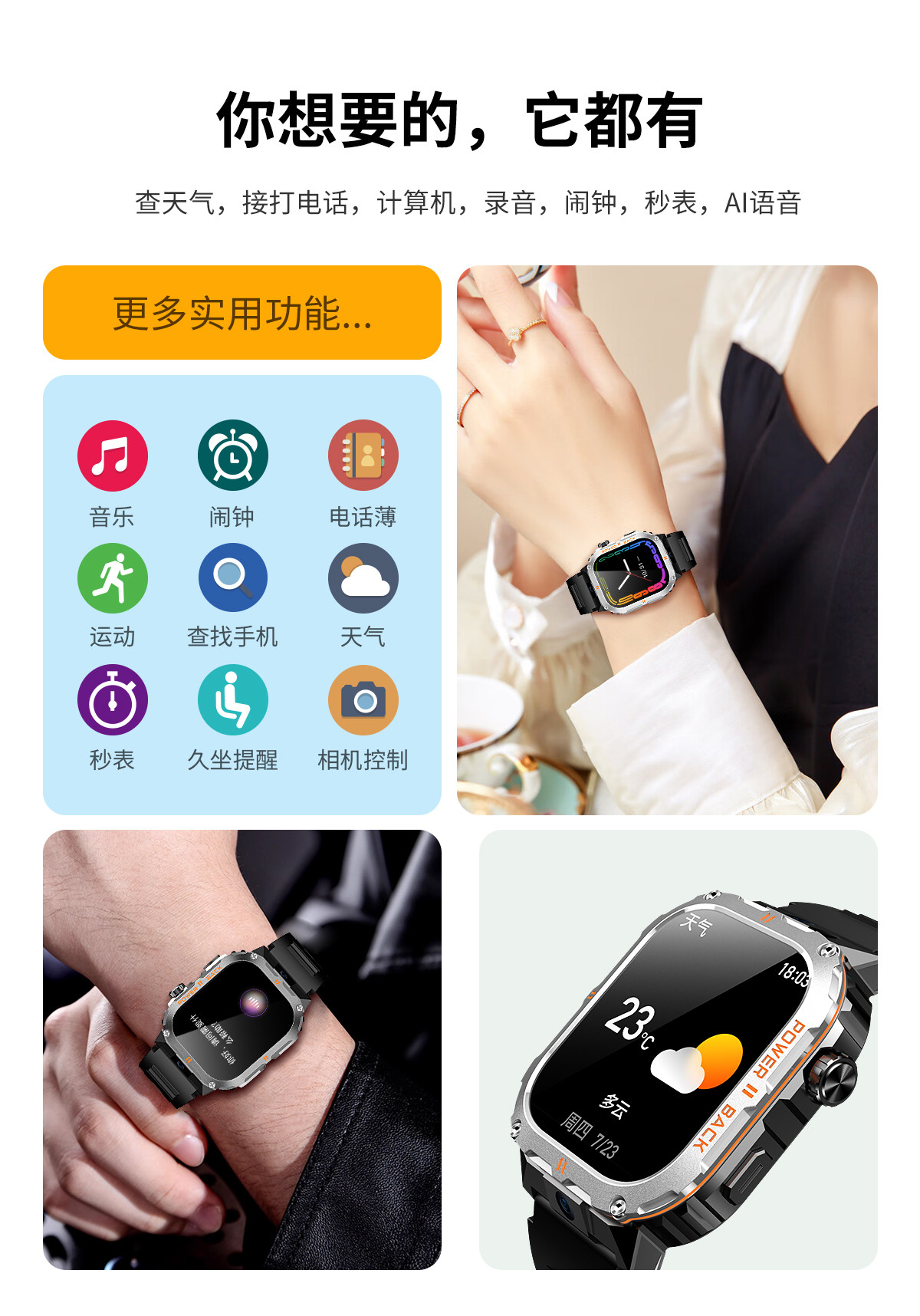 | Function | Blood Pressure Monitoring,Take a Photo,Alarm Clock,Day of the Week Display,Countdown,Audio and Video Entertainment,Take Body Temperature,Heart Rate Monitoring,Blood Oxygen Detection,App Can Be Downloaded,Social Entertainment |