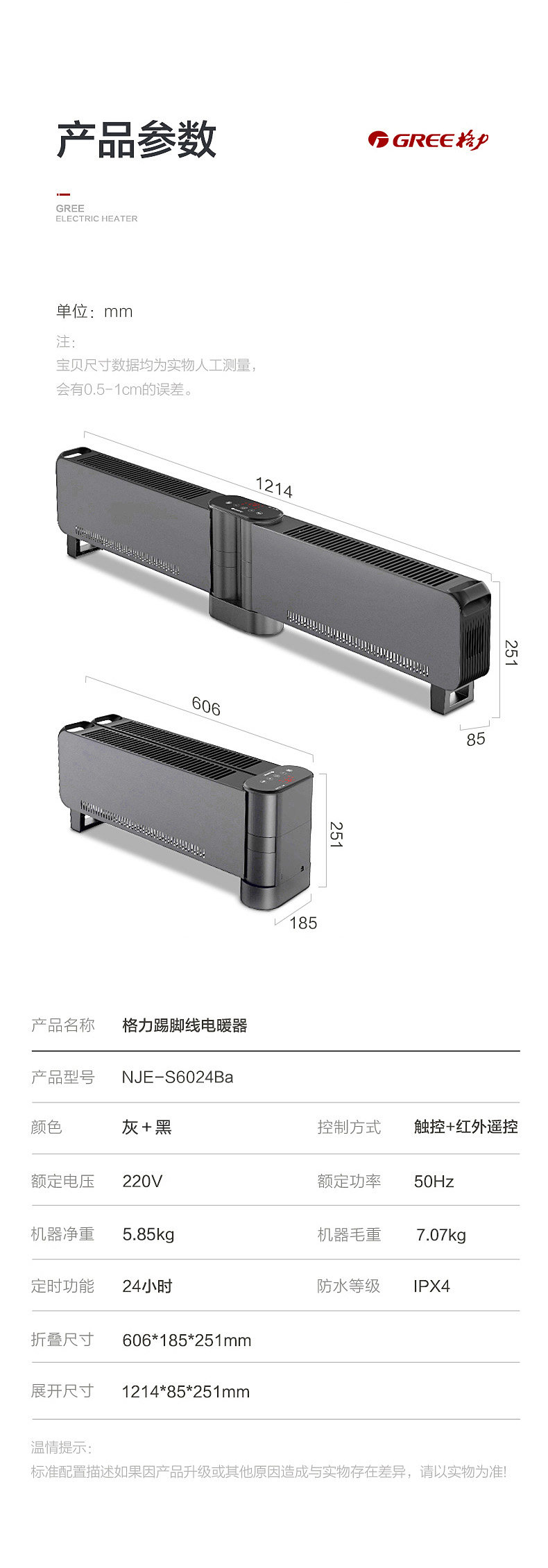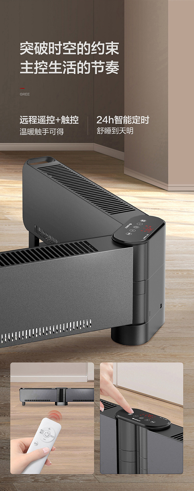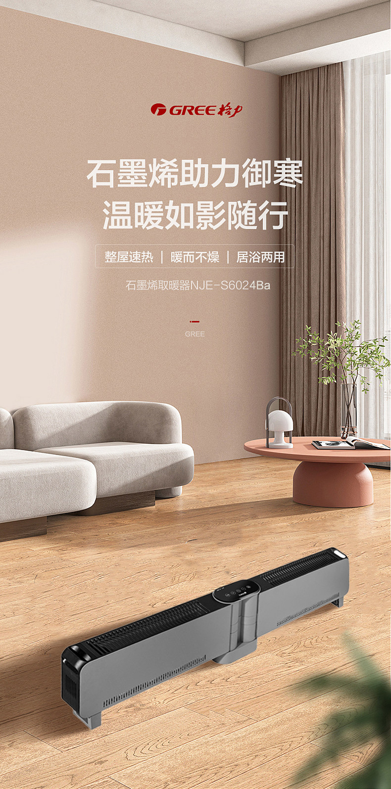 Gree Graphene Baseboard Heater for Home Use in Bedrooms, Foldable, Large Area Heating, Waterproof, Fast Heating, Energy-Saving Fan Heater