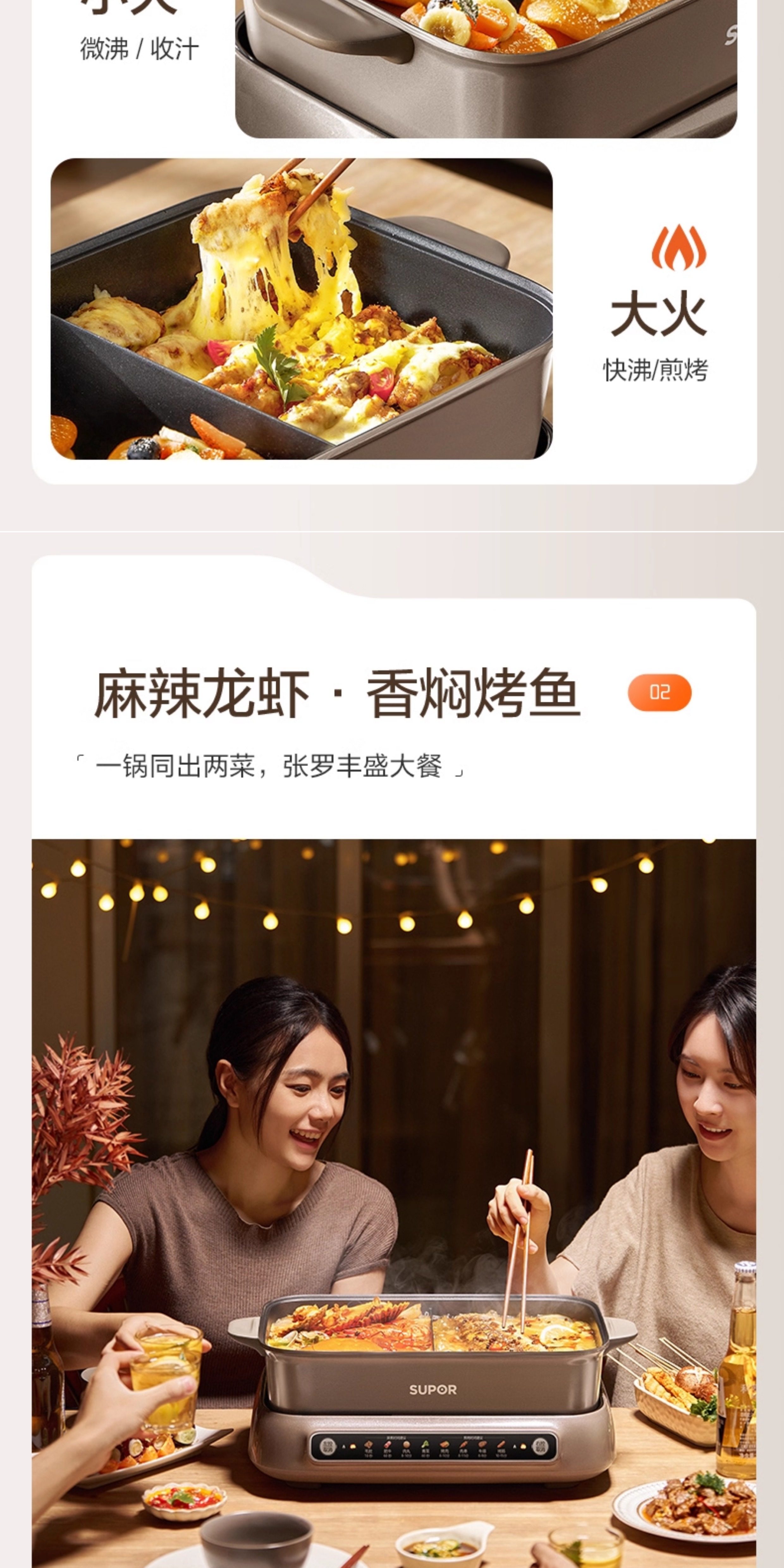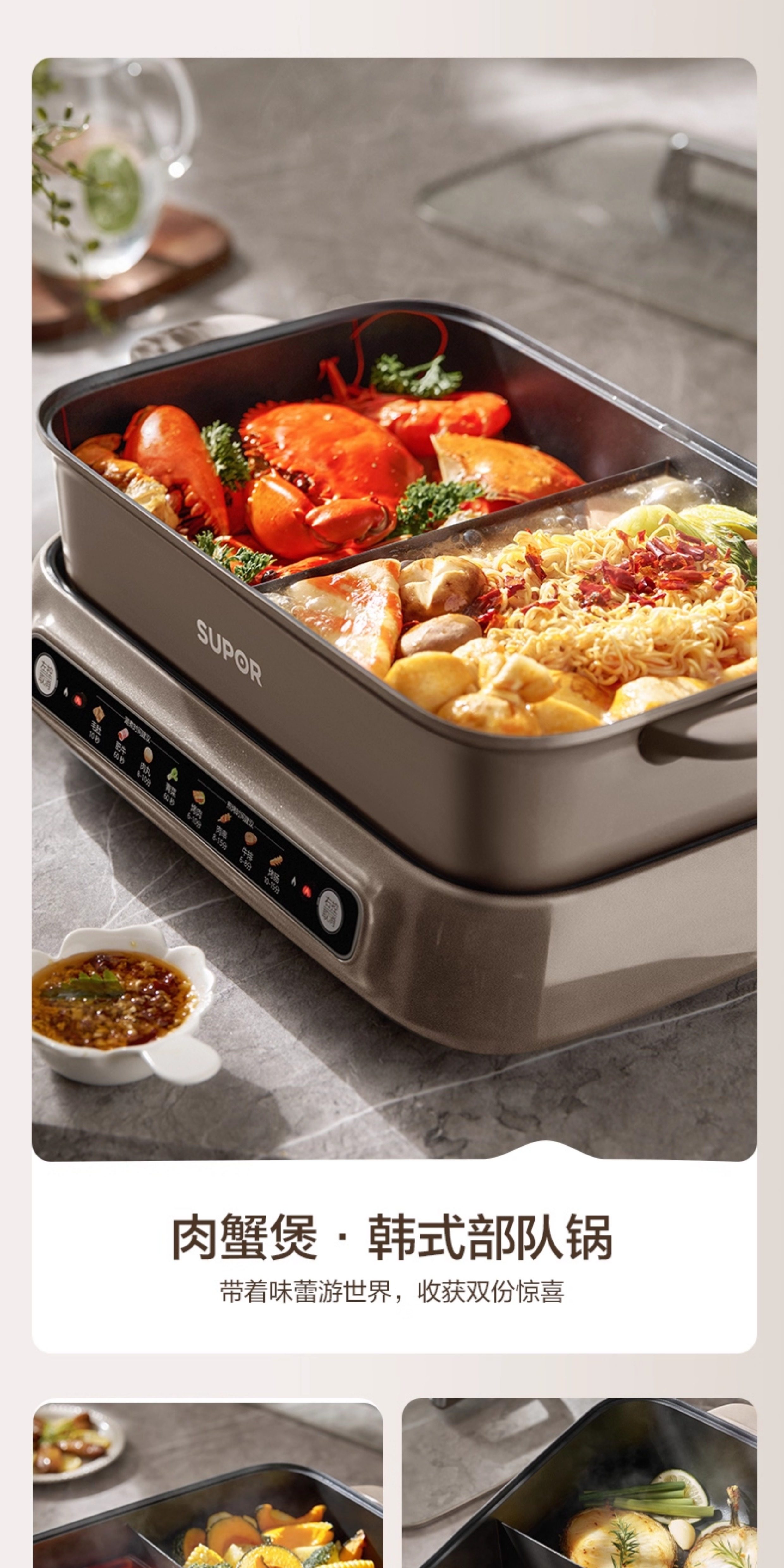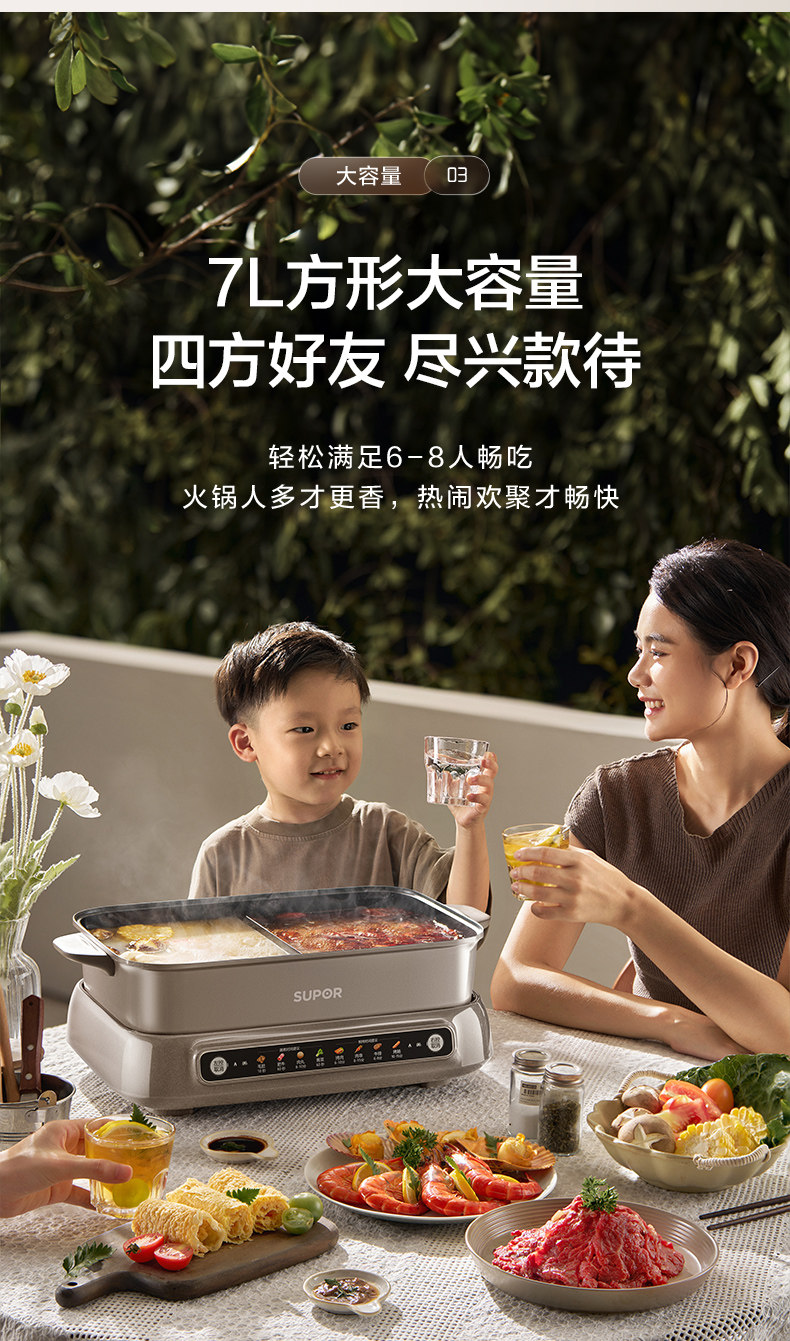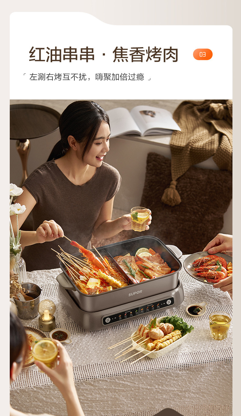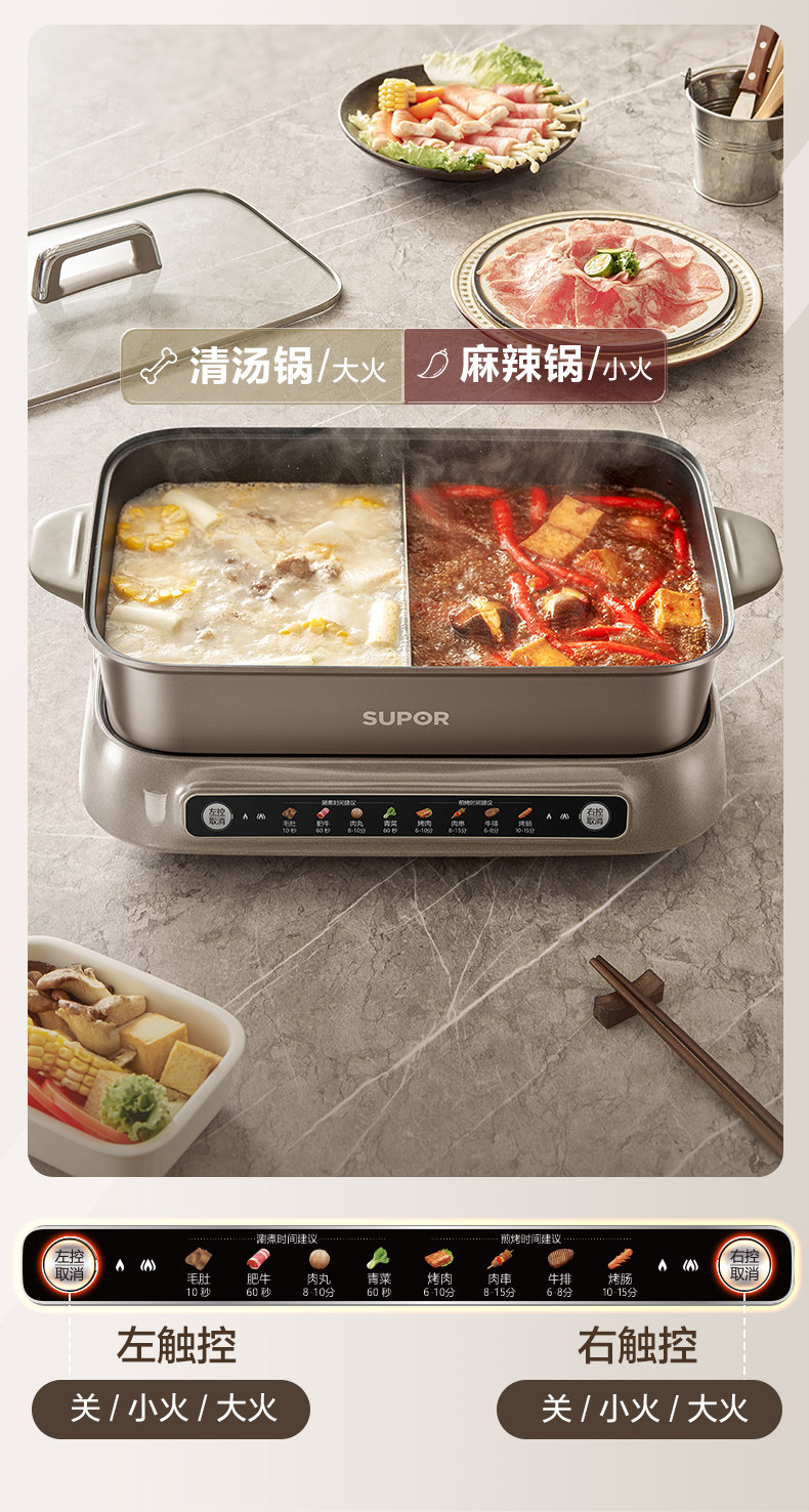 Supor Yuanyang Pot Hot Pot for Home Use, New Model 7L Large Capacity Electric Hot Pot, Multifunctional Grilling, Detachable Integrated Hot Pot