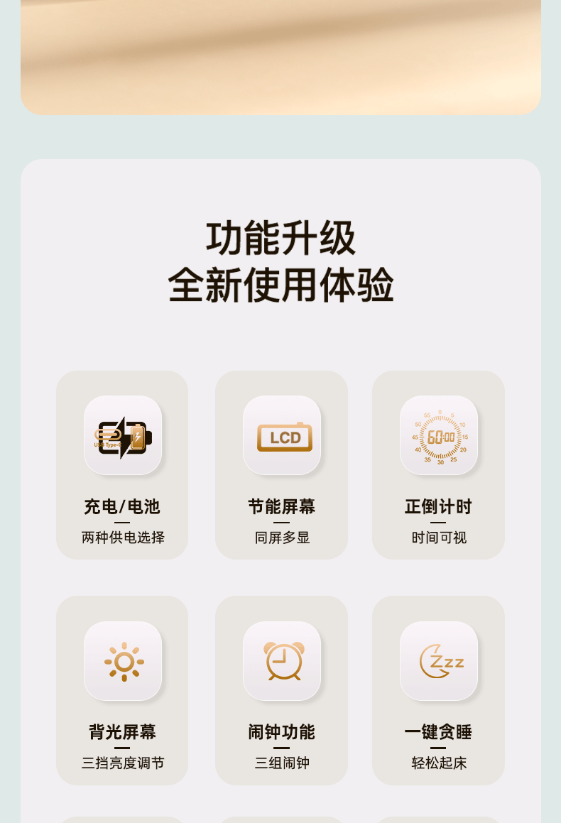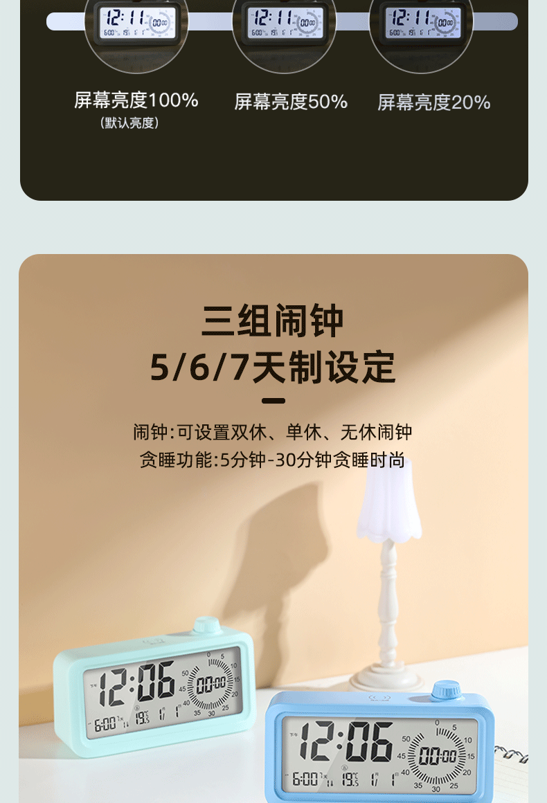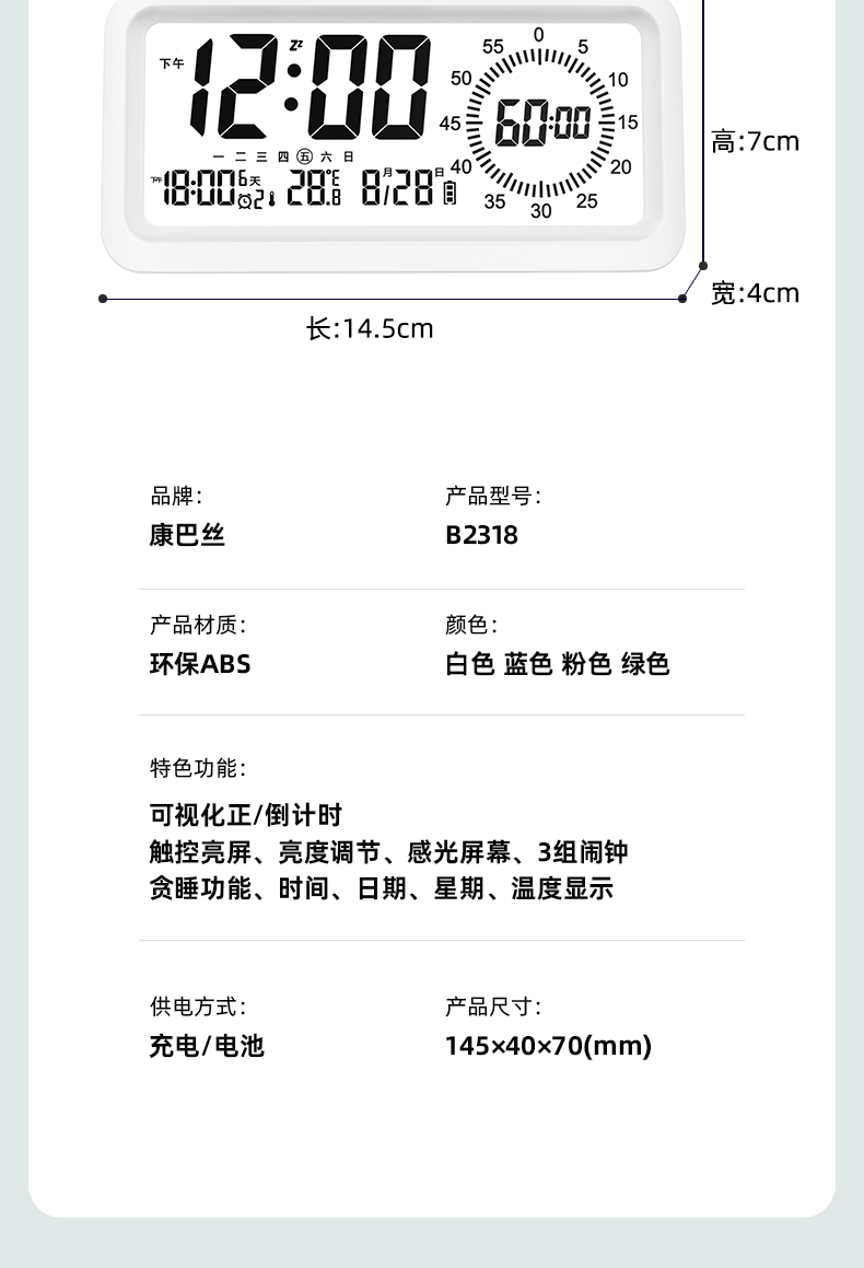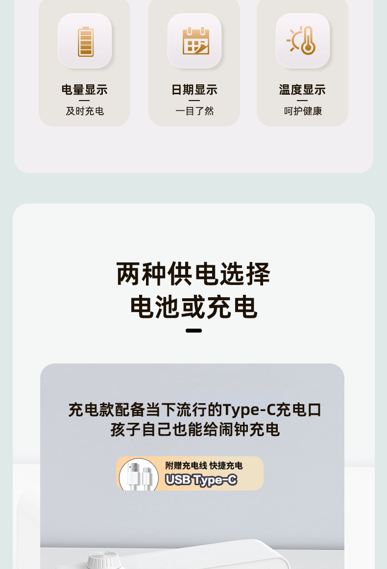 | Color Classification | [Battery Model - White] Visual Timing + 365 Long Battery Life + Intelligent Light Sensing + 3 Sets of Alarm Clocks,[Battery Model - Pink] Visual Timing + 365 Long Battery Life + Intelligent Light Sensing + 3 Sets of Alarm Clocks,[Battery Model - Blue] Visual Timing + 365 Long Battery Life + Intelligent Light Sensing + 3 Sets of Alarm Clocks,[Battery Model-Green] Visual Timing + 365 Long Battery Life + Intelligent Light Sensing + 3 Sets of Alarm Clocks,[Rechargeable Model - White] Visual Timing + 365 Long Battery Life + Intelligent Light Sensing + 3 Sets of Alarm Clocks,[Charging Model - Pink] Visual Timing + 365 Long Battery Life + Intelligent Light Sensing + 3 Sets of Alarm Clocks,[Rechargeable Model-Blue] Visual Timing + 365 Long Battery Life + Intelligent Light Sensing + 3 Sets of Alarm Clocks,[Rechargeable Model-Green] Visual Timing + 365 Long Battery Life + Intelligent Light Sensing + 3 Sets of Alarm Clocks,White [Battery] "Visual Timing, Knob Operation, Multiple Alarm Clocks",Pink [Battery] "Visual Timing, Knob Operation, Multiple Alarm Clocks",Blue [Battery] "Visual Timing, Knob Operation, Multiple Alarm Clocks",Green [Battery] "Visual Timing, Knob Operation, Multiple Alarm Clocks",White [Charging] "Visual Timing, Knob Operation, Multiple Alarm Clocks",Pink [Charging] "Visual Timing, Knob Operation, Multiple Alarm Clocks",Blue [Charging] "Visual Timing, Knob Operation, Multiple Alarm Clocks",Green [Charging] "Visual Timing, Knob Operation, Multiple Alarm Clocks" |