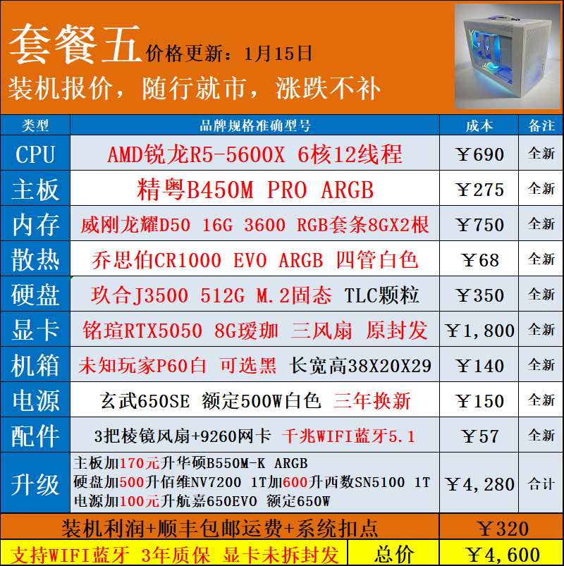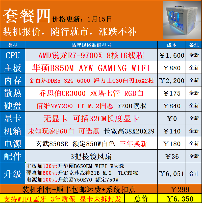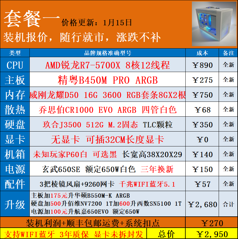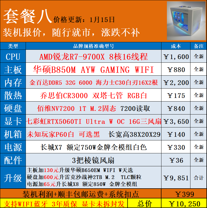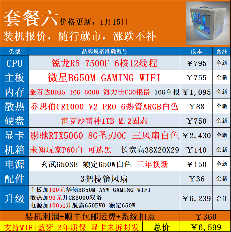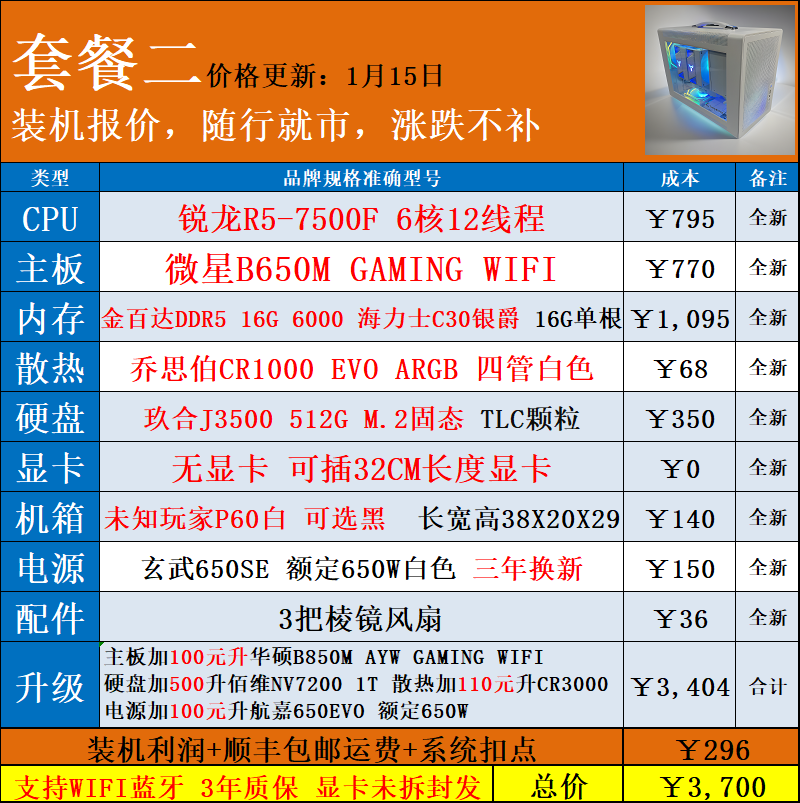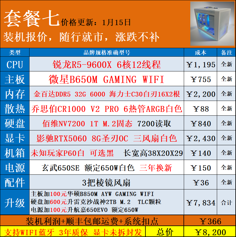 | Package Type | Package 1 R7-5700X+ Without Card,Package 2 R5-7500F+ Without Card,Package Three R5-9600X+ Without Card,Package 4 R7-9700X+ Without Card,Package 5 5600X+Rtx5050 8g,Package 6 7500F+Rtx5060 8g,Package 7 9600X+Rtx5060 8g,Package 8 9700X+5060Ti 16g |