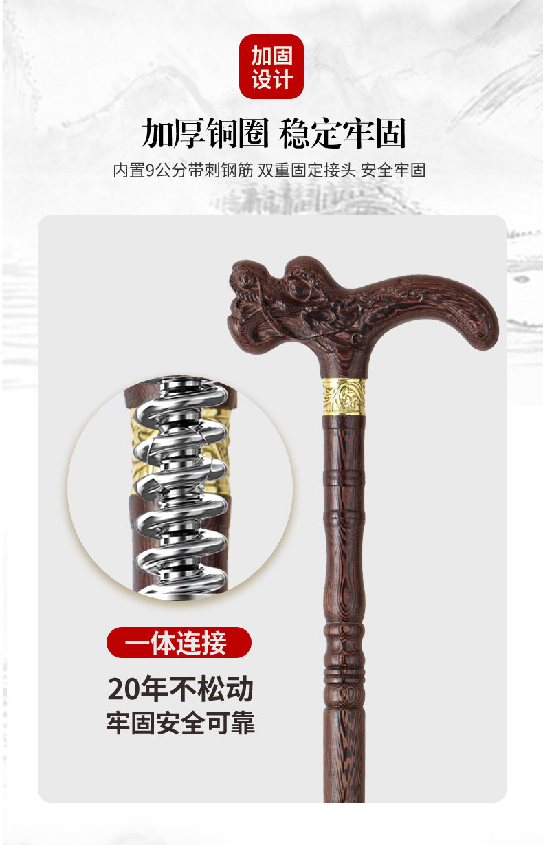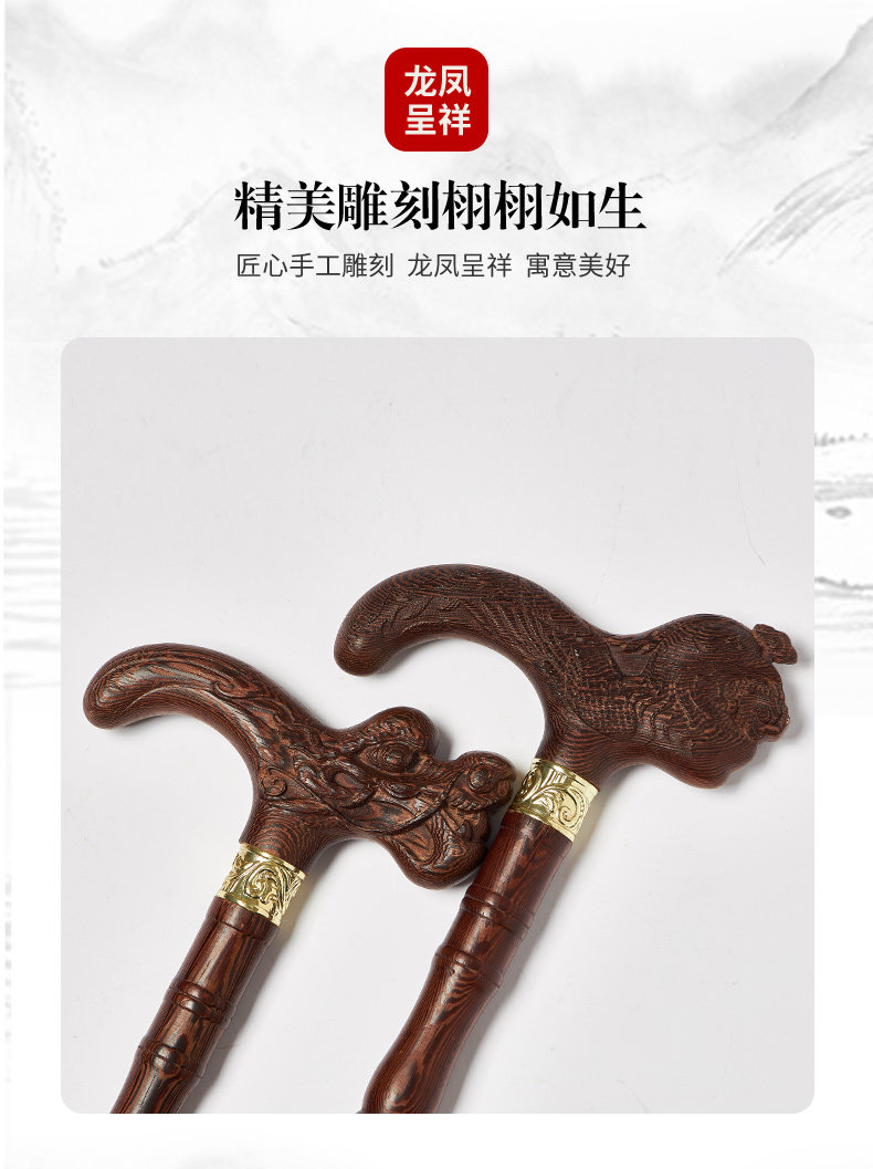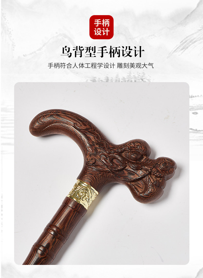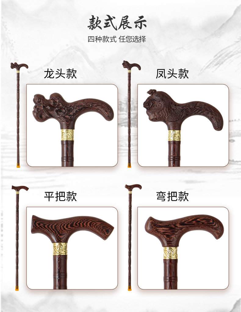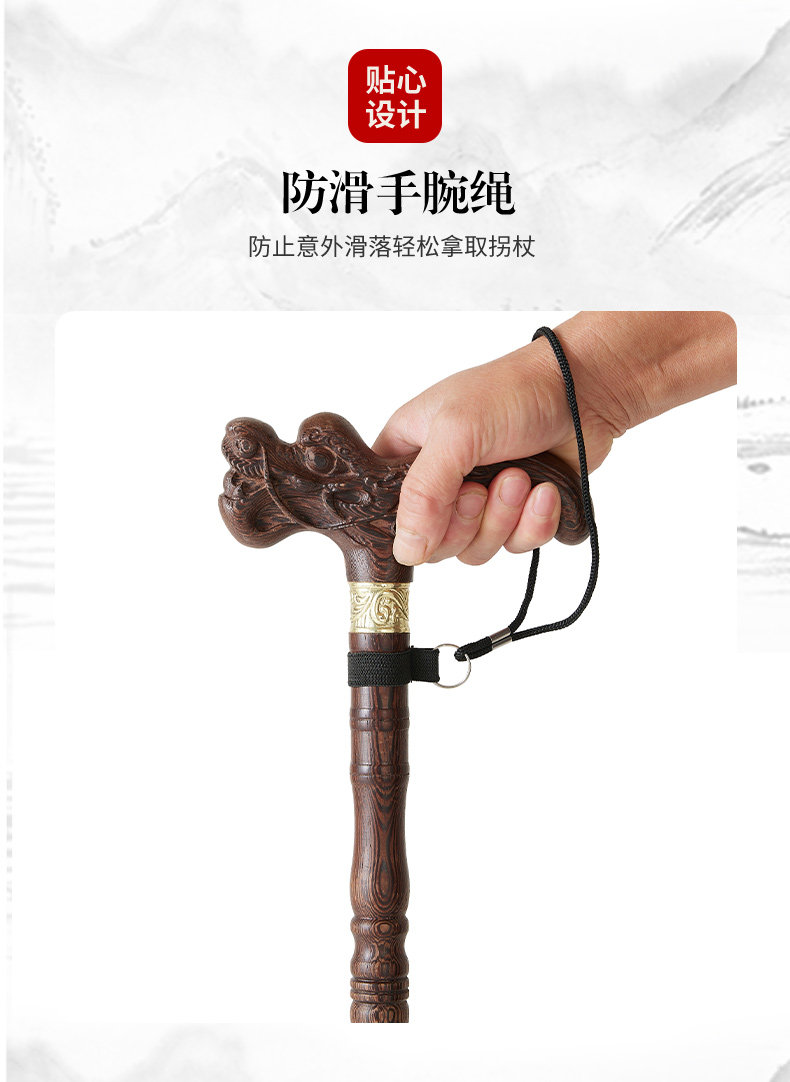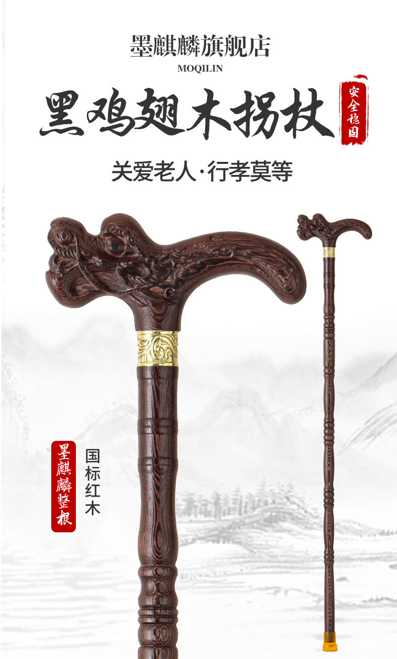 Redwood and Black Chicken-Wing Wood Walking Stick, Wooden Cane for the Elderly, Solid Wood Dragon Head, Gift for Longevity, Four-Legged Non-Slip Walking Stick