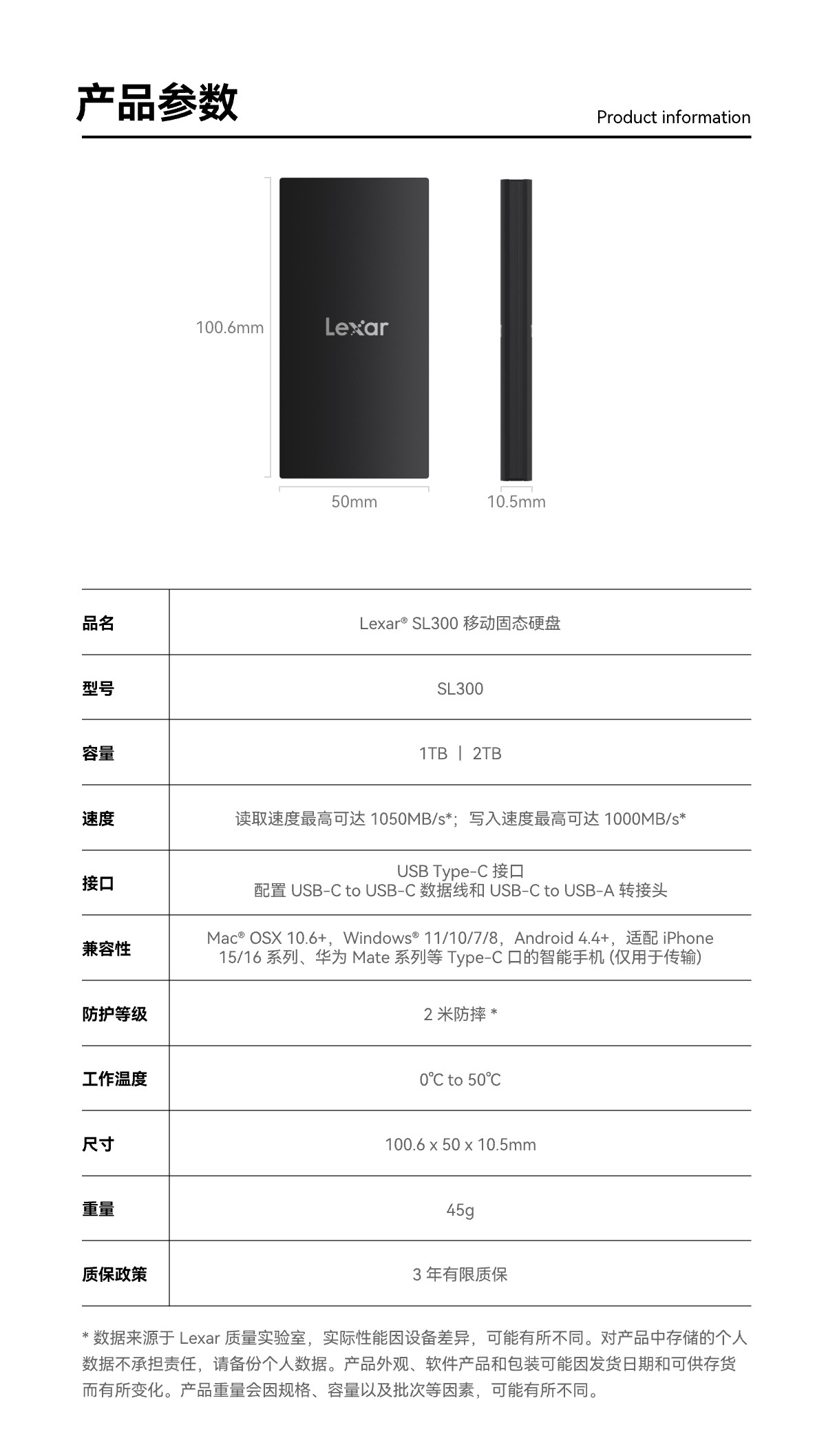 Lexar Mobile Solid State Drive 1Tb Mobile Phone Computer Notebook 2t External High-Speed Mobile Hard Drive Sl300