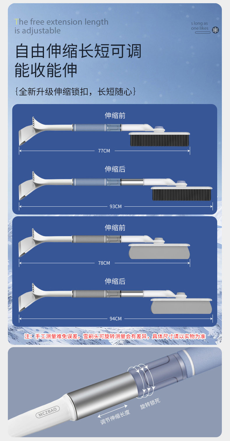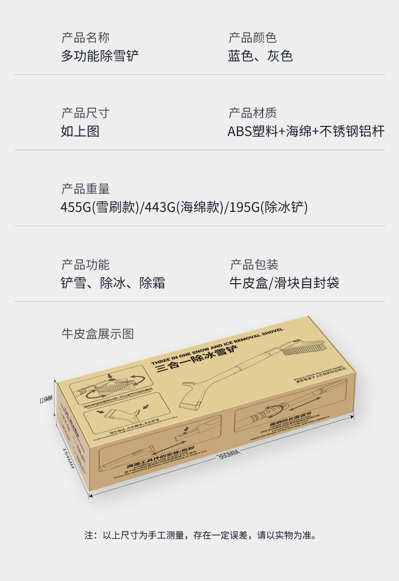 | Color Classification | 4328A Gray and White Soft Rubber Simple De-Icing Shovel (Packed in Bags),4328B Blue and White Soft Rubber Simple Ice Scraper (Bagged),4331A {Gray Black} Non-Retractable Snow Sweeping/Frost Scraping/Ice Removal (Bag),4331B {Blue & White} Non-Extendable Snow/Snow/Glass Icing Scraper (Bagged),4329A Upgraded 3-in-1 {Grayish White} Extra Thick & Long/Retractable 360° Rotating Brush Head (Bagged),4329B Upgraded 3-in-1 {Blue & White} Extra Thick & Long/Extendable 360° Rotating Brush Head (Bagged),4330A Upgraded 3-in-1 {Grayish White} Heavy-Duty Extended/Retractable Rotating Sponge Squeegee (Bagged),4330B Upgraded 3-in-1 {Blue & White} Heavy-Duty Extended/Retractable Rotating Sponge Squeegee (Bagged),4328-2D Blue and White Soft Rubber Ice Scraper (Boxed),4328-2C Gray and White Soft Rubber Simple Ice Shovel (Boxed),4331A-1 {Grey Black} Non-Retractable Snow Sweep/Frost Scraping/De-Icing (Boxed),4329-2C Upgraded 3-in-1 {Grayish White} Extra Thick & Long/Retractable 360° Rotating Brush Head (Boxed),4329-2D Upgraded 3-in-1 {Blue & White} Extra Thick & Long/Retractable 360° Rotating Brush Head (Boxed),4330-2C Upgraded 3-in-1 {Grayish White} Heavy-Duty Extended/Retractable Rotating Sponge Squeegee (Boxed),4330-2D Upgraded 3-in-1 {Blue & White} Heavy-Duty Extended/Retractable Rotating Sponge Squeegee (Boxed),4331B-1 {Blue and White} Non-Retractable Snow Sweep/Defrost/De-Ice (Boxed) |