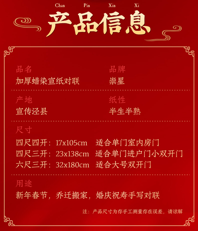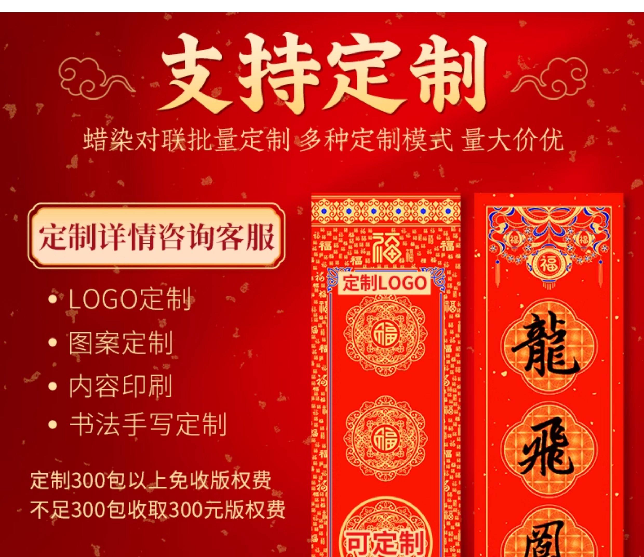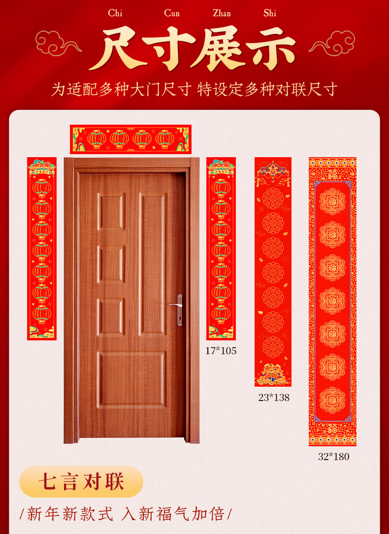 | Color Classification | Ji Qing Yu Yu (Matching 20 Blessing Characters + 1 Box of Couplet Stickers) [50 Pairs] 17*104cm Seven Characters [Suitable for Home Entrance Door/Single Door],Blessings Come into the Home (Matching 20 Blessing Characters + 1 Box of Couplet Stickers) [50 Pairs] 17*104cm Seven Characters [Suitable for Home Entrance Doors/Single Doors],Panlong Nafu (Matching 20 Blessing Characters + 1 Box of Couplet Stickers) [50 Pairs] 17*104cm Seven Characters [Suitable for Home Entrance Door/Single Door],Lion Comes to Run (Matching 20 Blessing Characters + 1 Box of Couplet Stickers) [50 Pairs] 17*104cm Seven Characters [Suitable for Home Entrance Door/Single Door],Fu Shou Tong Chun (Matching 20 Blessing Characters + 1 Box of Couplet Stickers) [50 Pairs] 17*104cm Seven Characters [Suitable for Home Entrance Door/Single Door],Clusters of Flowers (Matching 20 Blessing Characters + 1 Box of Couplet Stickers) [50 Pairs] 17*104cm Seven Words [Suitable for Home Entrance Doors/Single Doors],Phoenix Dance and Dragon Pan (Matching 20 Blessing Characters + 1 Box of Couplet Stickers) [50 Pairs] 17*104cm Seven Words [Suitable for Home Entrance Door/Single Door],Golden Dragon Sends Blessings (20 Random Blessing Cards + 1 Box of Couplet Stickers) [50 Pairs] 17*104cm Seven Words [Suitable for Home Entrance Doors/Single Doors],Fu Shou Tong Chun (Matching 20 Blessing Characters + 1 Box of Couplet Stickers) [30 Pairs] 23*138cm Seven Words [Suitable for Large Entrance Doors/Courtyard Doors],Ji Qing Yu Yu (Matching 20 Blessing Characters + 1 Box of Couplet Stickers) [30 Pairs] 23*138cm Seven Characters [Suitable for Large Entrance Doors/Courtyard Doors],Blessings Come into the Home (Matching 20 Blessing Characters + 1 Box of Couplet Stickers) [30 Pairs] 23*138cm Seven Characters [Suitable for Large Entrance Doors/Courtyard Doors],Lion Comes to Run (Matching 20 Blessing Characters + 1 Box of Couplet Stickers) [30 Pairs] 23*138cm Seven Characters [Suitable for Large Entrance Doors/Courtyard Doors],Clusters of Flowers (Matching 20 Blessing Characters + 1 Box of Couplet Stickers) [30 Pairs] 23*138cm Seven Characters [Suitable for Large Entrance Doors/Courtyard Doors],Panlong Nafu (Matching 20 Blessing Characters + 1 Box of Couplet Stickers) [30 Pairs] 23*138cm Seven Characters [Suitable for Large Entrance Doors/Courtyard Doors],Phoenix Dance and Dragon Pan (Matching 20 Blessing Characters + 1 Box of Couplet Stickers) [30 Pairs] 23*138cm Seven Words [Suitable for Large Entrance Doors/Courtyard Doors],Golden Dragon Sends Blessings (20 Random Blessing Cards + 1 Box of Couplet Stickers) [30 Pairs] 23*138cm Seven Words [Suitable for Large Entrance Doors/Courtyard Doors],Blessings Come into the Home (Matching 20 Blessing Characters + 1 Box of Couplet Stickers) [15 Pairs] 32*180cm Seven Characters [Suitable for Villa Double Doors/Courtyard Doors],Fu Shou Tong Chun (Matching 20 Blessing Characters + 1 Box of Couplet Stickers) [15 Pairs] 32*180cm Seven Characters [Suitable for Villa Double Doors/Courtyard Doors],Panlong Nafu (Matching 20 Blessing Characters + 1 Box of Couplet Stickers) [15 Pairs] 32*180cm Seven Characters [Suitable for Villa Double Doors/Courtyard Doors],Clusters of Flowers (Matching 20 Blessing Characters + 1 Box of Couplet Stickers) [15 Pairs] 32*180cm Seven Characters [Suitable for Villa Double Doors/Courtyard Doors],Ji Qing Yu Yu (Matching 20 Blessing Characters + 1 Box of Couplet Stickers) [15 Pairs] 32*180cm Seven Characters [Suitable for Villa Double Doors/Courtyard Doors] |