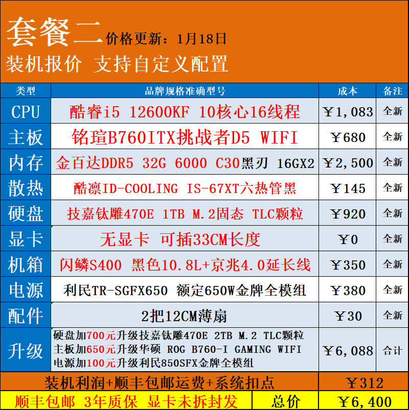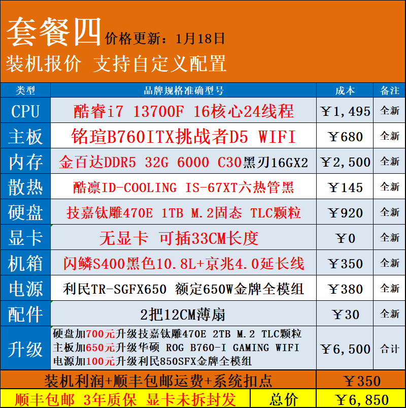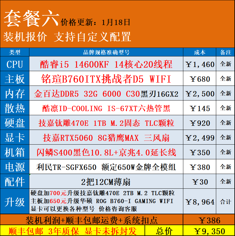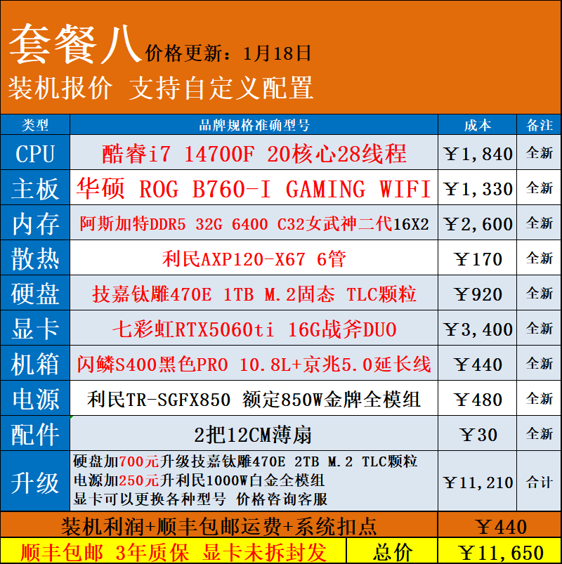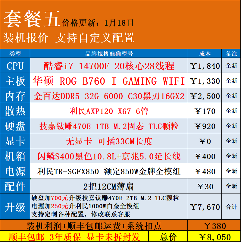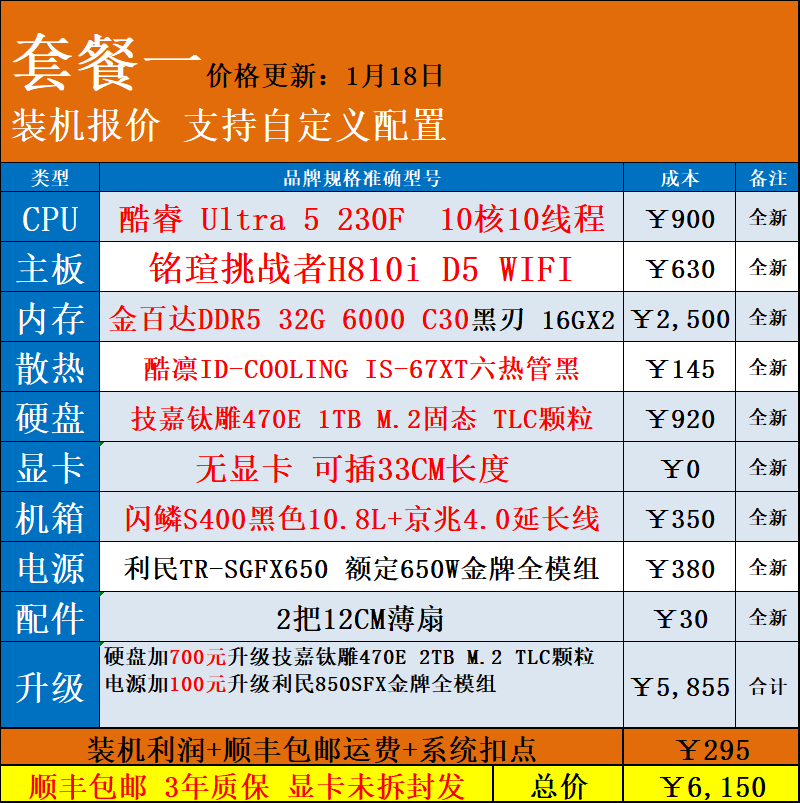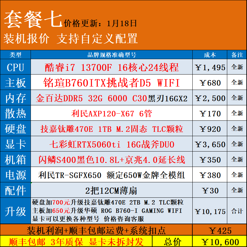 | Package Type | Package 1 U5 230F+ Without Card,Package 2 I5 12600Kf+ No Card,Package Three I5 14600Kf+ No Card,Package 4 I7 13700F+ Without Card,Package 5 I7 14700F+ Without Card,Package 6 I5 14600Kf+Rtx5060 8g,Package 7 I7 13700F+Rtx5060Ti 16g,Package Eight I7 14700F+Rtx5060Ti 16g |