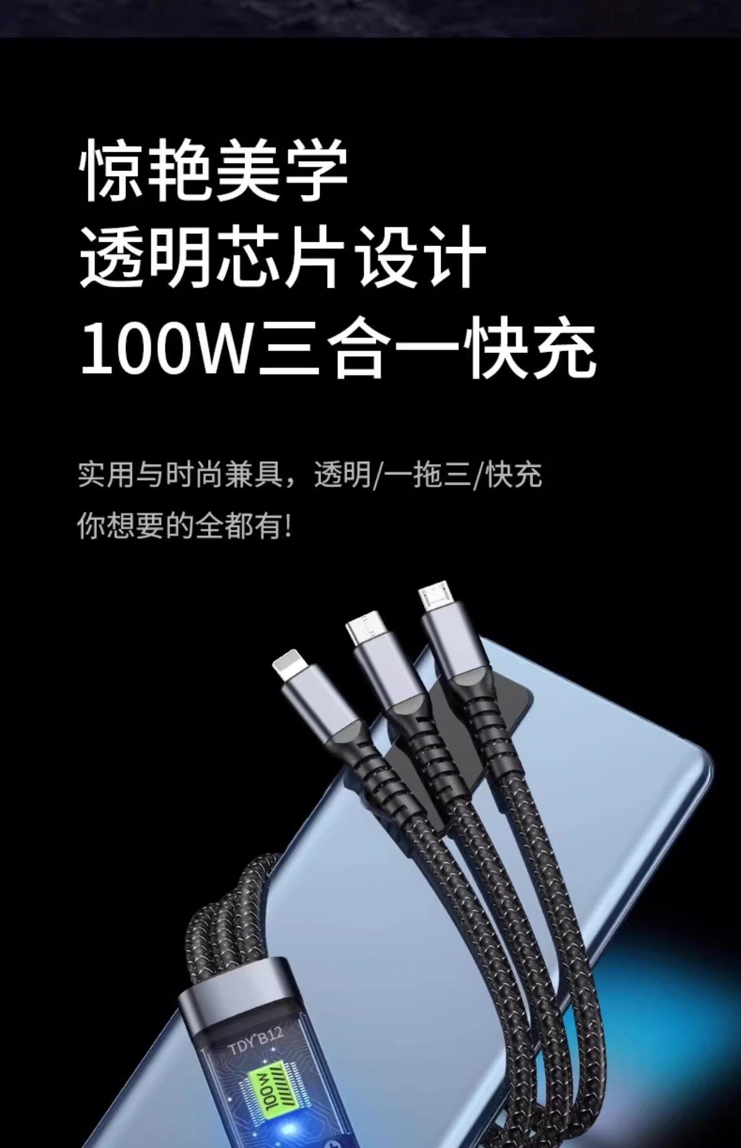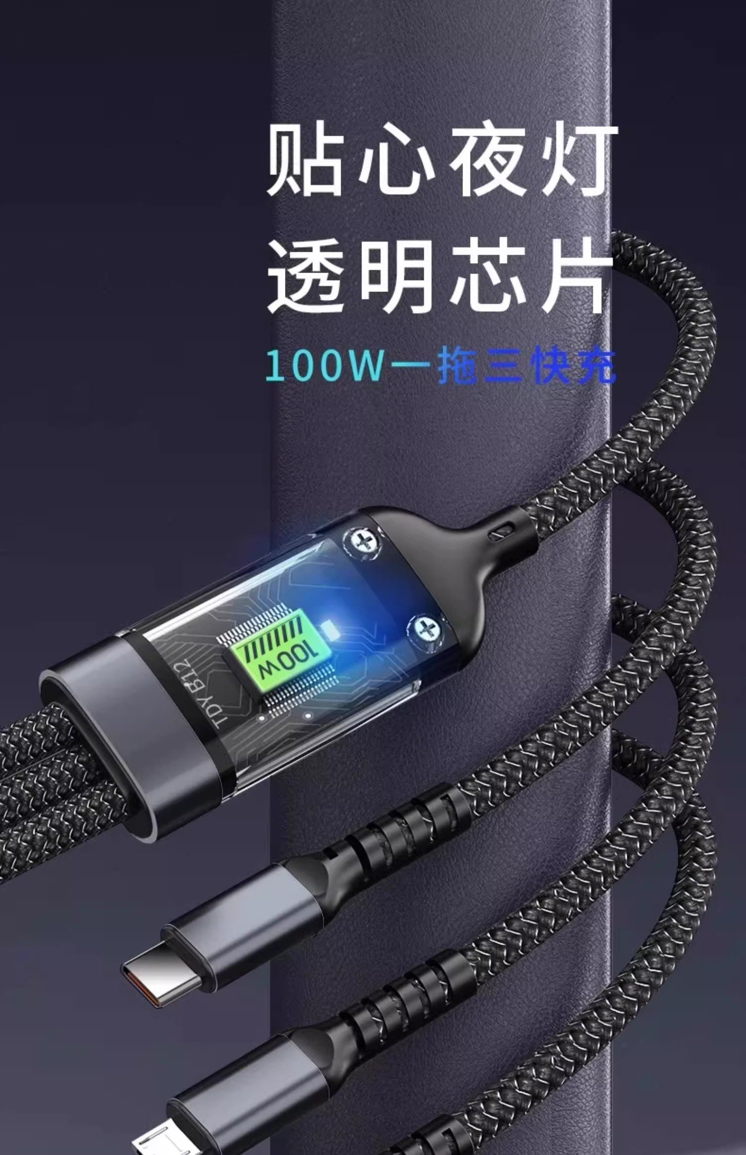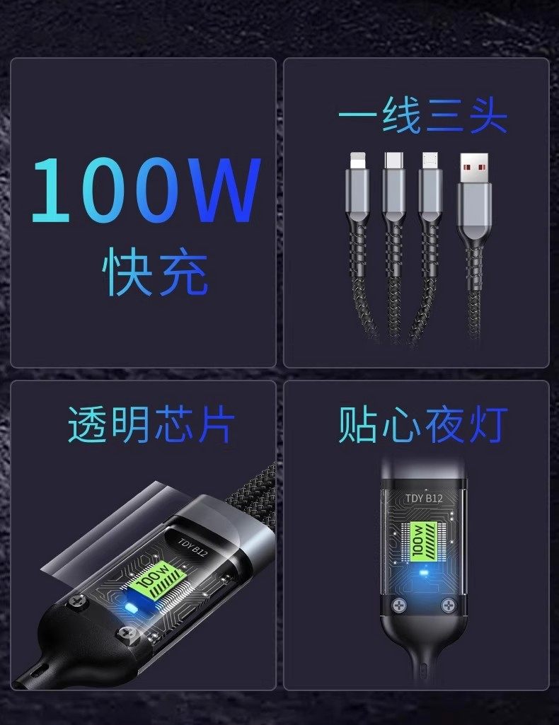 120W Three-In-One Super Fast Charging Data Cable, One-To-Three Braided Cable, Suitable for Apple, Huawei, Oppo, Xiaomi, Android, Vivo, Transparent Smart Chip, Thoughtful Night Light, USB Multifunctional