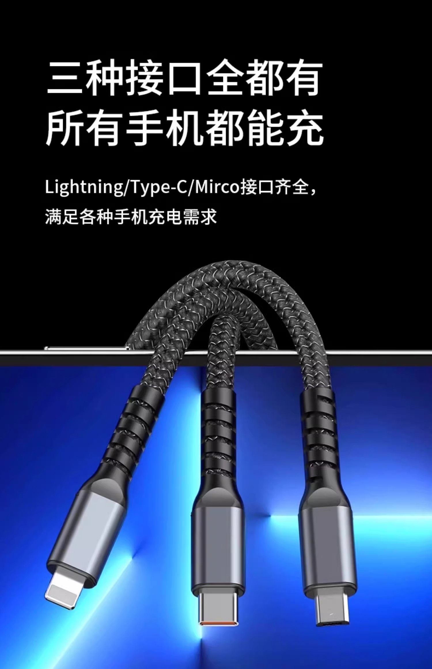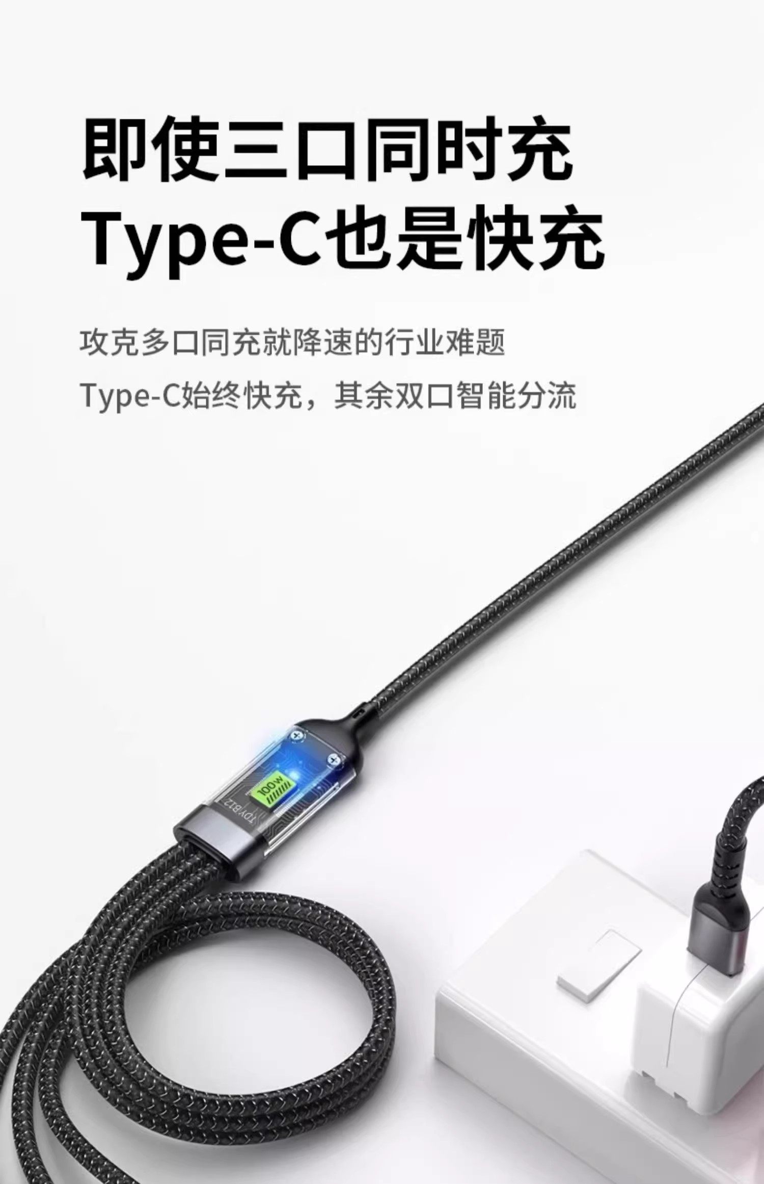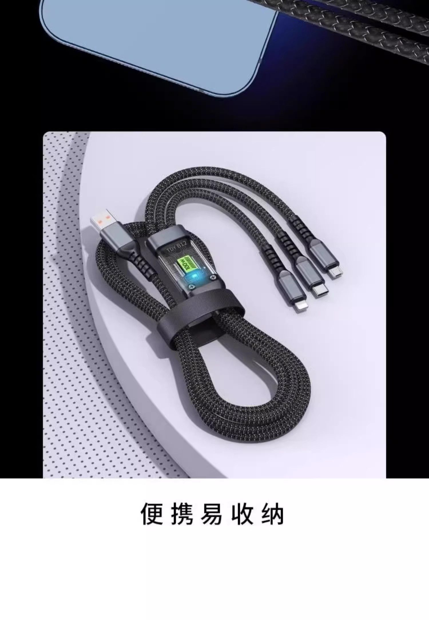120W Three-In-One Super Fast Charging Data Cable, One-To-Three Braided Cable, Suitable for Apple, Huawei, Oppo, Xiaomi, Android, Vivo, Transparent Smart Chip, Thoughtful Night Light, USB Multifunctional