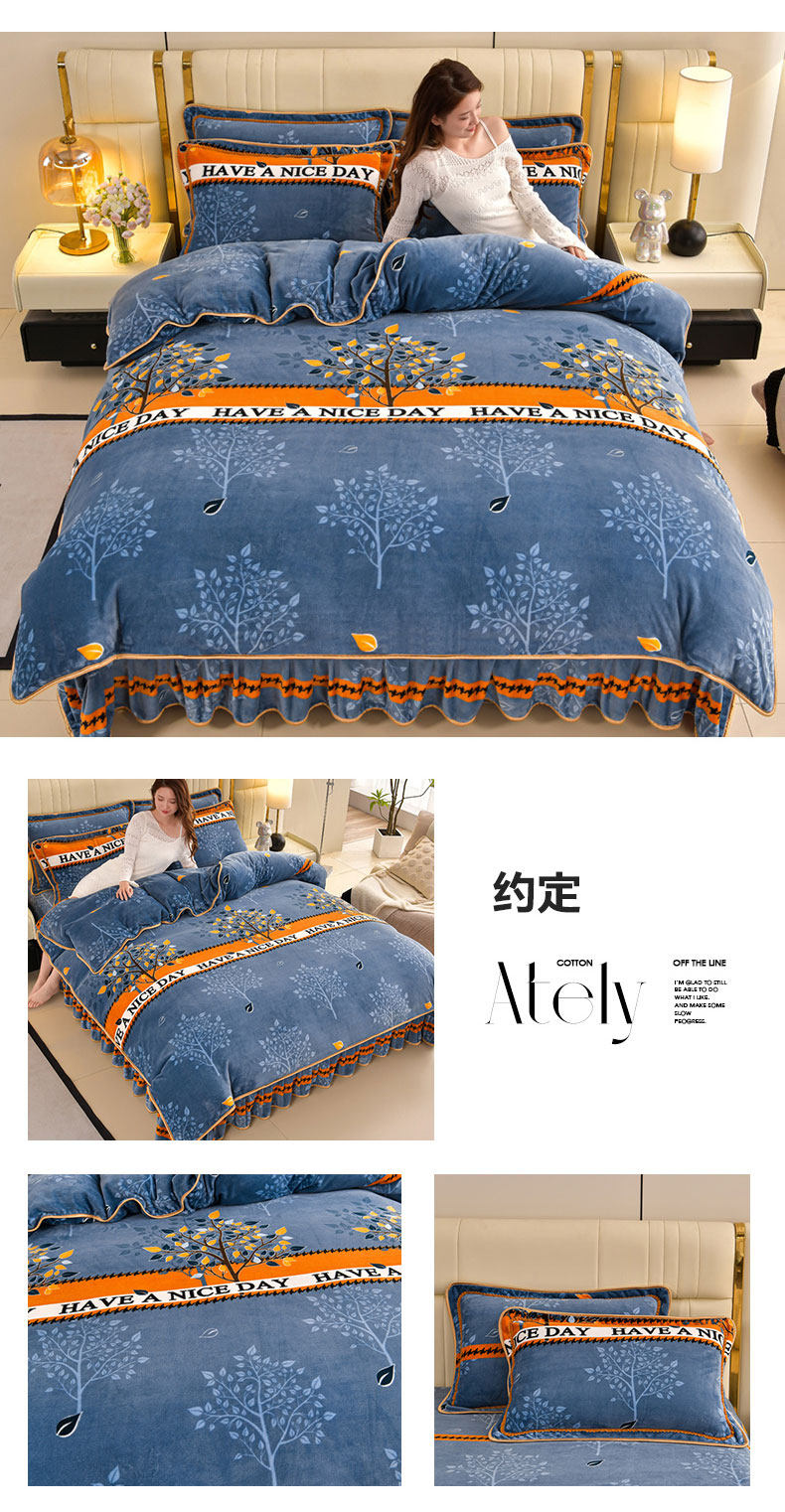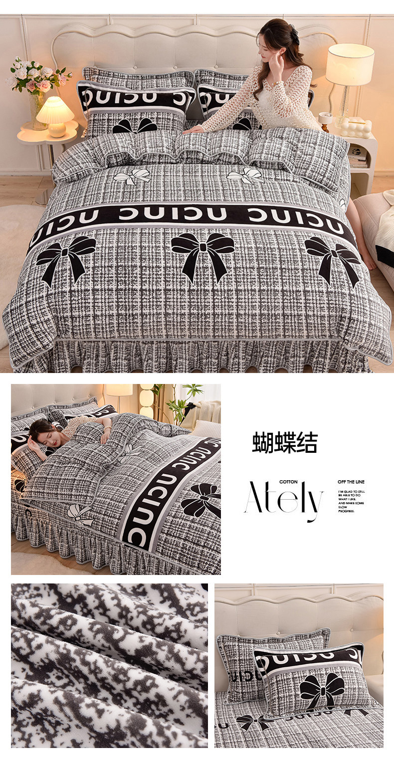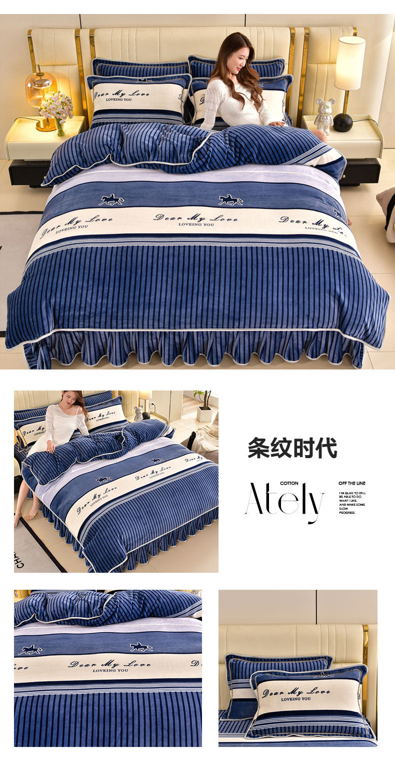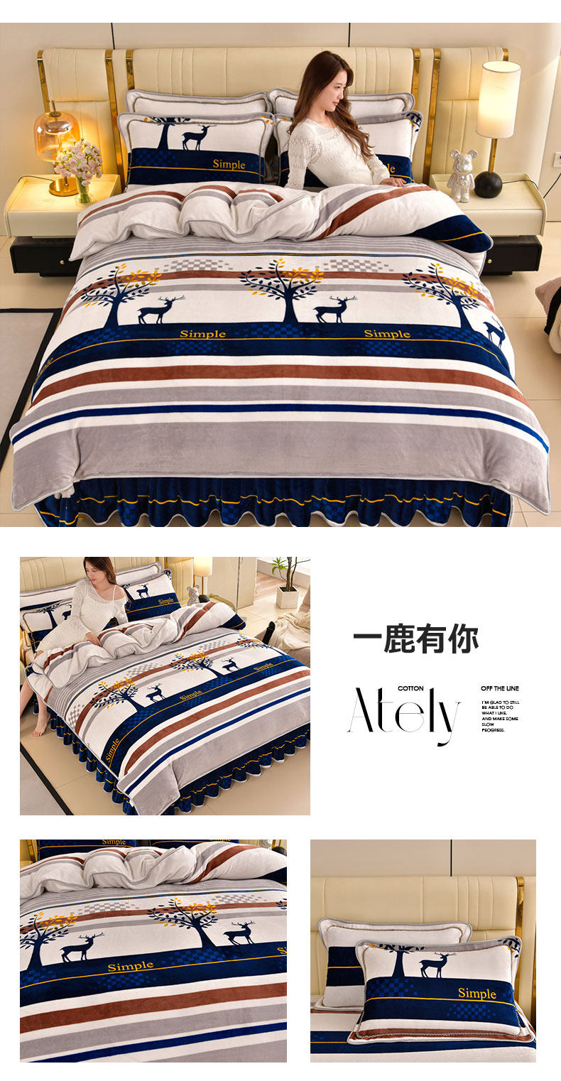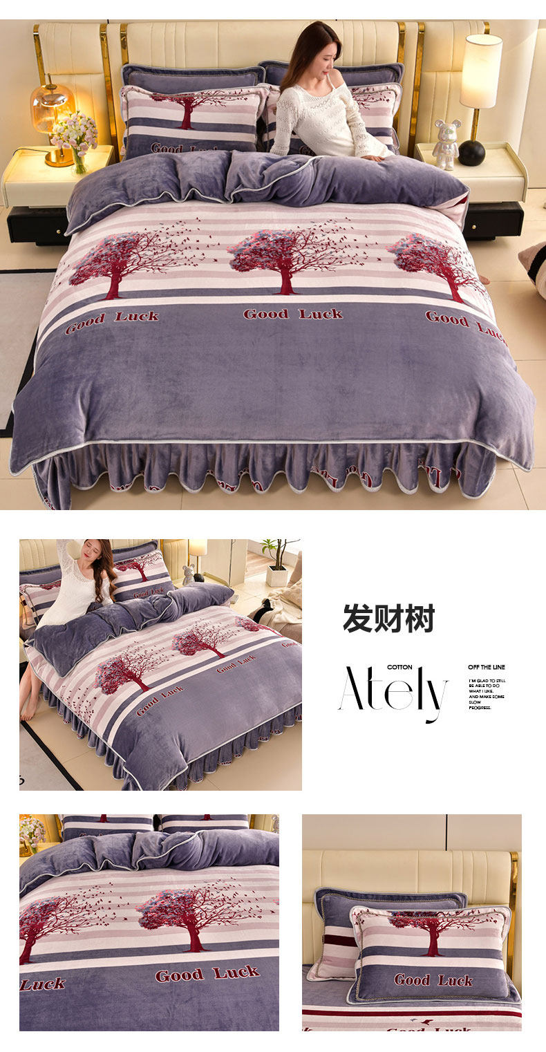 Thickened Milk Velvet Four-Piece Set, Winter Warm Double-Sided Coral Velvet Duvet Cover, Flannel Bed Sheet, Bed Skirt, Bedding