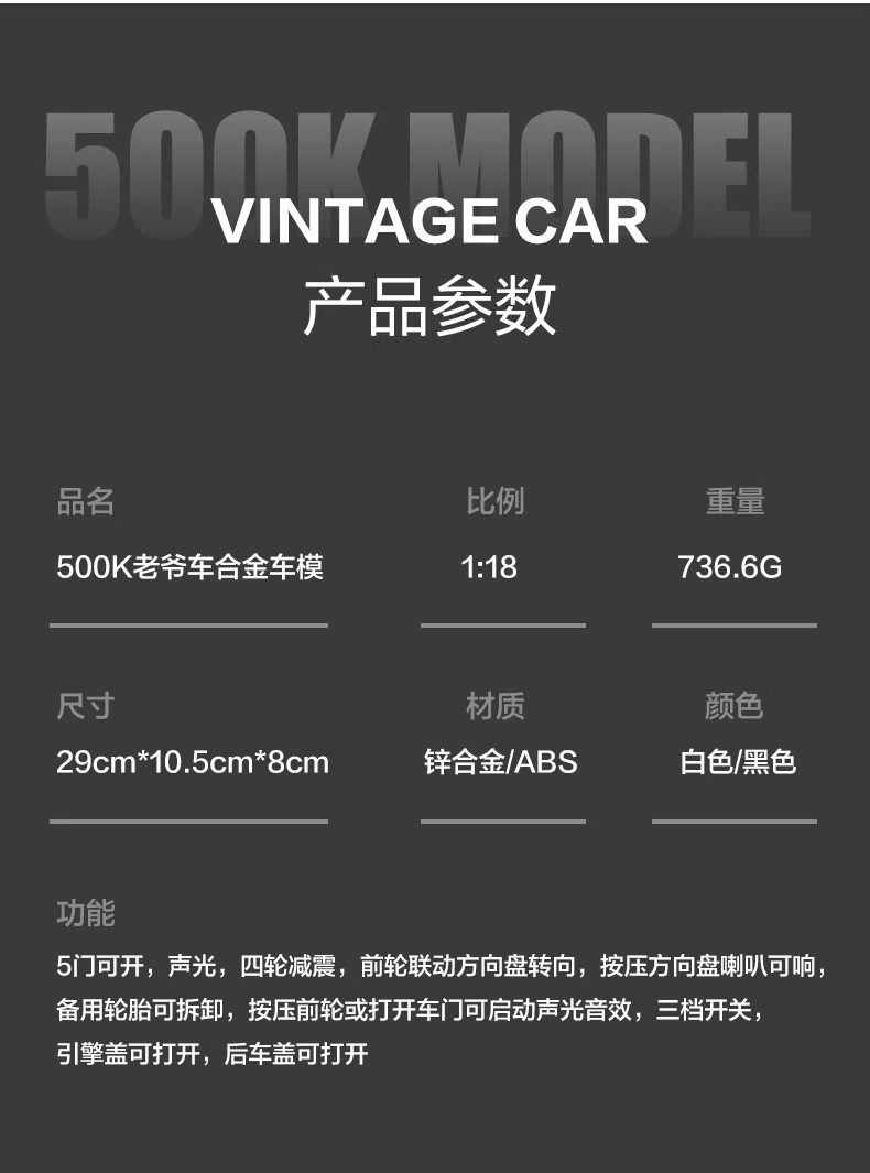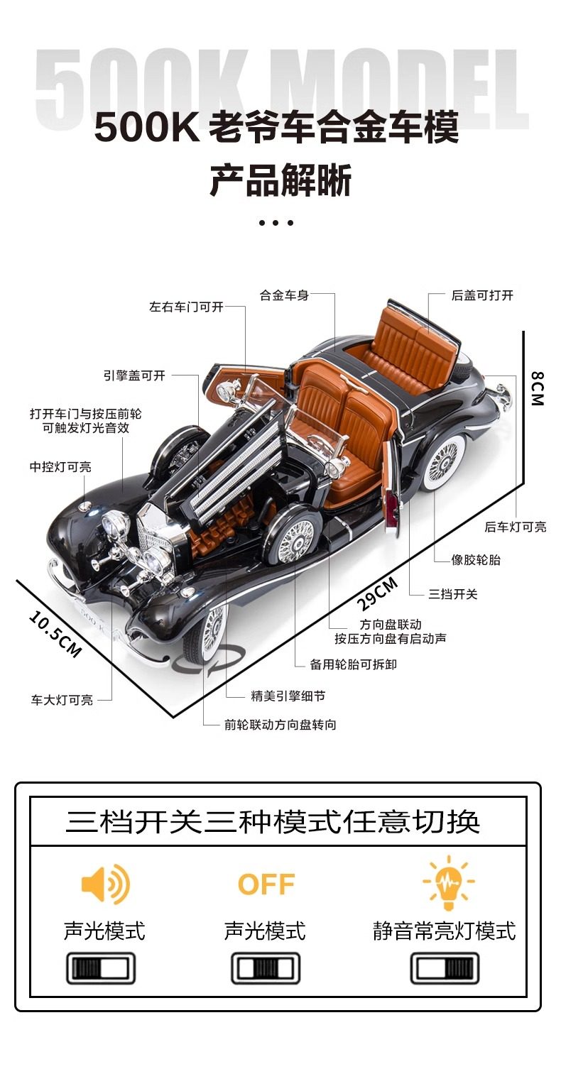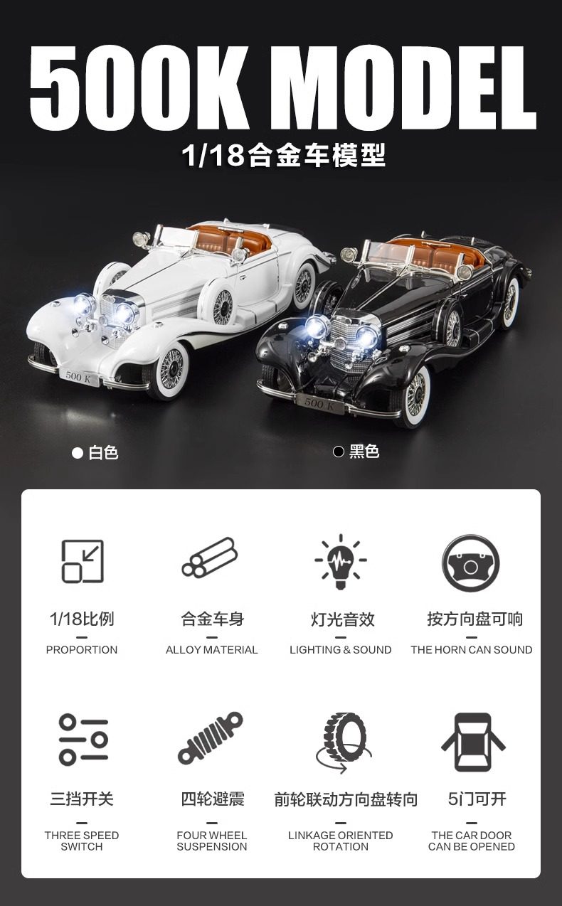 | Color Classification | 500K Classic Car [White] + Brown Leather Dust Cover,500K Classic Car [Black] + Brown Leather Dust Cover,500K Classic Car [White] + Black Leather Dust Cover,500K Classic Car [Black] + Black Leather Dust Cover,500K Classic Car [White] + Solid Wood Dust Cover,500K Classic Car [Black] + Solid Wood Dust Cover,500K Classic Car [White] + Acrylic Dust Cover,500K Classic Car [Black] + Acrylic Dust Cover,500K Classic Car [White],500K Classic Car [Black] |