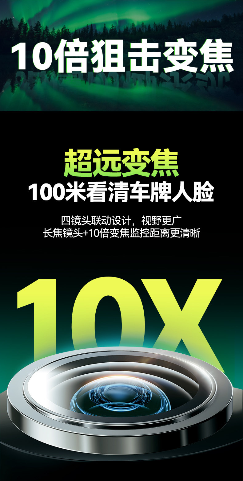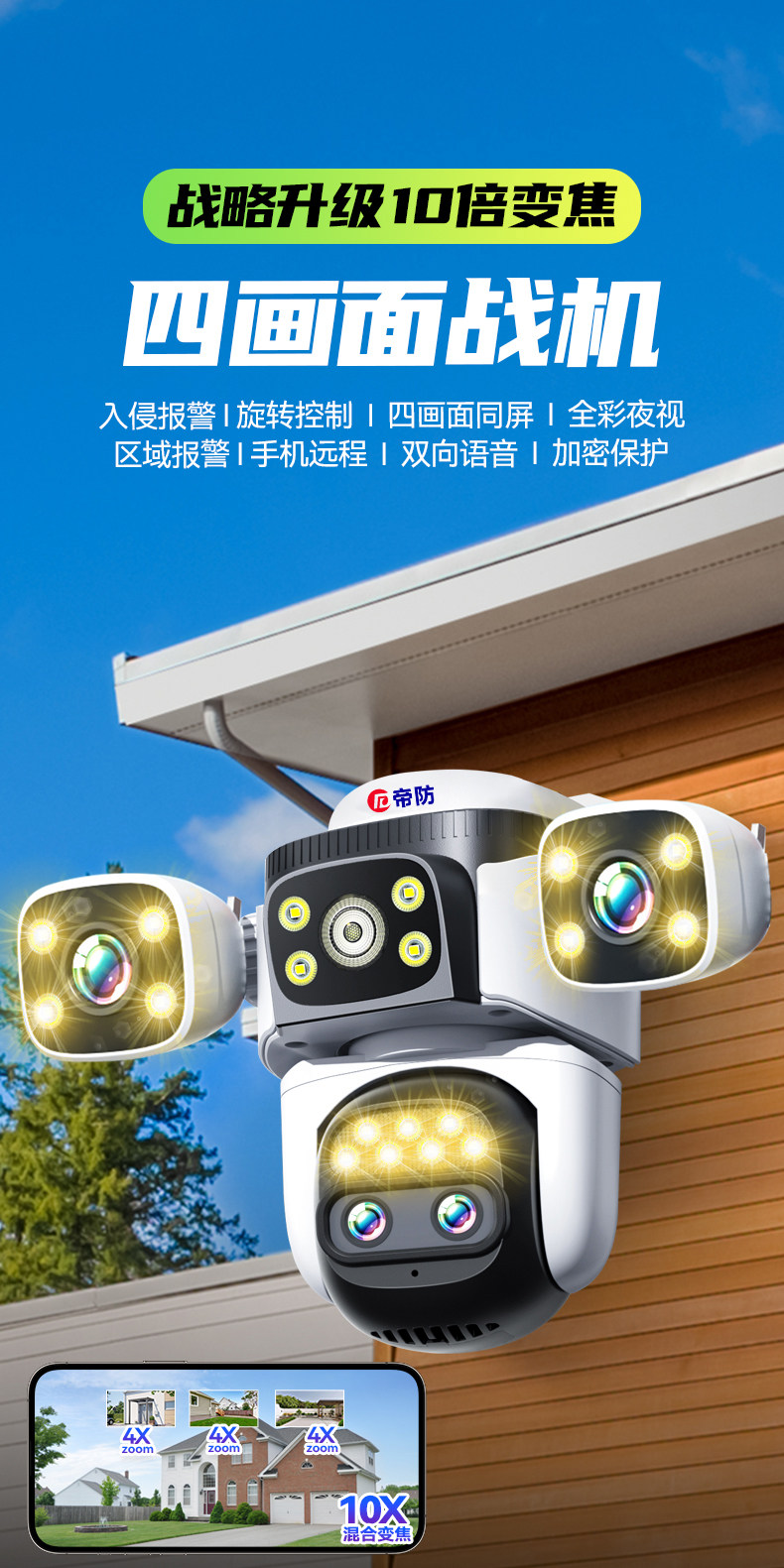 Four-Screen 10X Zoom Camera Outdoor Mobile Phone Remote Monitor Home High-Definition Night Vision 360-Degree No Blind Spots