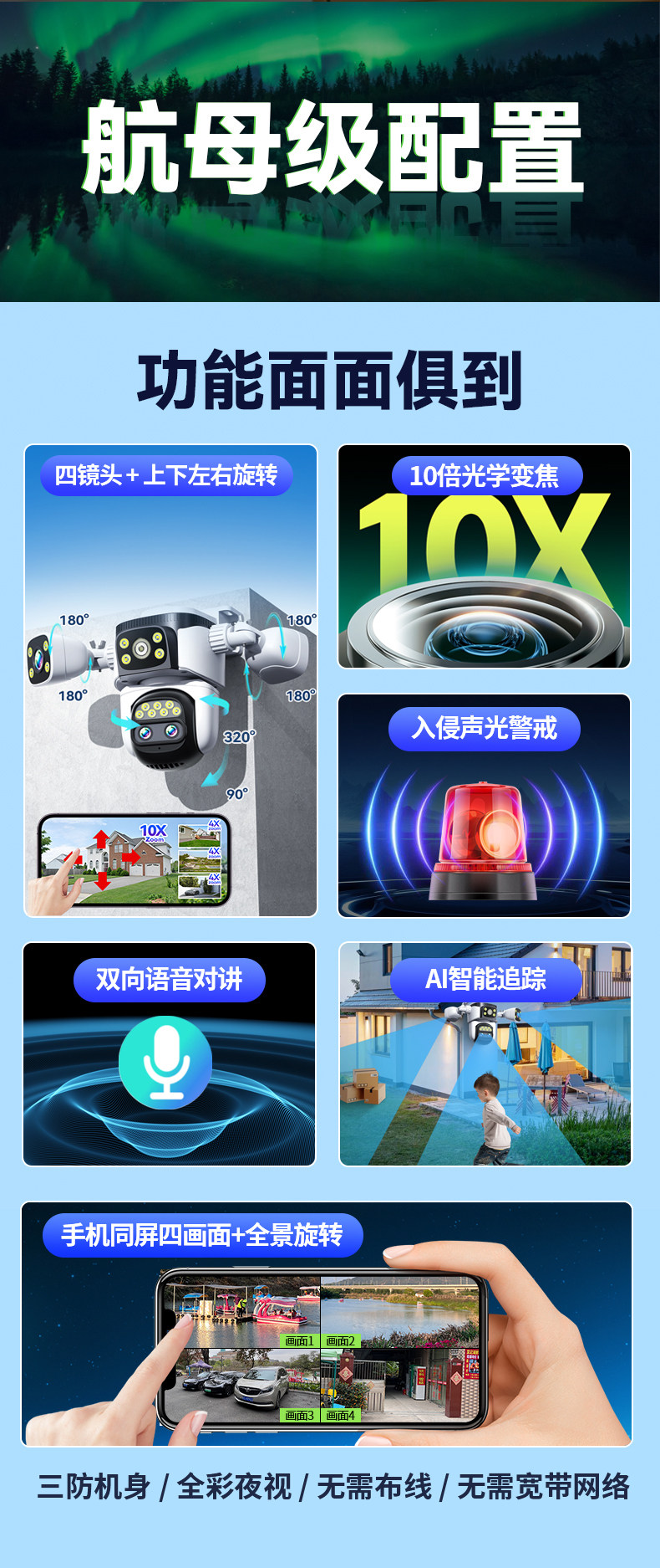 | Color Classification | Wifi Version - Rotatable Three Lenses, Three Screens - All-Round Monitoring,Wifi Version - Power Outage Monitoring - Rotatable Three Lenses, Three Screens - All-Round Monitoring,Wifi Version - Rotatable Four Lenses, Four Screens - 10X Zoom (See 100m) - All-Round Monitoring,Wi-Fi Version - Power Outage Monitoring - Rotatable Quad Lens, Quad Screen - 10X Zoom (See 100m) - All-Around Surveillance,4g Version - Includes 99-Year Data Plan (Remote Access Without Cellular Network) - Rotatable Triple Lens, Triple Screen View - All-Around Monitoring,4g Version - Includes 99-Year Data Plan (Remote Access Without Cellular Network) - Power Outage Monitoring - Rotatable Triple Lens, Triple Screen View - All-Around Surveillance |