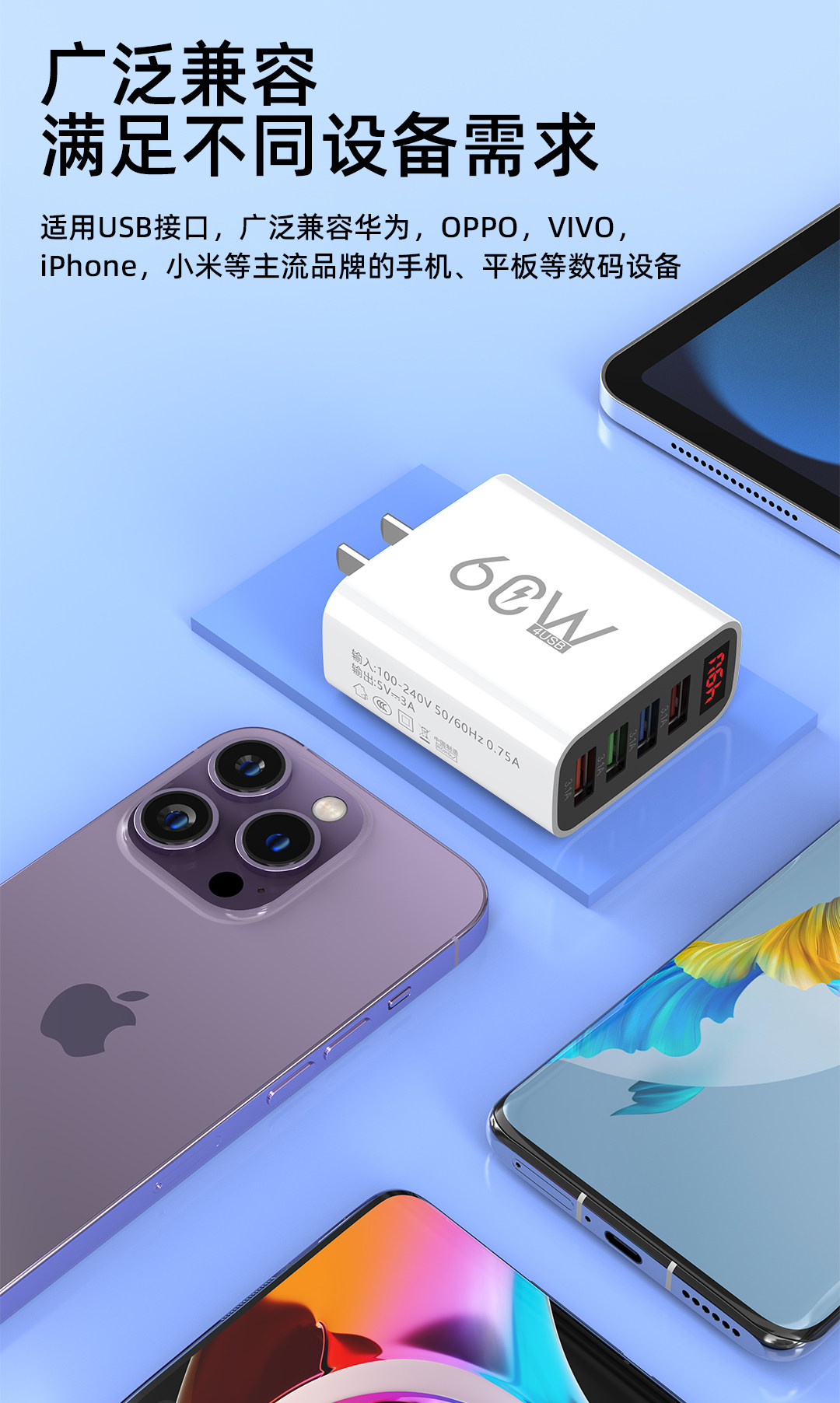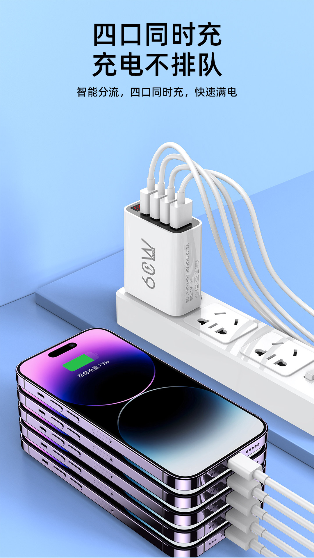 Suitable for Apple Charger Fast Charging, One-To-Three Android Charging Head, Smart Digital Display Universal Plug, Suitable for Huawei, Honor, Xiaomi, Redmi, Oppo, Vivo, Bluetooth Earphones, Speakers, 5V1A2A Charging