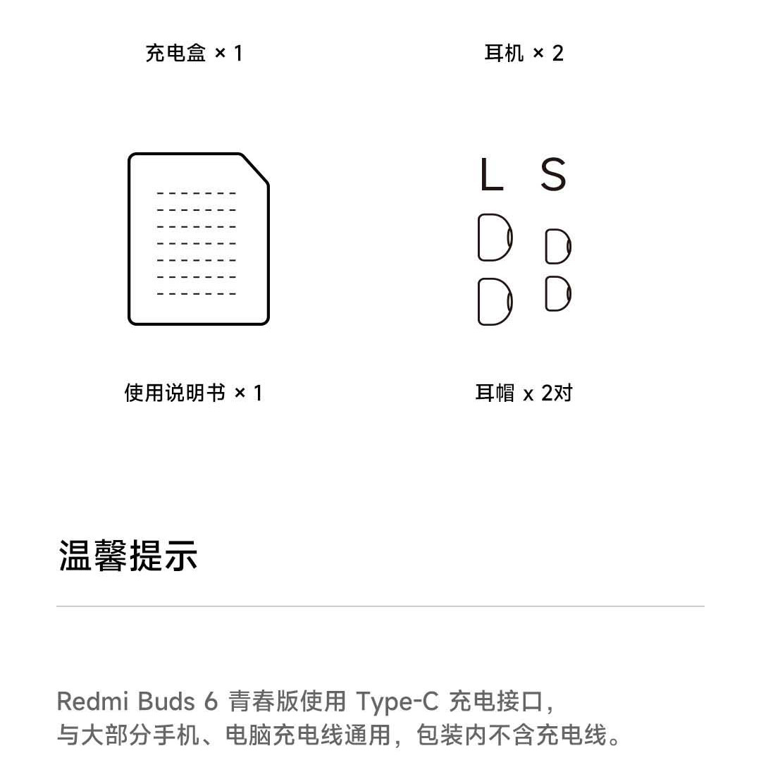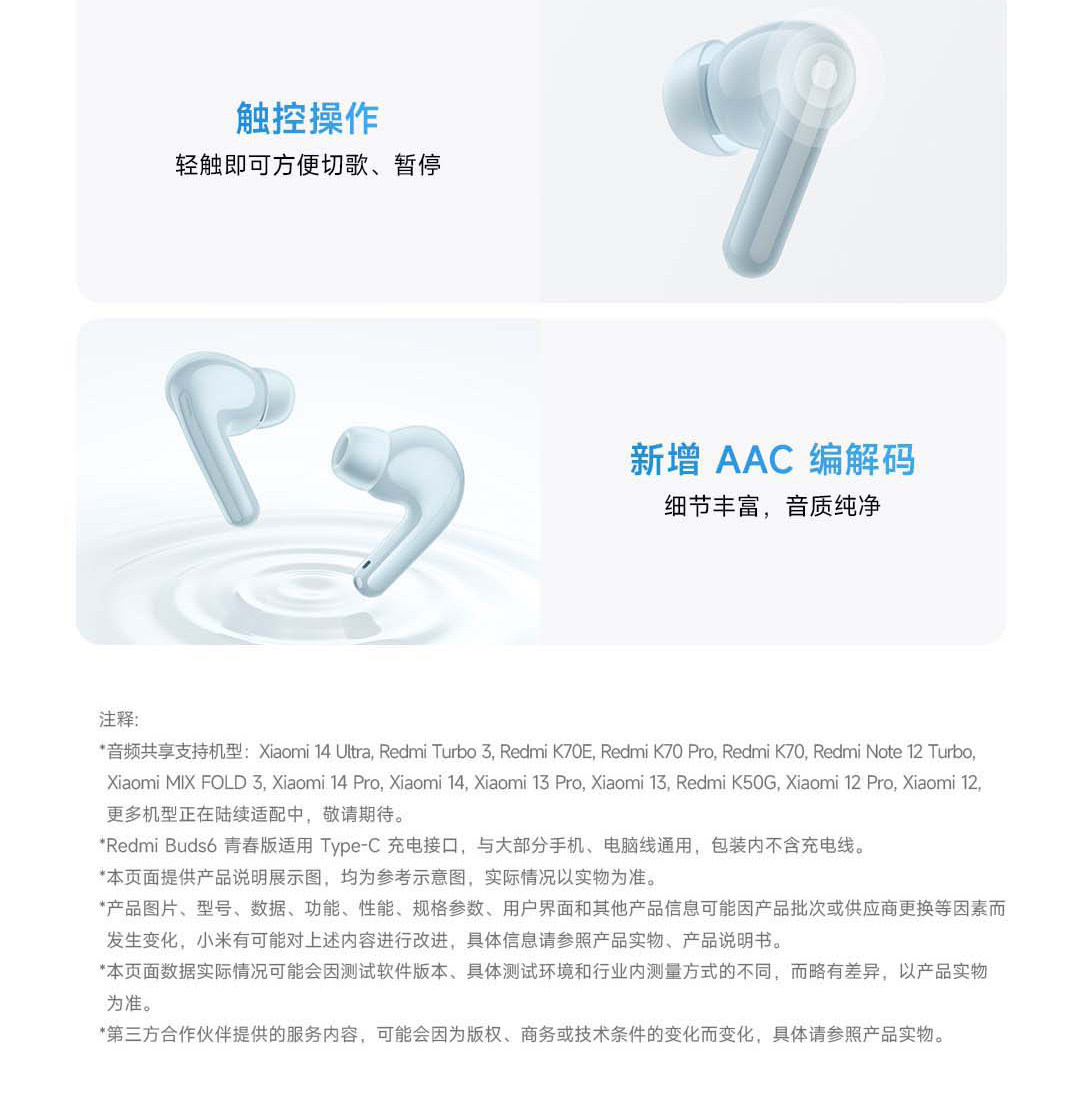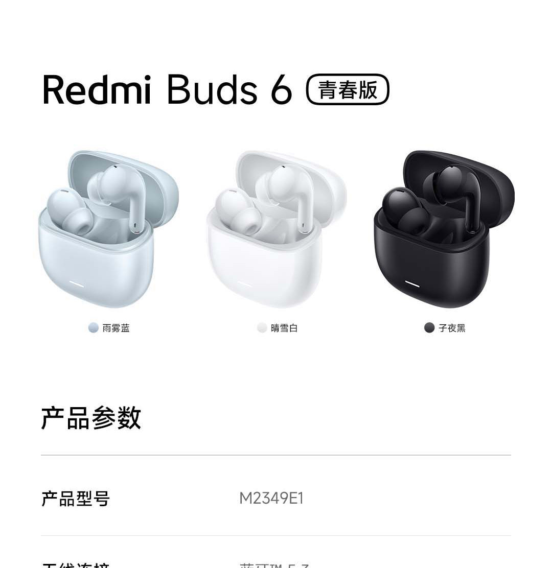 | Color Classification | Redmi Buds6 Youth Edition Midnight Black,Redmi Buds6 Youth Edition Clear Snow White,Redmi Buds6 Youth Edition Rain Mist Blue |