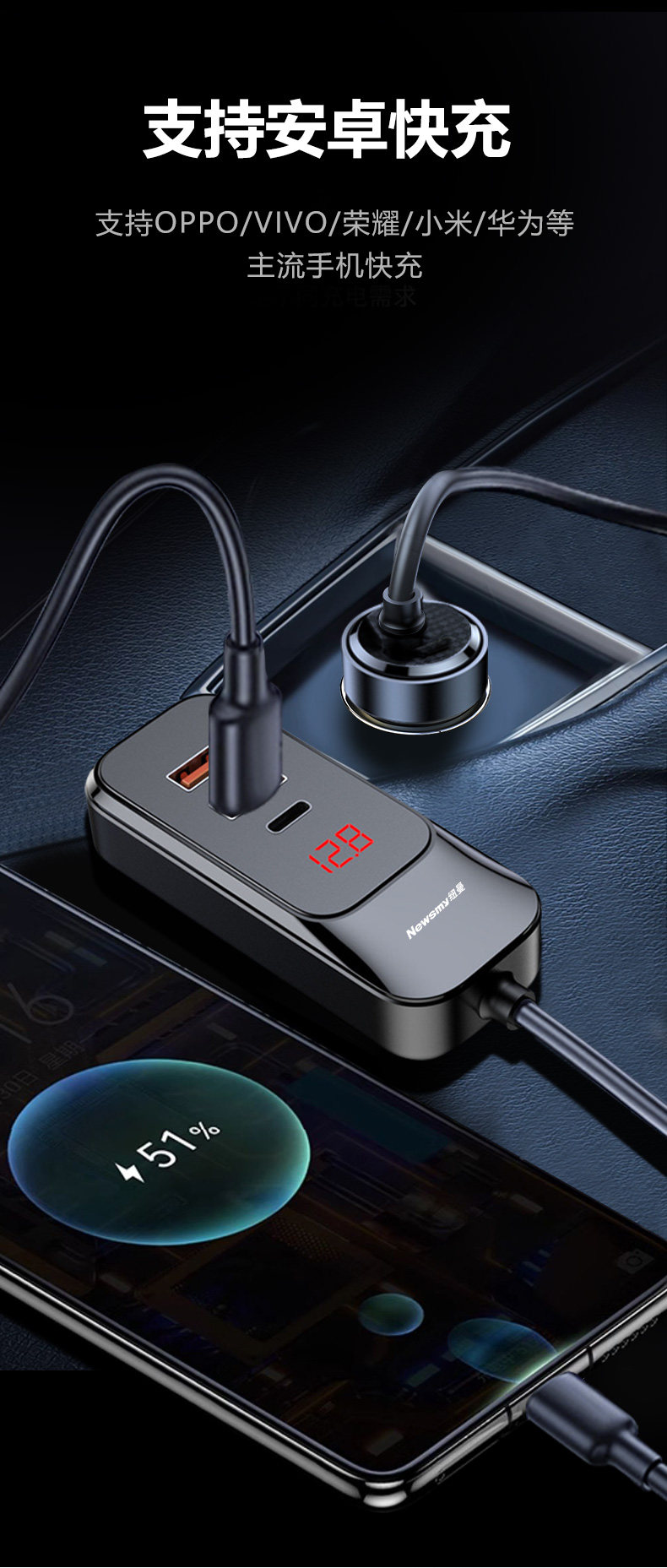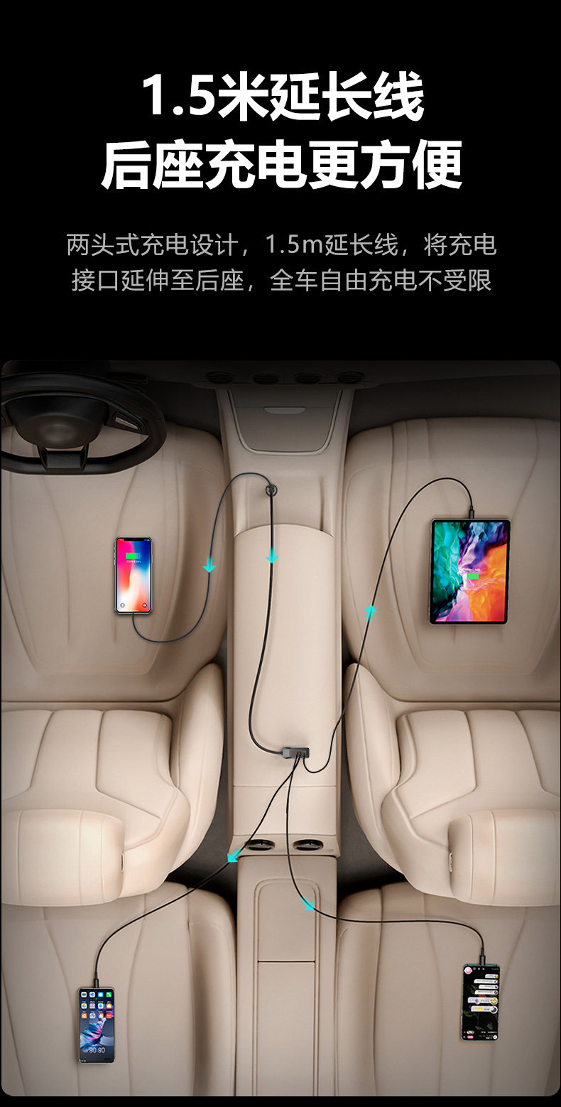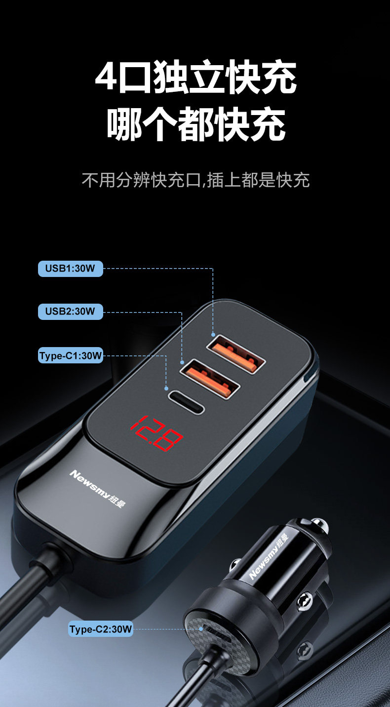 Newman Car Charger Super Fast Charging One-To-Three Cigarette Lighter Multifunctional Adapter Extension Cable Rear Seat