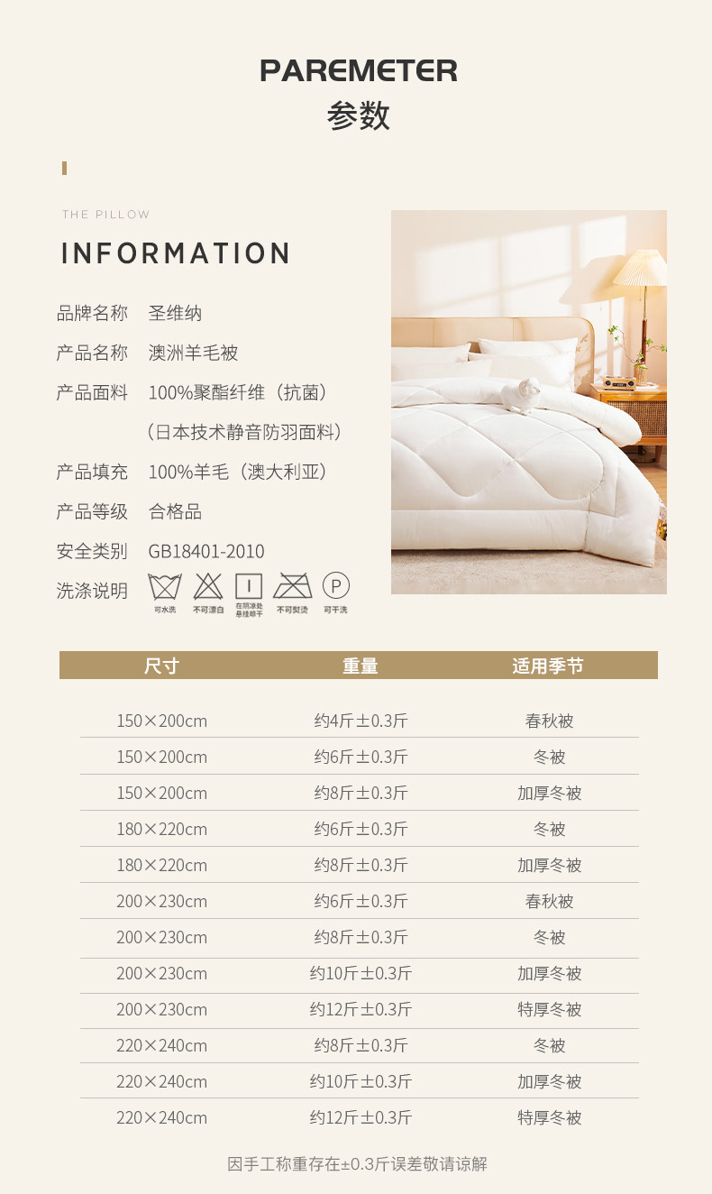 | Size | 【150×200Cm】Spring/Autumn Quilt Approx. 【100% Australian Imported Pure Wool - 10X Money Back Guarantee if Fake】,【150×200Cm】Autumn/Winter Quilt Approx. 【100% Australian Imported Pure Wool - 10X Money Back Guarantee if Fake】,【150×200Cm】Winter Quilt Approx. 3kg 【100% Australian Imported Pure Wool - 10X Money Back Guarantee if Fake】,【150×200Cm】Thickened Winter Quilt Approx. 4kg 【100% Australian Imported Pure Wool - 10X Money Back Guarantee if Fake】,【180×220Cm】Spring/Autumn Quilt Approx. 【100% Australian Imported Pure Wool - 10X Money Back Guarantee if Fake】,【180×220Cm】Thickened Winter Quilt Approx. 3.5kg 【100% Australian Imported Pure Wool - 10X Money Back Guarantee if Fake】,【200×230Cm】Spring/Autumn Quilt Approx. 【100% Australian Imported Pure Wool - 10X Money Back Guarantee if Fake】,【200×230Cm】Winter Quilt Approx. 3kg 【100% Australian Imported Pure Wool - 10X Money Back Guarantee if Fake】,【200×230Cm】Thickened Winter Quilt Approx. 4kg 【100% Australian Imported Pure Wool - 10X Money Back Guarantee if Fake】,【200×230Cm】Extra Thick Winter Quilt Approx. 5kg 【100% Australian Imported Pure Wool - 10X Money Back Guarantee if Fake】,【220×240Cm】Spring/Autumn Quilt Approx. 【100% Australian Imported Pure Wool - 10X Money Back Guarantee if Fake】,【220×240Cm】Winter Quilt Approx. 3.5kg 【100% Australian Imported Pure Wool - 10X Money Back Guarantee if Fake】,【220×240Cm】Thickened Winter Quilt Approx. 4.5kg 【100% Australian Imported Pure Wool - 10X Money Back Guarantee if Fake】,【220×240Cm】Extra Thick Winter Quilt Approx. 5.5kg 【100% Australian Imported Pure Wool - 10X Money Back Guarantee if Fake】 |