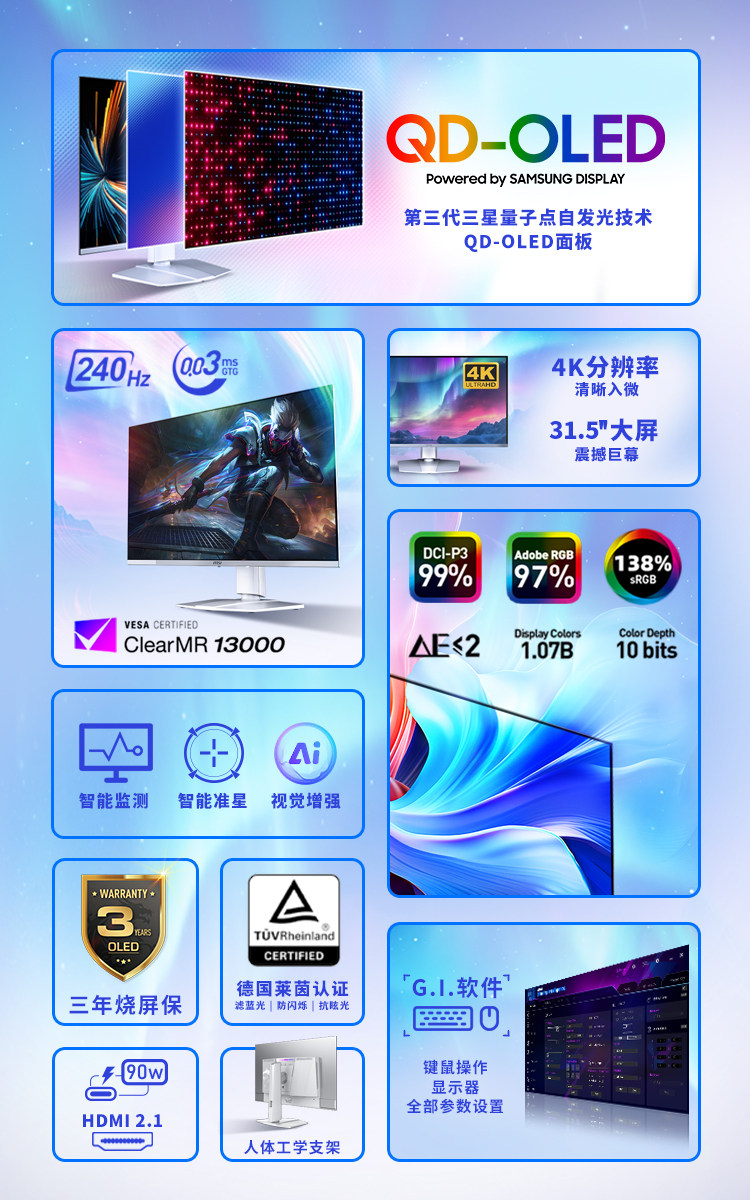 Msi 32-Inch 4K White 240Hz Aurora Qd-Oled Gaming Computer Monitor Mpg321Urxw Screen 27