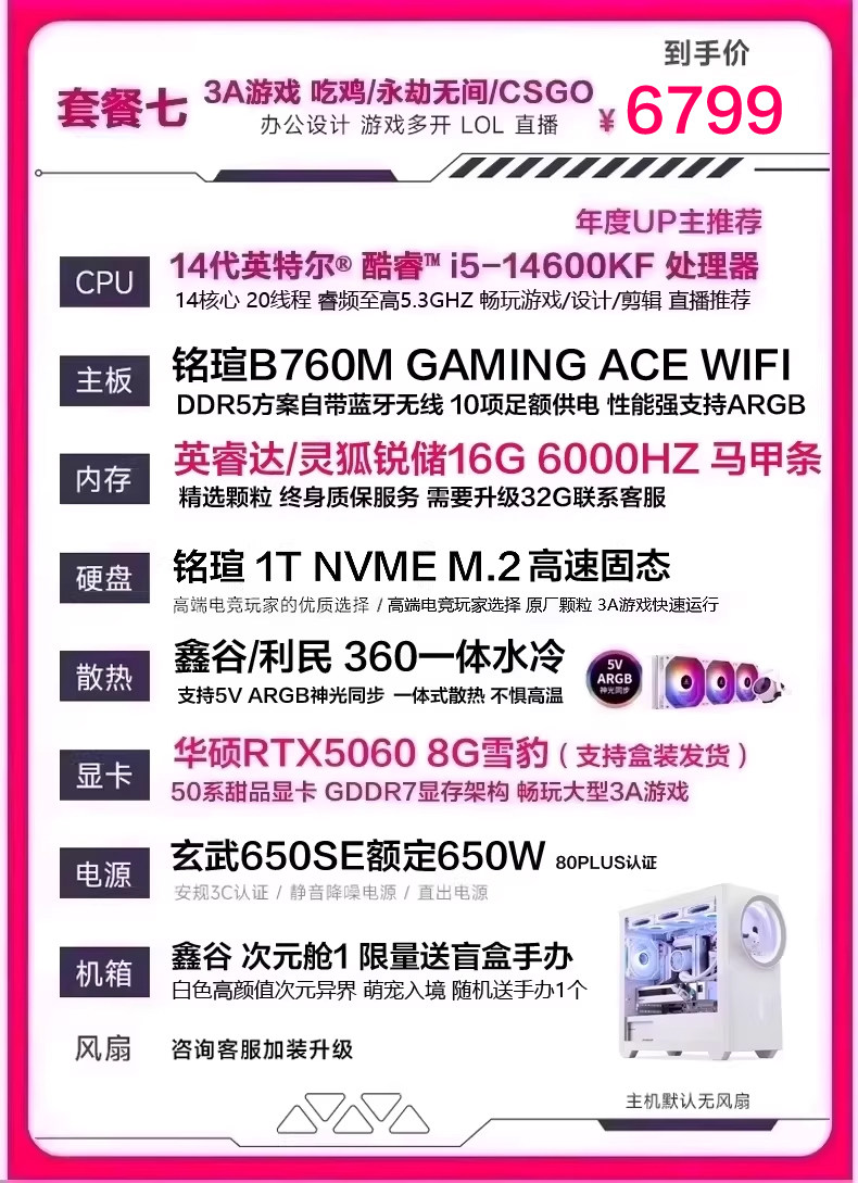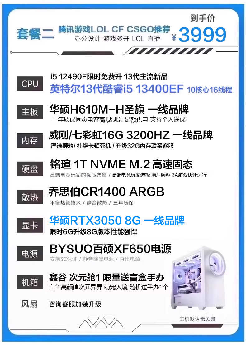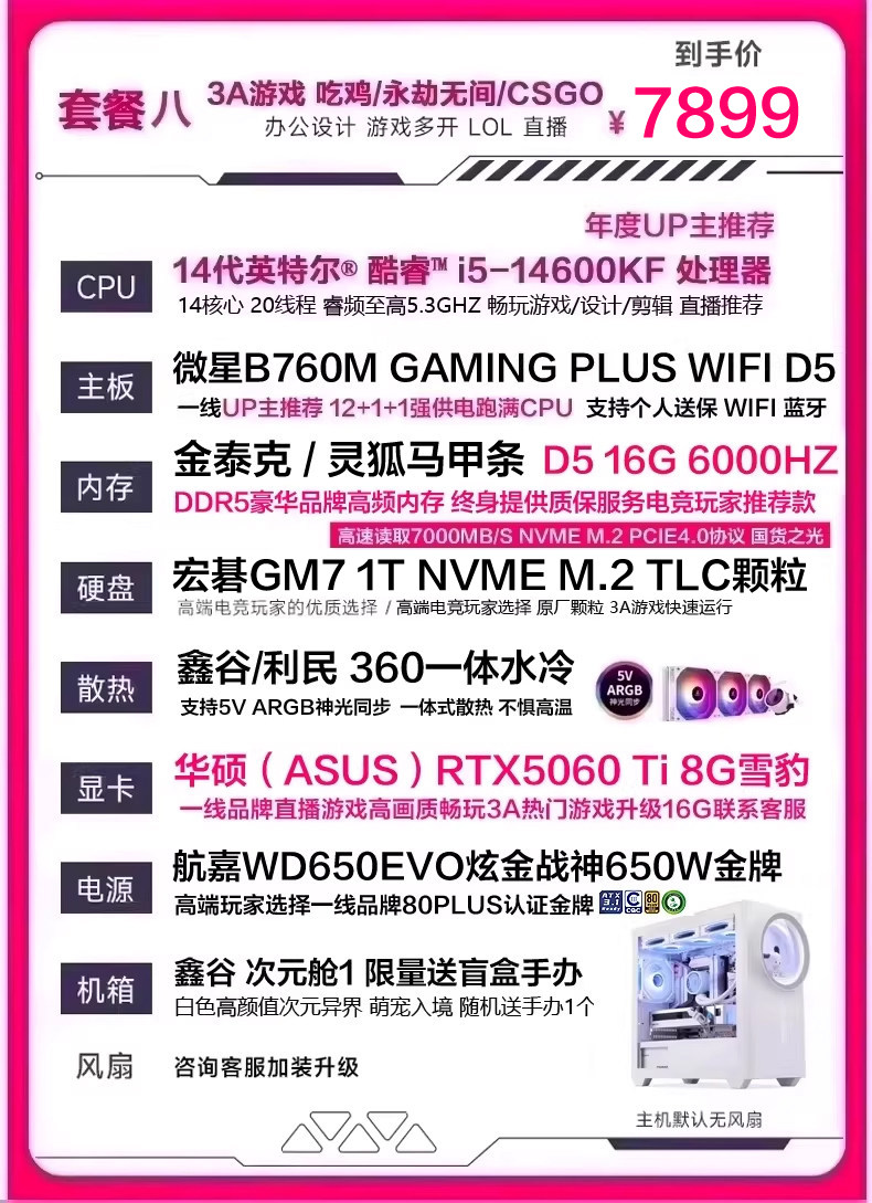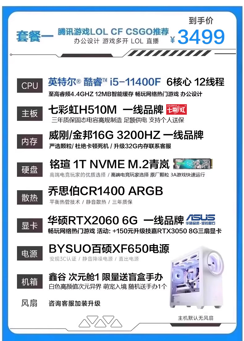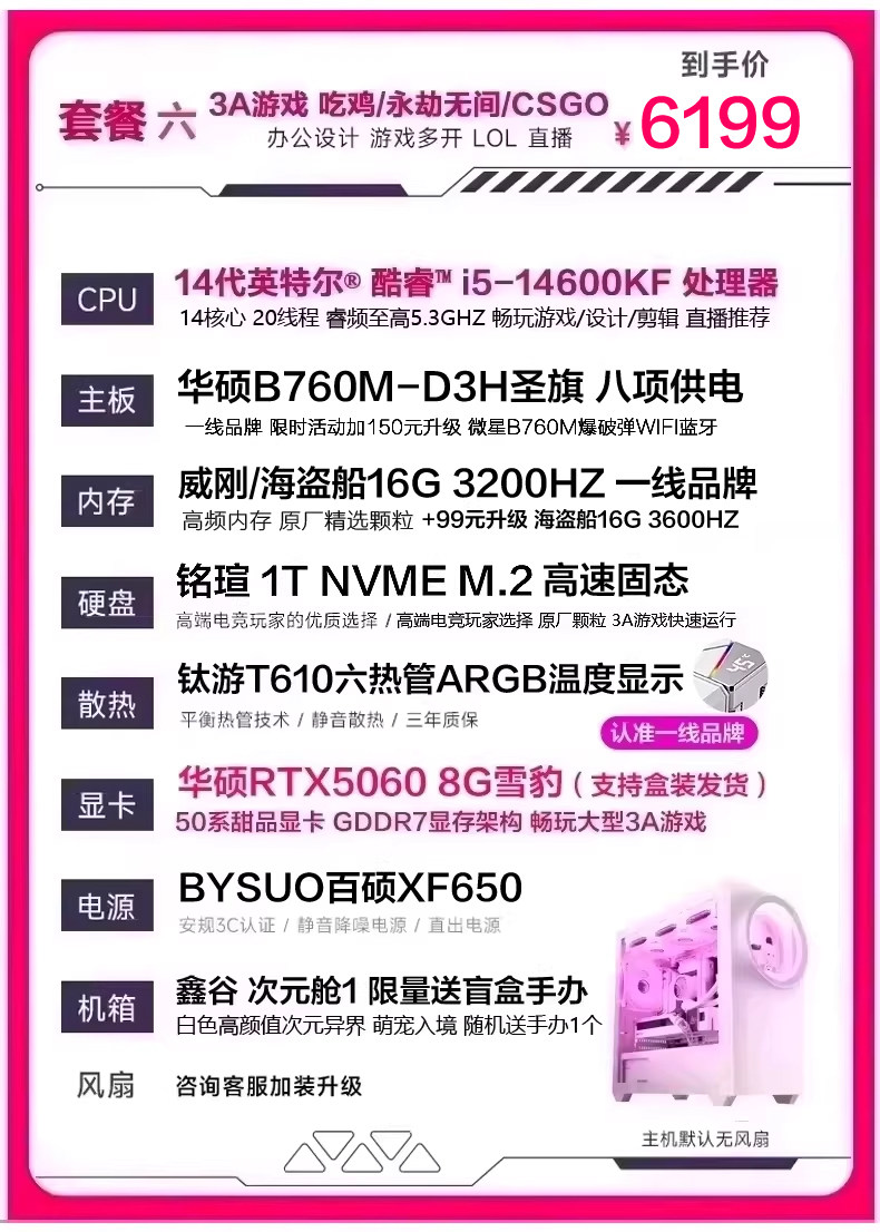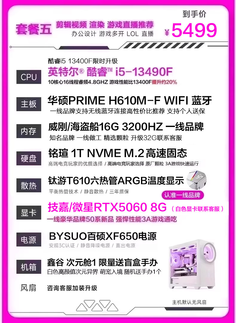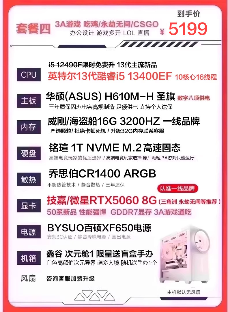 | Package Type | Package 1 I5 11400F Rtx2060 6g (Recommended for Tencent Games Lol Cf Chicken Dinner),Package 2 I5 13400Ef Rtx3050 8g (Recommended for Online Games, Office Learning, Etc.),Bundle 3: I5 13400Ef + Rtx 3060 12Gb (Delta Chicken Dinner Series - Recommended for Live Streaming & Gaming),Bundle Four: I5 13400Ef, Rtx 5060 8Gb (50 Series New Arrival - Delta Edition for Pubg, Limited-Time Offer - One Per Customer),Bundle 5 (Wifi & Bluetooth Enabled): I5 13490F, Rtx 5060, 8Gb Ram (High-Quality Graphics for Aaa Games Like Naraka: Bladepoint and Pubg),Bundle Six (Asus 50 Series): I5 14600Kf, 5060, 8Gb Ram - Stunning Design, Effortless 3A Gaming for Livestreaming.,Bundle 7 (Asus 50 Series D5 Liquid Cooler Wifi Bluetooth) I5 14600Kf Rtx5060 8Gb Gaming & Streaming Supreme Configuration,Bundle Eight (Asus Top-Spec Liquid-Cooled D5 Memory, Wifi, Bluetooth) I5 14600Kf 5060Ti 8Gb - Same Configuration as Gaming Livestreamers |