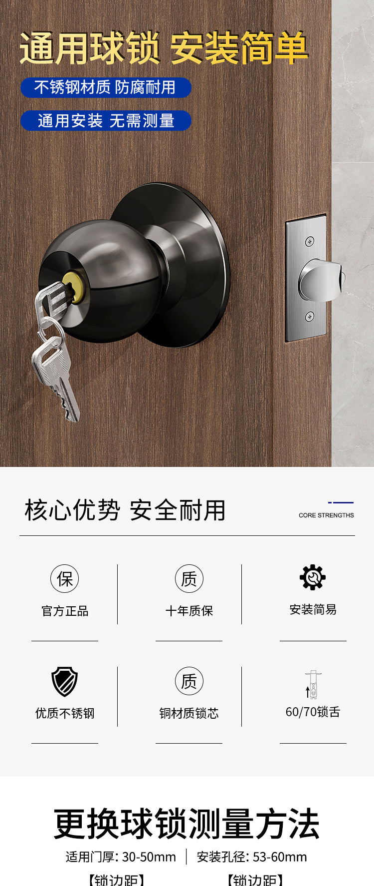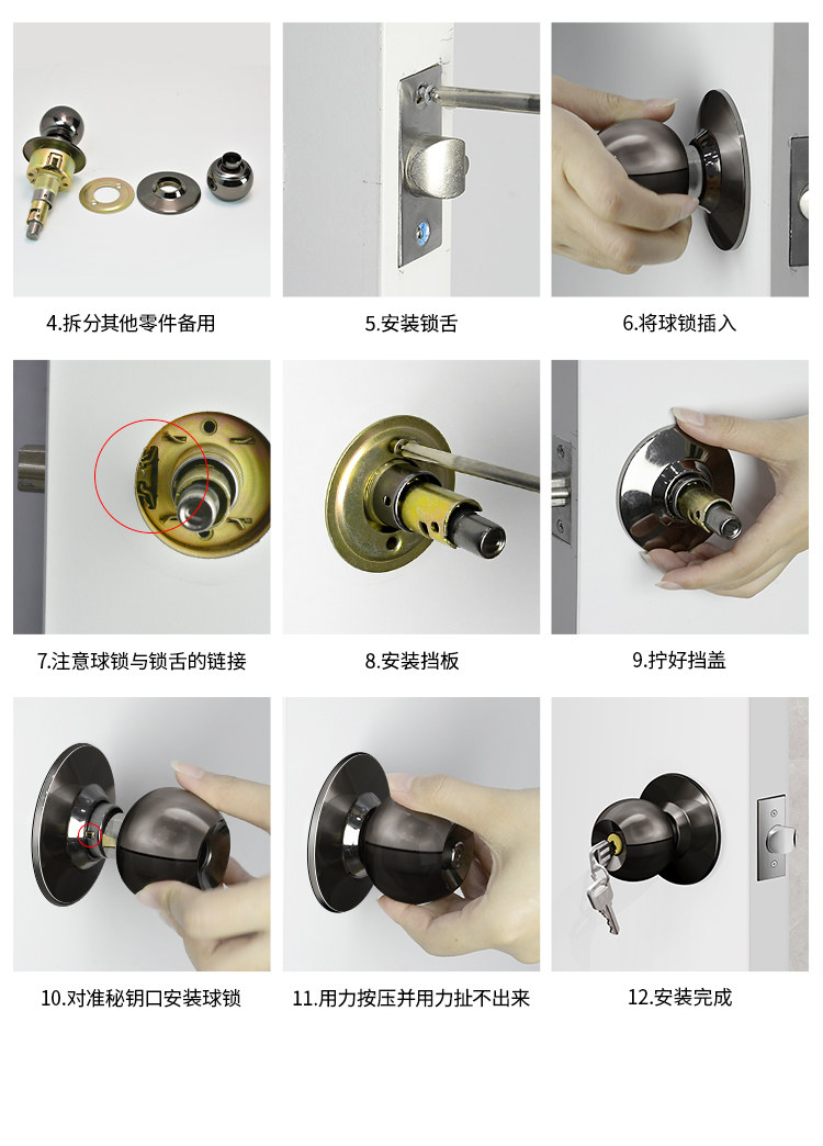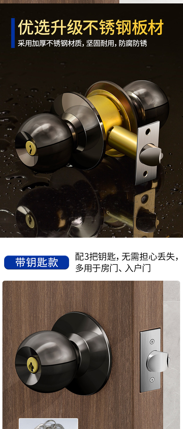 Spherical Household Lock for Wooden Doors, Old-Fashioned Lock, Universal Door Lock for Bedroom, Interior Door, Bathroom, Stainless Steel Round Lock