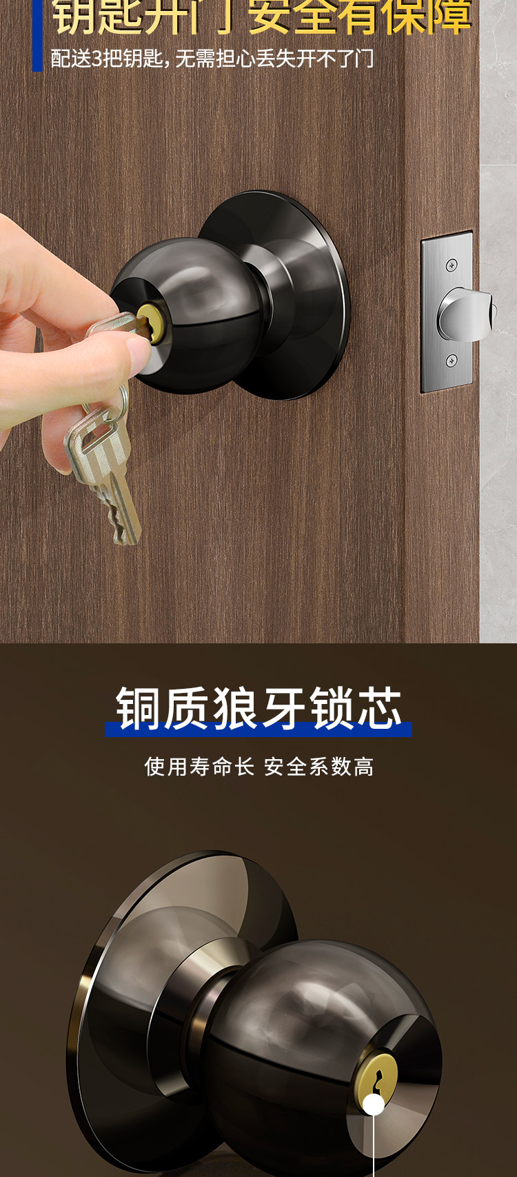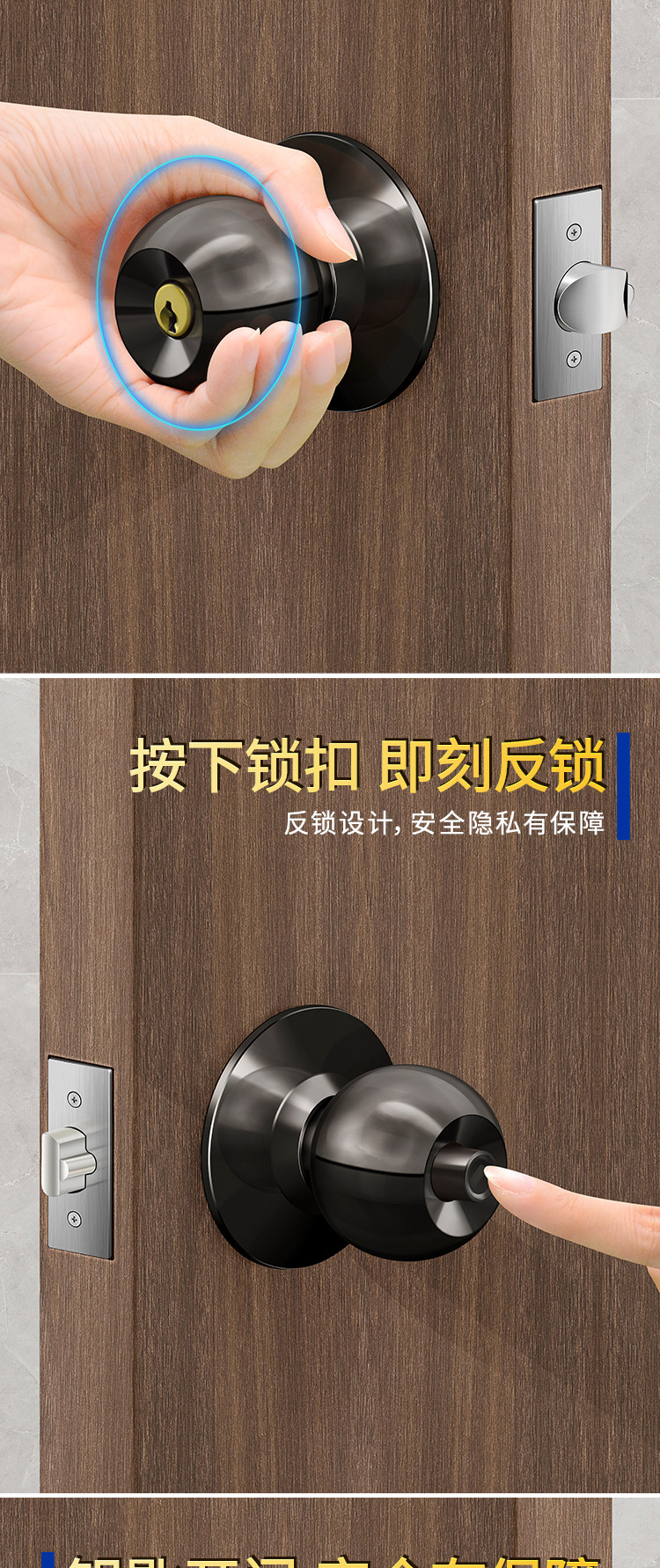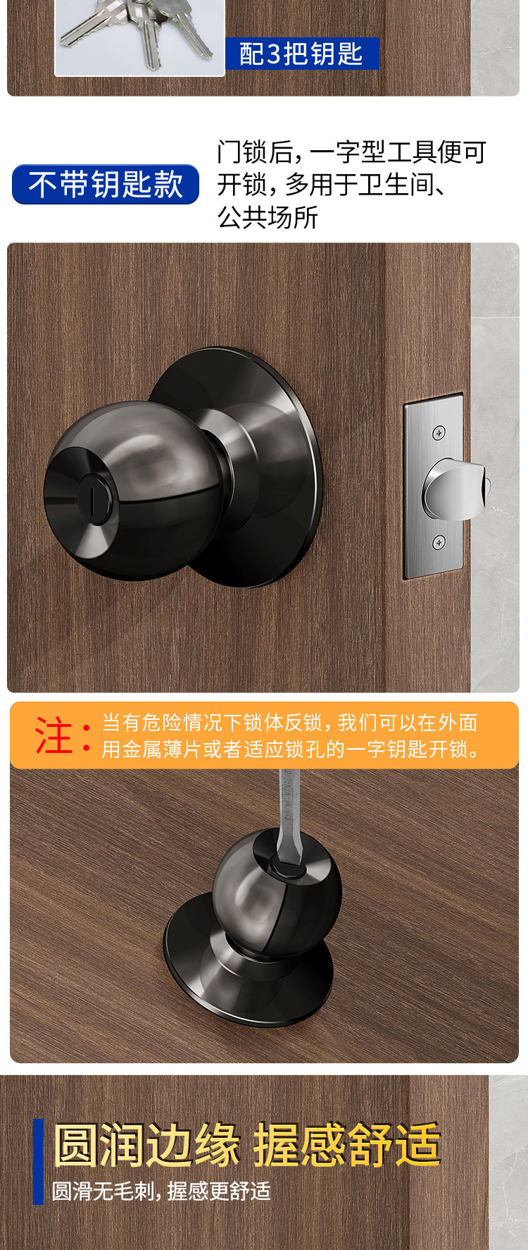 Spherical Household Lock for Wooden Doors, Old-Fashioned Lock, Universal Door Lock for Bedroom, Interior Door, Bathroom, Stainless Steel Round Lock
