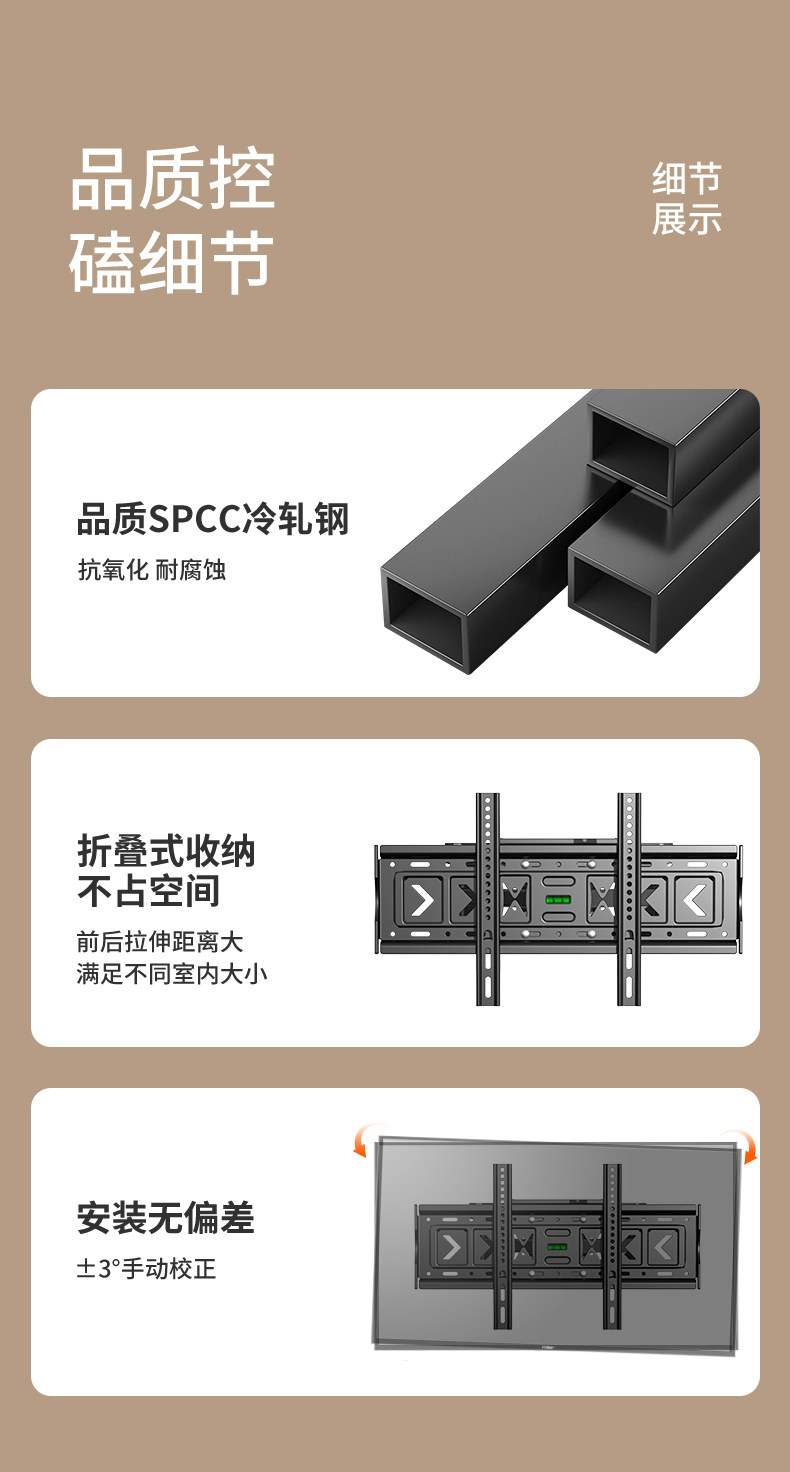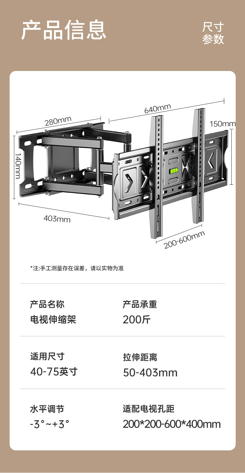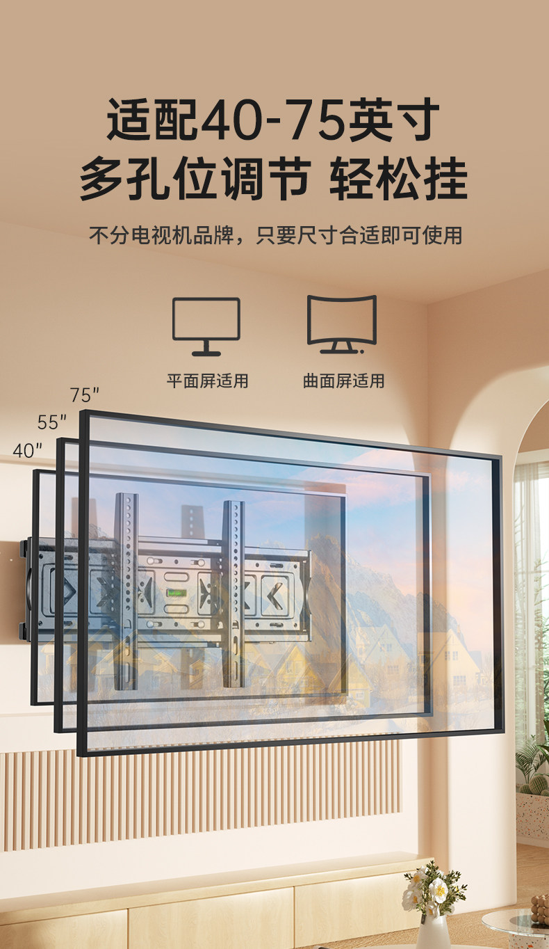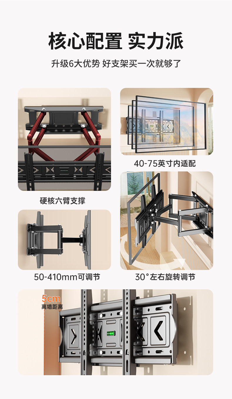 | Color Classification | Gift[Lifetime Warranty]Add to Favorites and Purchase for Priority Delivery,[26-50inch Universal]Wall-Mounted 5.5cm,[26-55inch Universal]Wall-Mounted 5.5cm,[32-60inch Universal]5cm from the Wall,[32-70inch Universal]5cm from the Wall,[40-75inch Universal]5cm from the Wall,Large Panel[26-65inch Universal]Wall 3.8cm,Large Panel[40-75inch Universal]Wall 3.8cm,[40-80inch Universal]Wall-Mounted 4.8cm,Upgrade to Eight Arms[40-80inch Universal]About 3cm from the Wall,[32-85inch Universal]Solid Shaft/Ultra-Thin Wall 3.8cm,[45-90inch Universal]Solid Shaft Silky Stretch/Ultra-Thin Wall 4cm,[45-90inch Universal]Upgraded Eight-Arm Solid Shaft for Silky Smooth Stretching/Ultra-Thin Wall 3.5cm,[45-100inch Universal]Solid Shaft Silky Stretch/Ultra-Thin Wall 4cm,[55-100inch Universal]Upgraded Eight-Arm Solid Shaft for Silky Smooth Stretching/Ultra-Thin Wall 3.5cm,[80-120inch Special for Large Screen]Solid Shaft Silky Stretch/Ultra-Thin Wall 5cm |