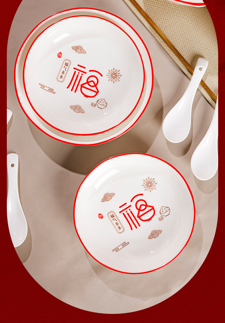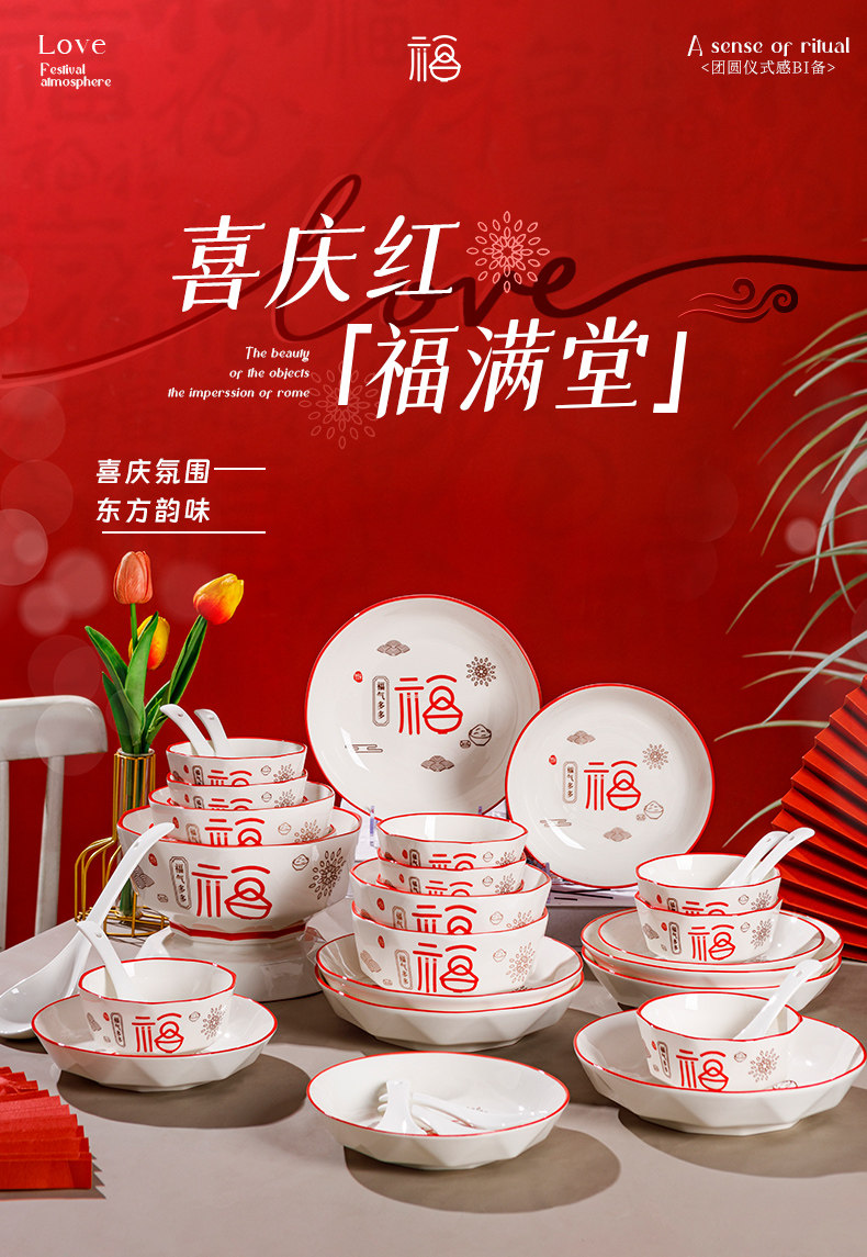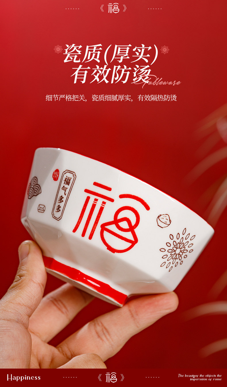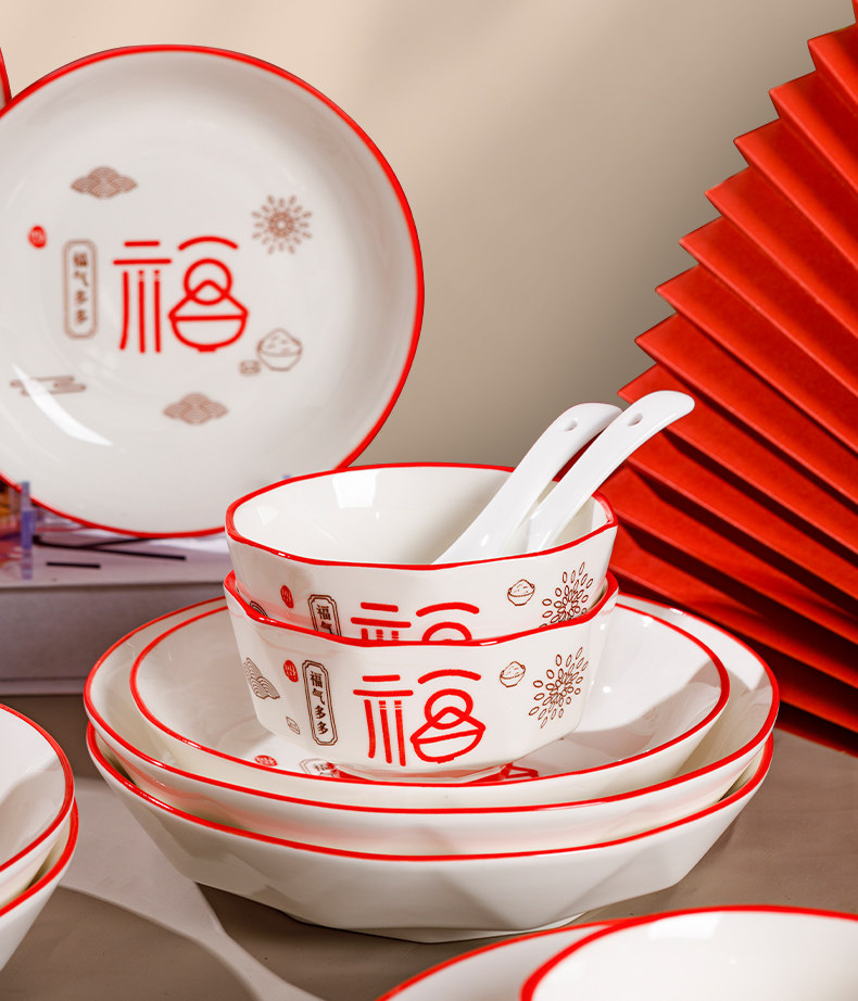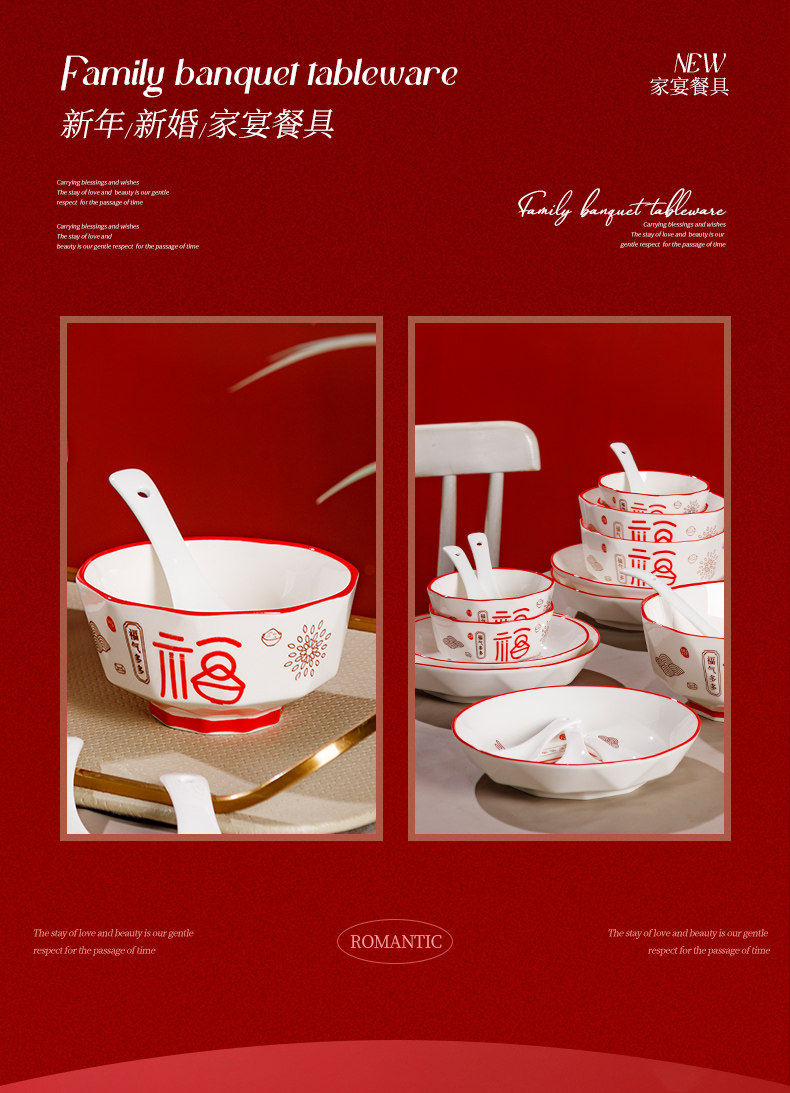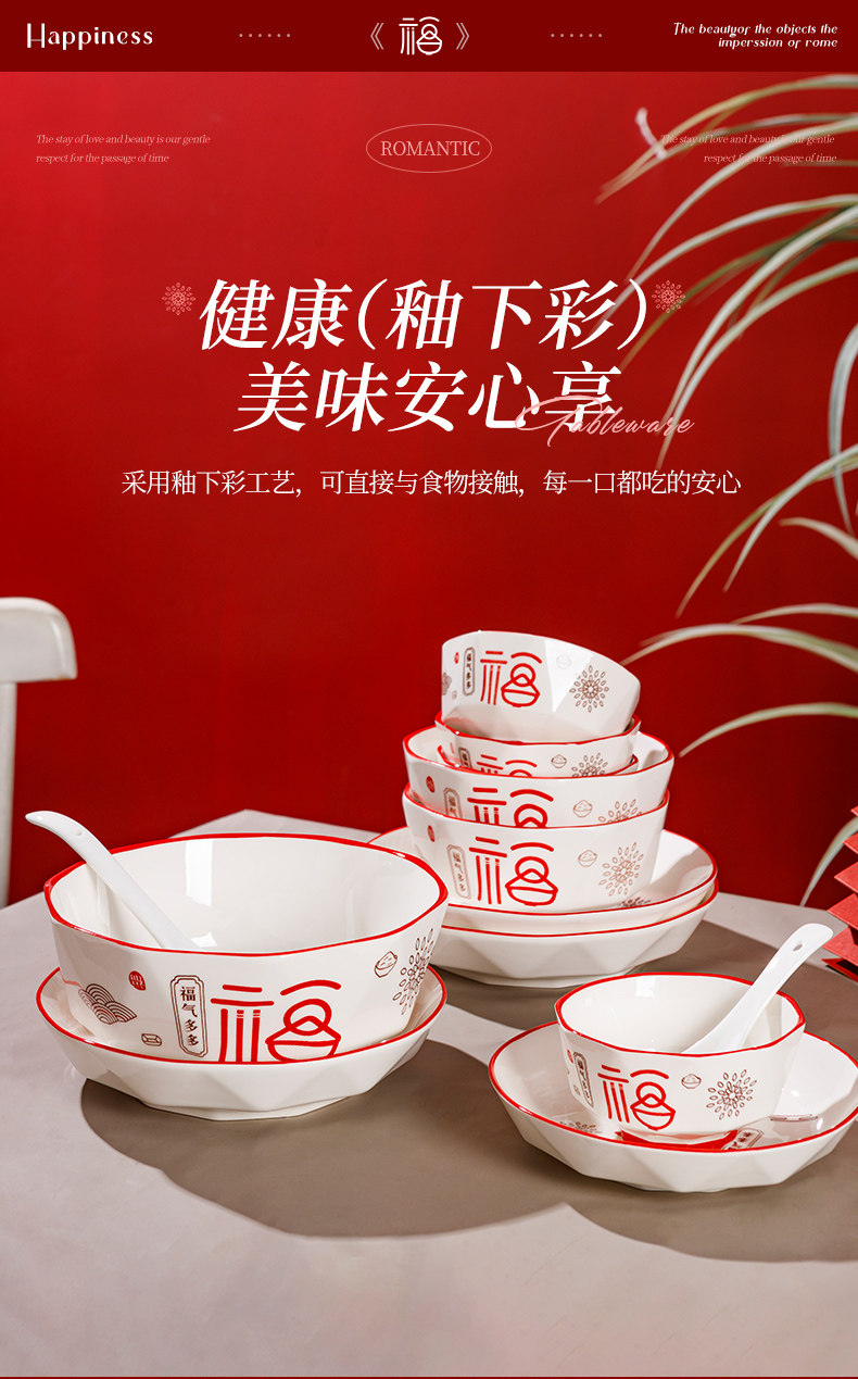 Chinese-Style Bowl and Plate Set with the Character for Happiness, Underglaze Color, Housewarming Tableware Set, Gift Box, New Year Reunion Tableware, Wedding Bowl
