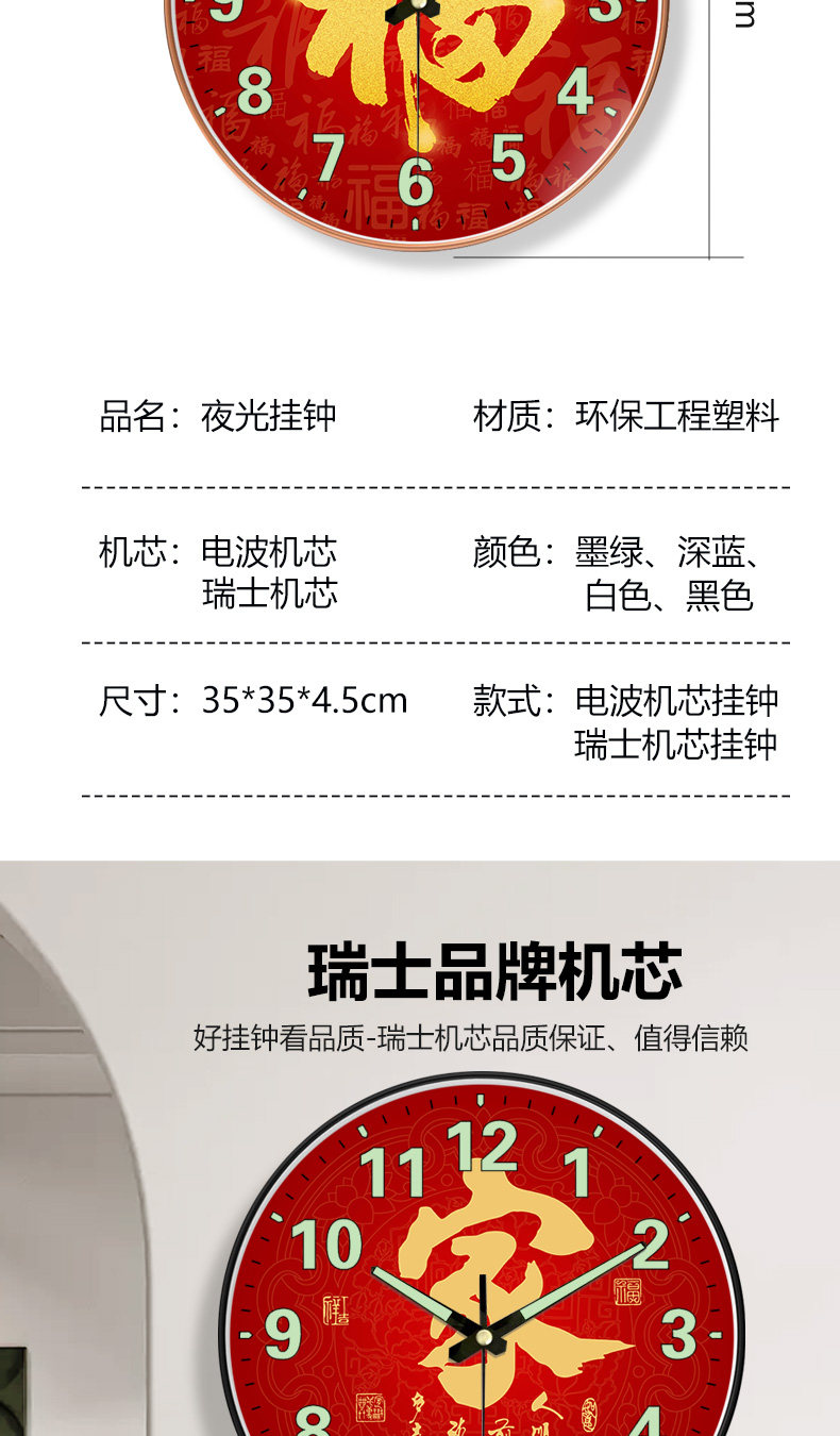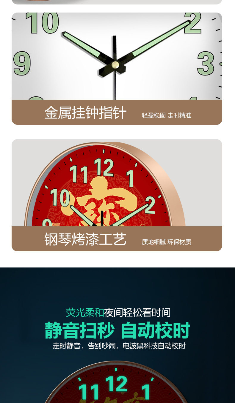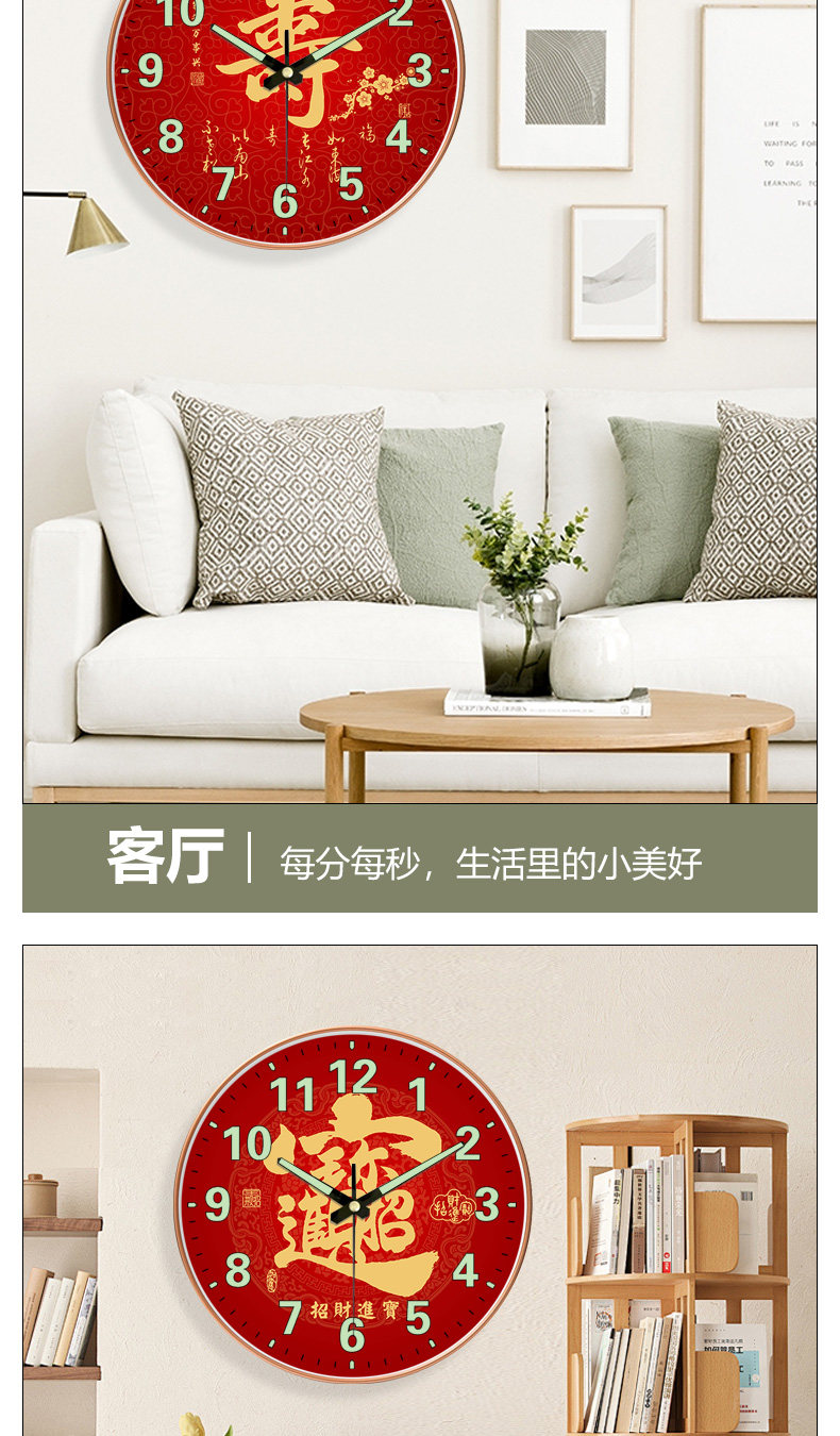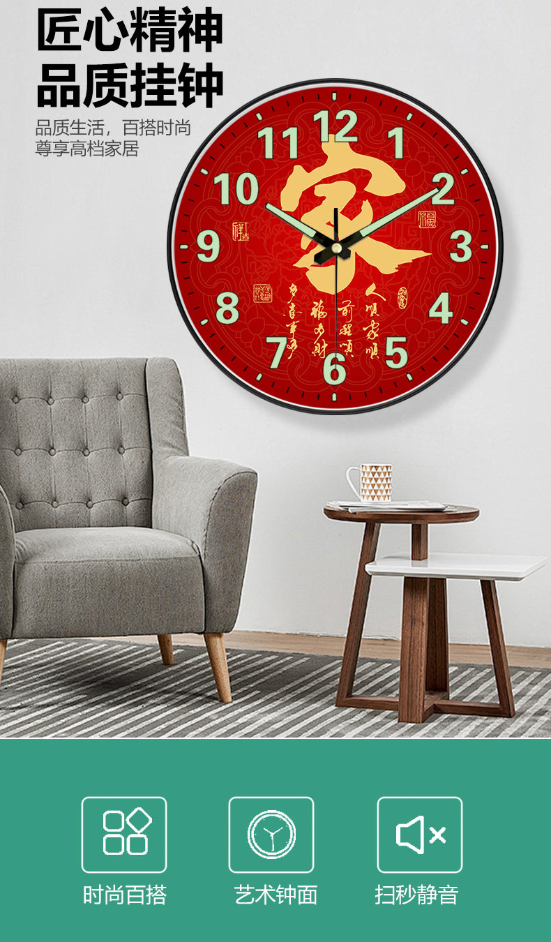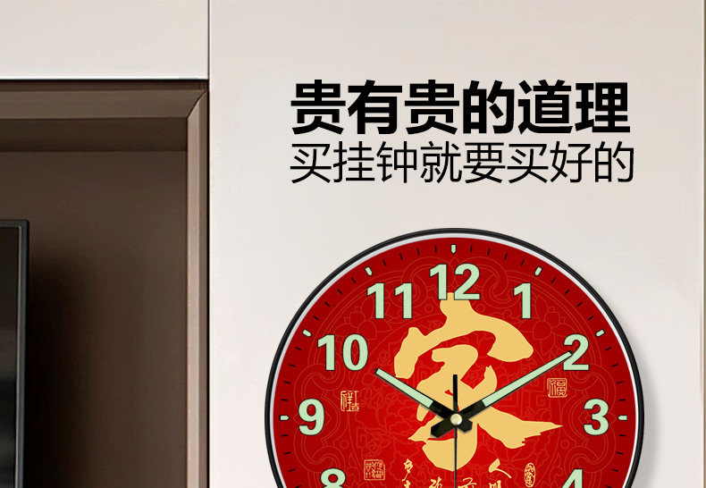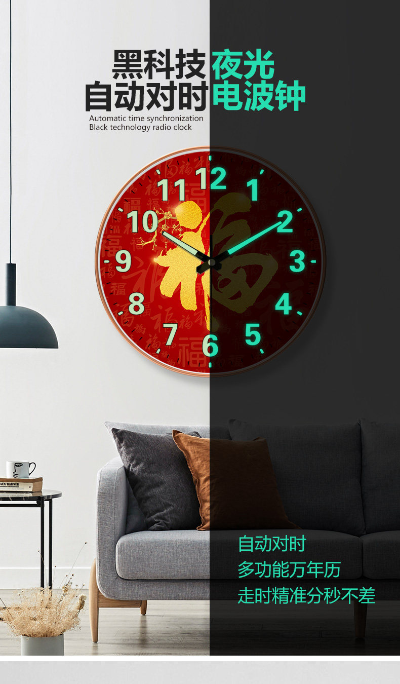 Suning.Com Fortune Character Luminous Clock Radio-Controlled Wall Clock for Home Use, Fashionable and Creative Wall-Mounted Simple Quartz Clock 2129