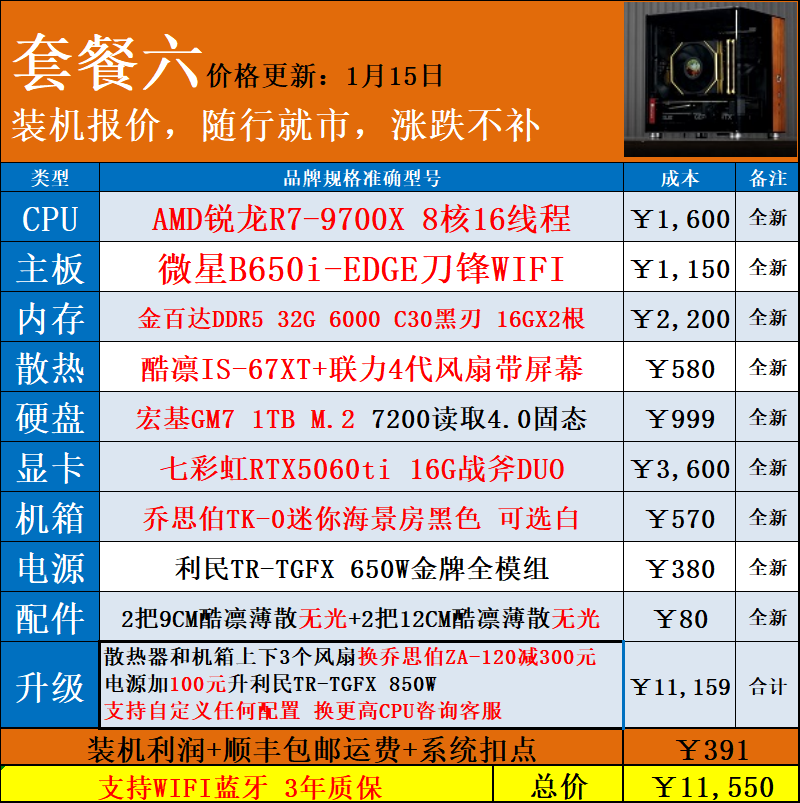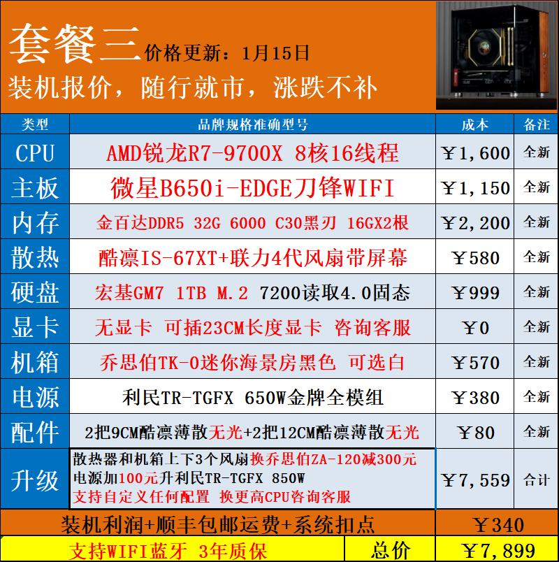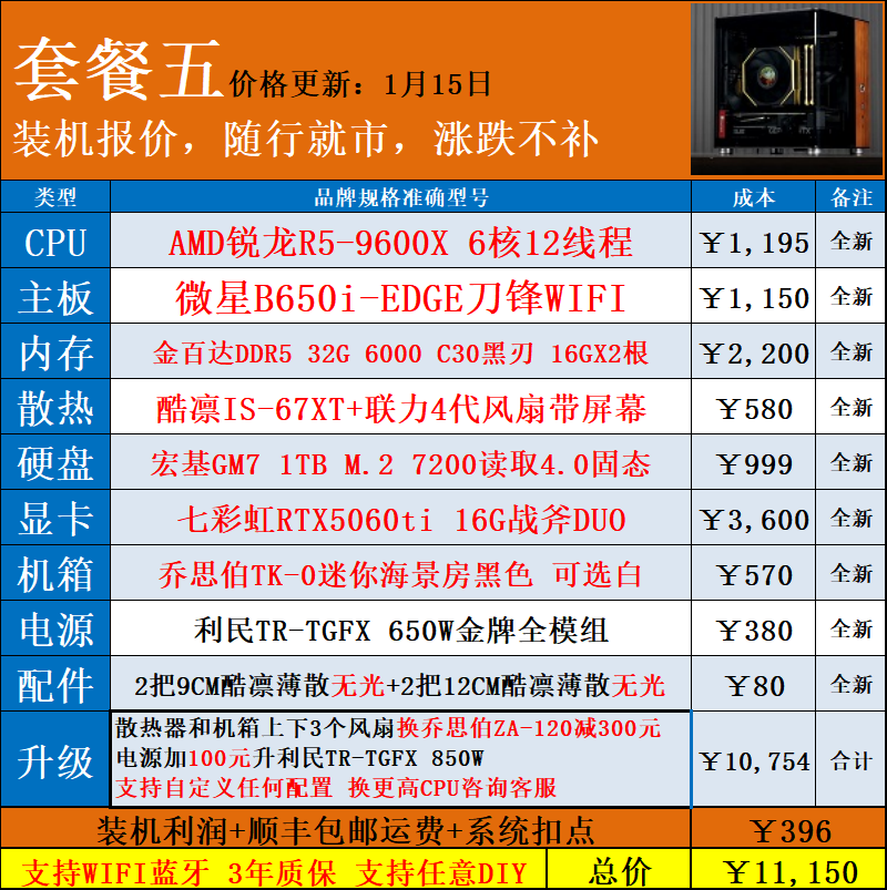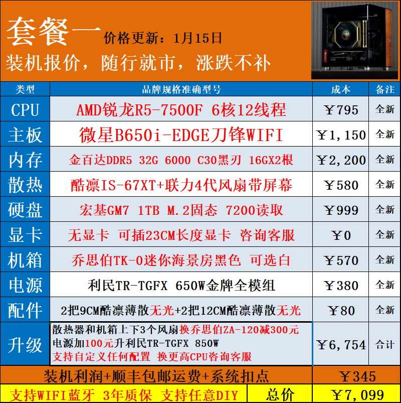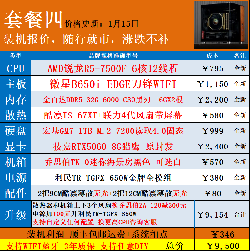 | Package Type | Package 1 R5 7500F Without Graphics Card,Package 2 R5 9600X Without Graphics Card,Package 3 R7 9700X Without Graphics Card,Package 4 R5 7500F+Rtx5060 8g,Package 5 R5 9600X Without + Rtx5060Ti 16g,Package Six R7 9700X+Rtx5060Ti 16g |