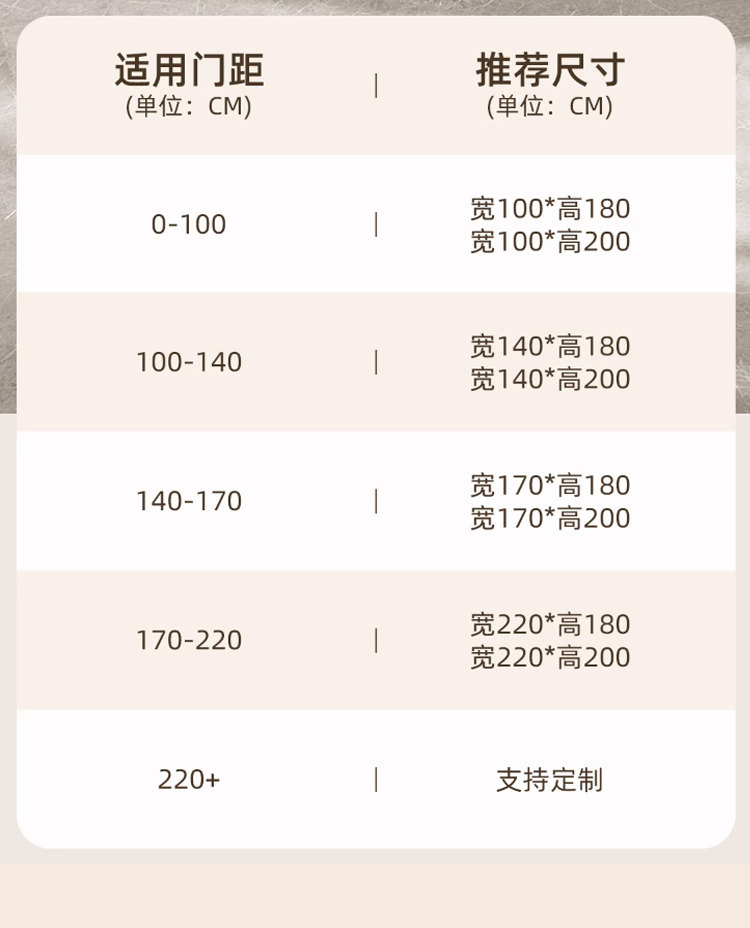 | Size | Applicable Door Width 0-100 (Curtain Width 110*Height 180),Applicable Door Width 100-130 (Curtain Width 140*Height 180),Applicable Door Width 130-160 (Curtain Width 170*Height 180),Applicable Door Width 160-190 (Curtain Width 190*Height 180),Applicable Door Width 190-210 (Curtain Width 220*Height 180),Applicable Door Width 0-100 (Curtain Width 110*Height 200),Applicable Door Width 100-130 (Curtain Width 140*Height 200),Applicable Door Width 130-160 (Curtain Width 170*Height 200),Applicable Door Width 160-190 (Curtain Width 190*Height 200),Applicable Door Width 190-210 (Curtain Width 220*Height 200),Applicable Door Width 210-230 (Curtain Width 240*Height 200),Applicable Door Width 0-100 (Curtain Width 110*Height 240),Applicable Door Width 100-130 (Curtain Width 140*Height 240),Applicable Door Width 130-160 (Curtain Width 170*Height 240),Applicable Door Width 160-190 (Curtain Width 190*Height 240),Applicable Door Width 190-210 (Curtain Width 220*Height 240),Applicable Door Width 210-230 (Curtain Width 240*Height 240) |