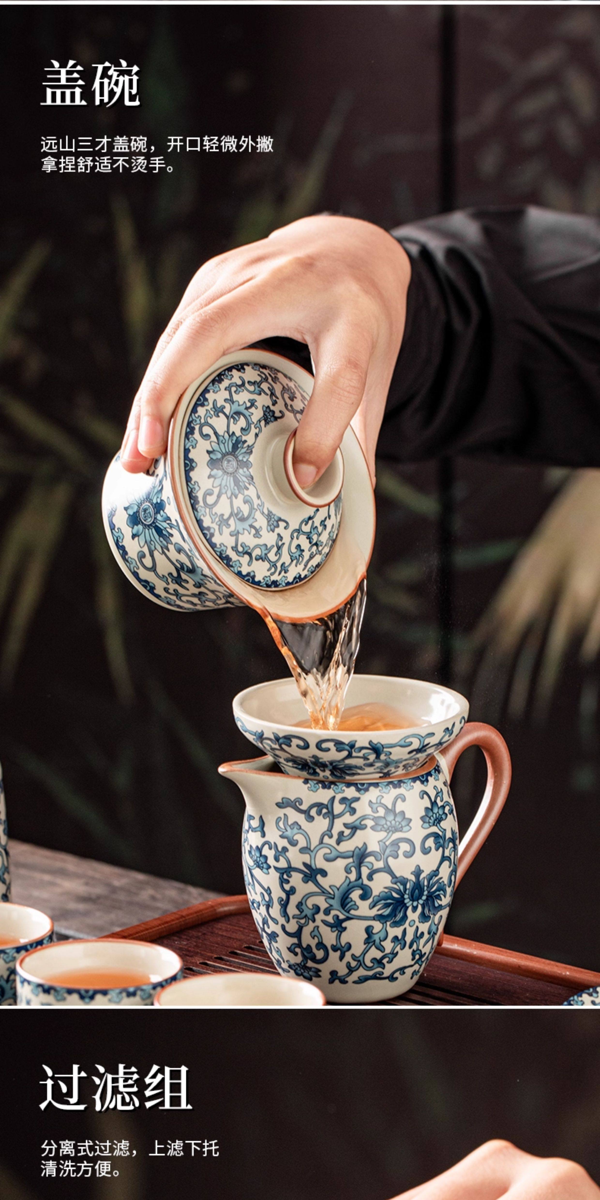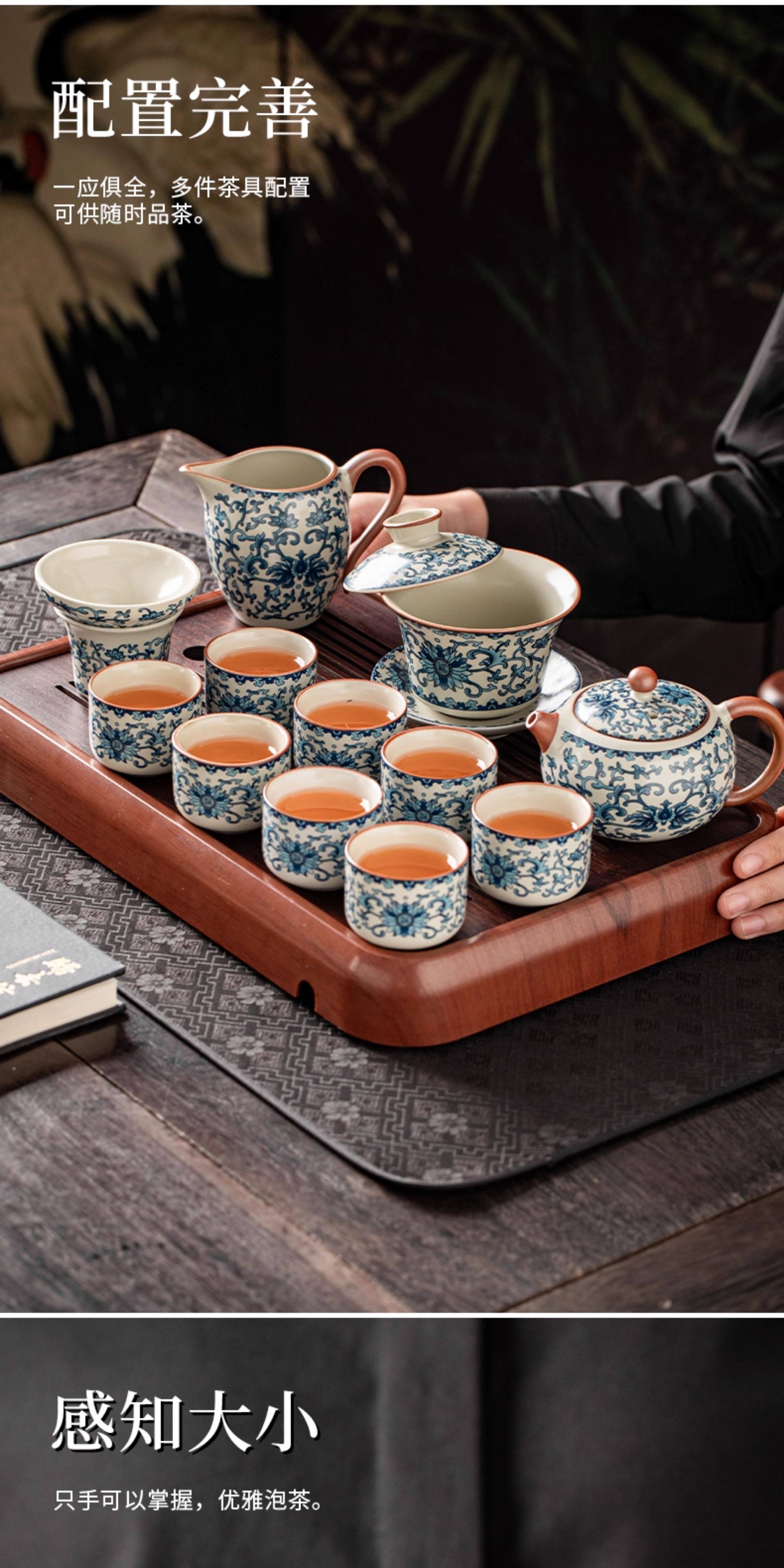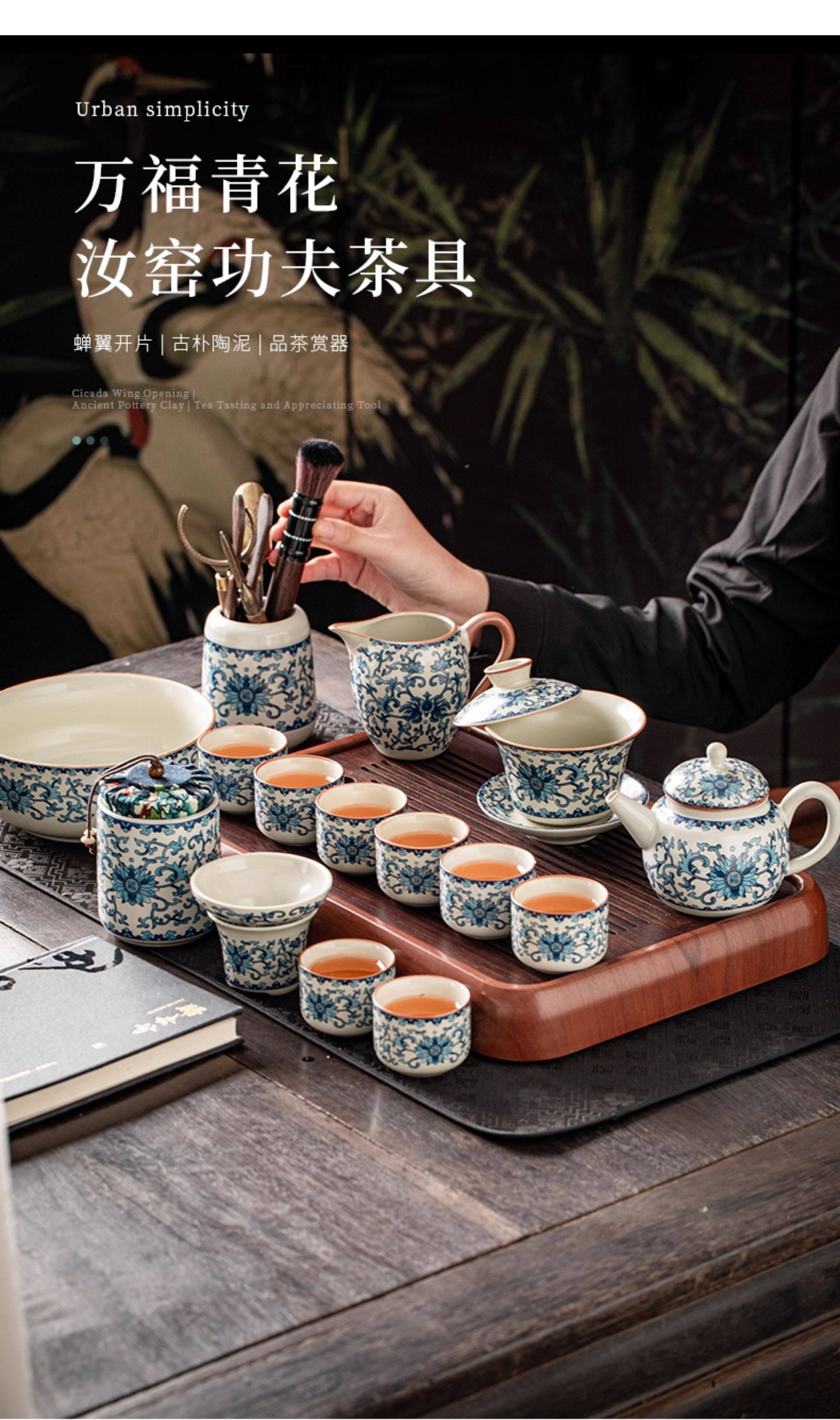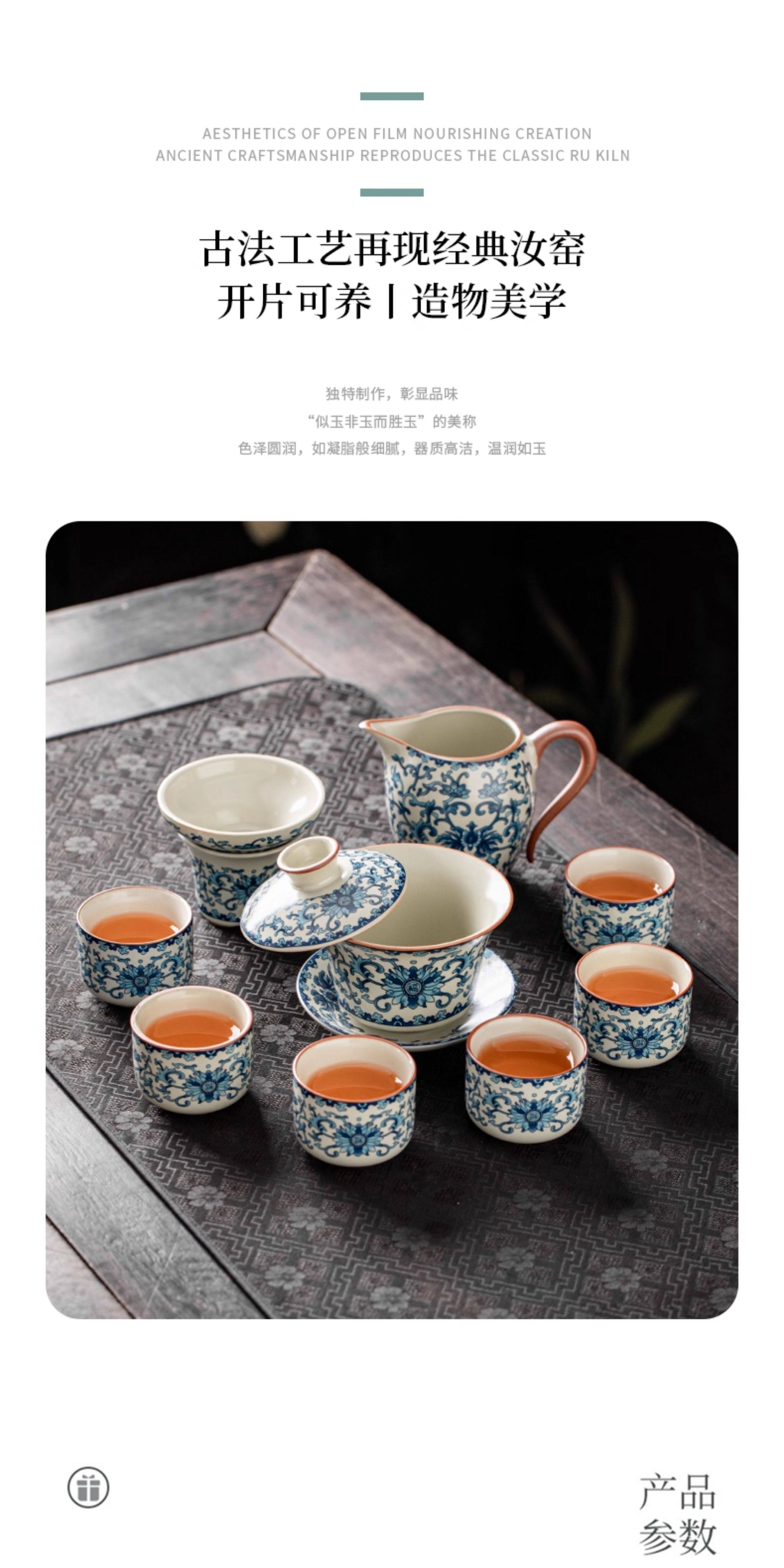 Ru Kiln Blue and White Kung Fu Tea Set Ceramic Teapot with Lid, Floating Lid Bowl, Tea Cup, Tea Tray, Light Luxury High-End Household Use