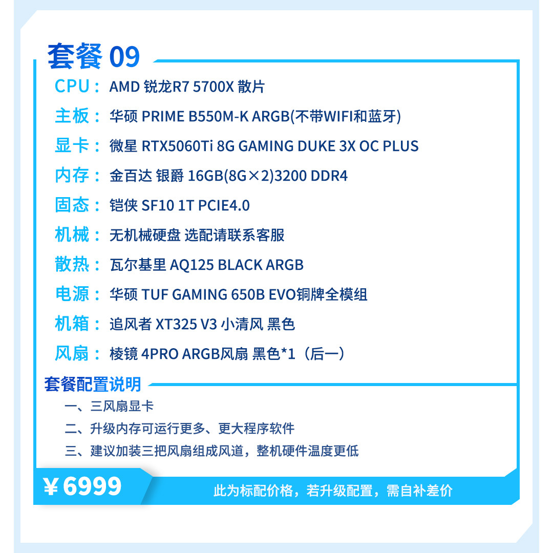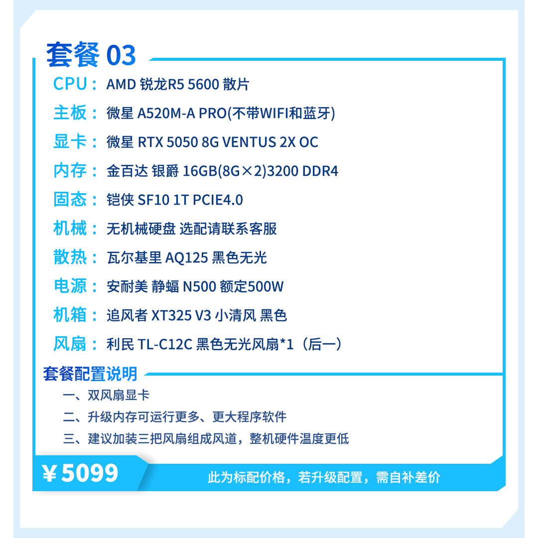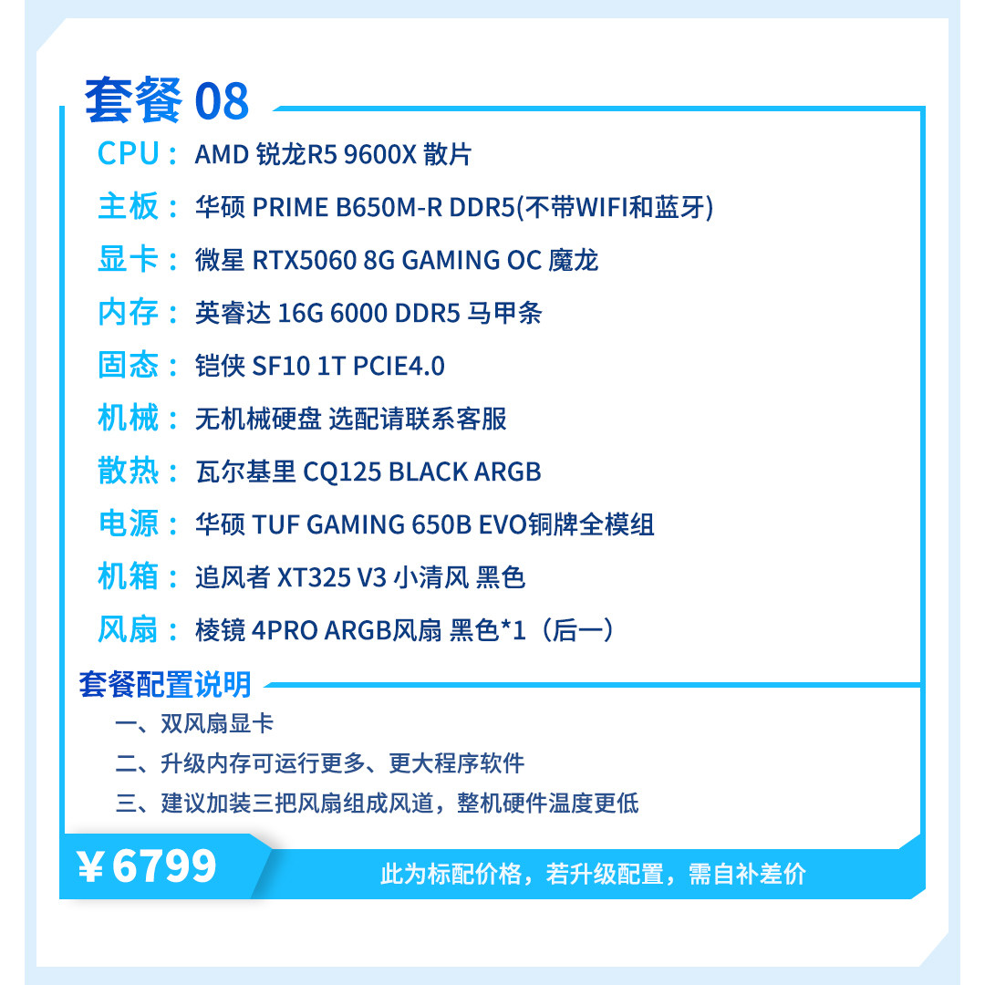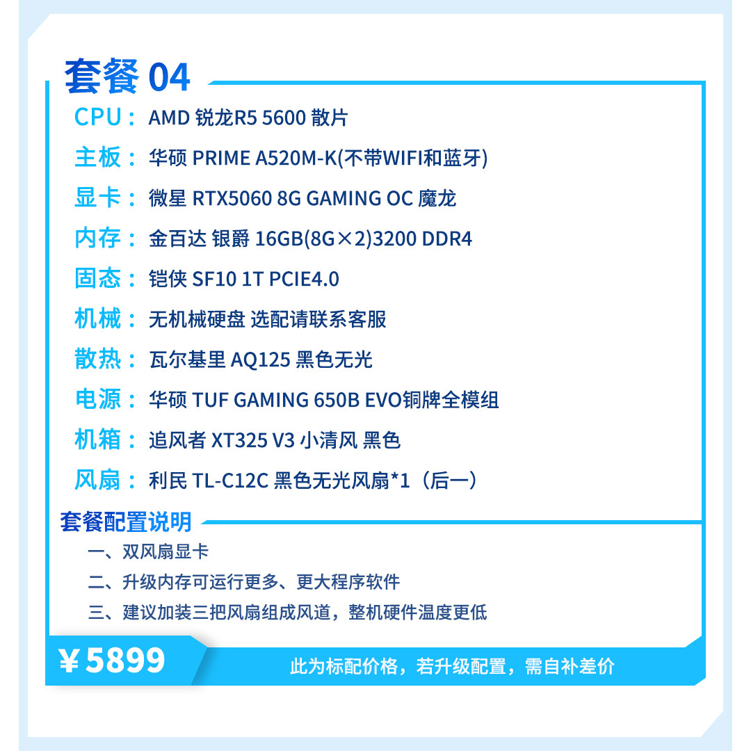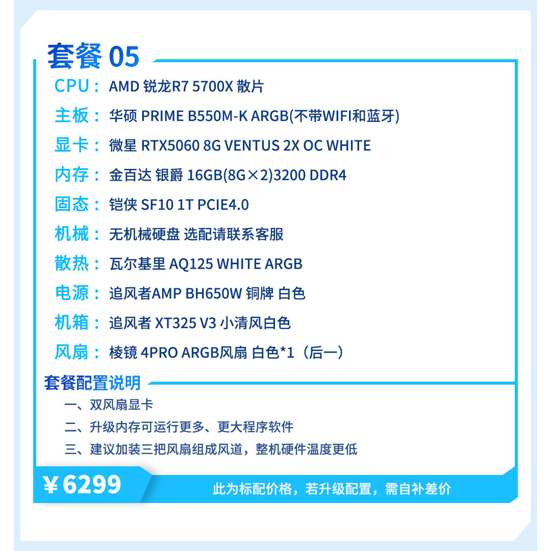 | Package Type | Package 1 (5600Gt + Integrated Graphics Card),Package 2 (5500+Rtx3050),Package 3 (5600+Rtx5050),Package 4 (5600+Rtx5060),Package 5 (5700X+Rtx5060),Package 6 (5700X+Rtx5060),Package 7 (7500F+Rtx5060),Package 8 (9600X+Rtx5060),Package 9 (5700X+Rtx5060Ti),Package 10 (7500F+Rtx5060Ti),Package 11 (9600X+Rtx5060Ti),Package 12 (9600X+Rtx5070),Package 13 (9600X+Rtx5070),Package 14 (9700X+Rtx5070),Package 15 (7800X3D+Rtx5070),Package 16 (9700X+Rtx5070Ti),Package 17 (7800X3D+Rtx5070Ti),Package 18 (9800X3D+Rtx5070Ti U),Package 19 (9800X3D+Rtx5080),Package 20 (9800X3D+Rtx5080),Package 21 (9950X3D+Rtx5080) |