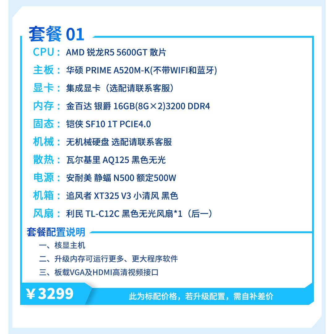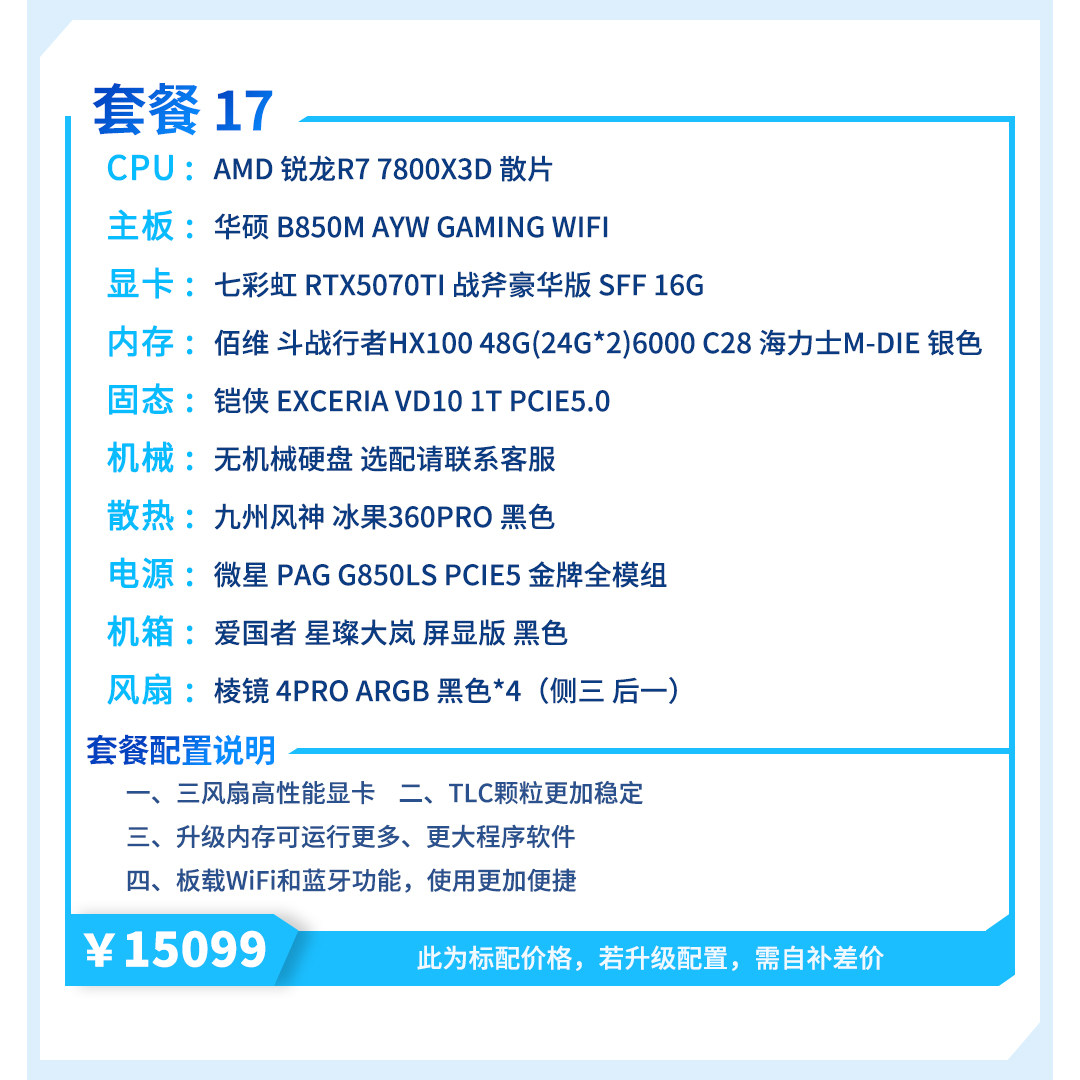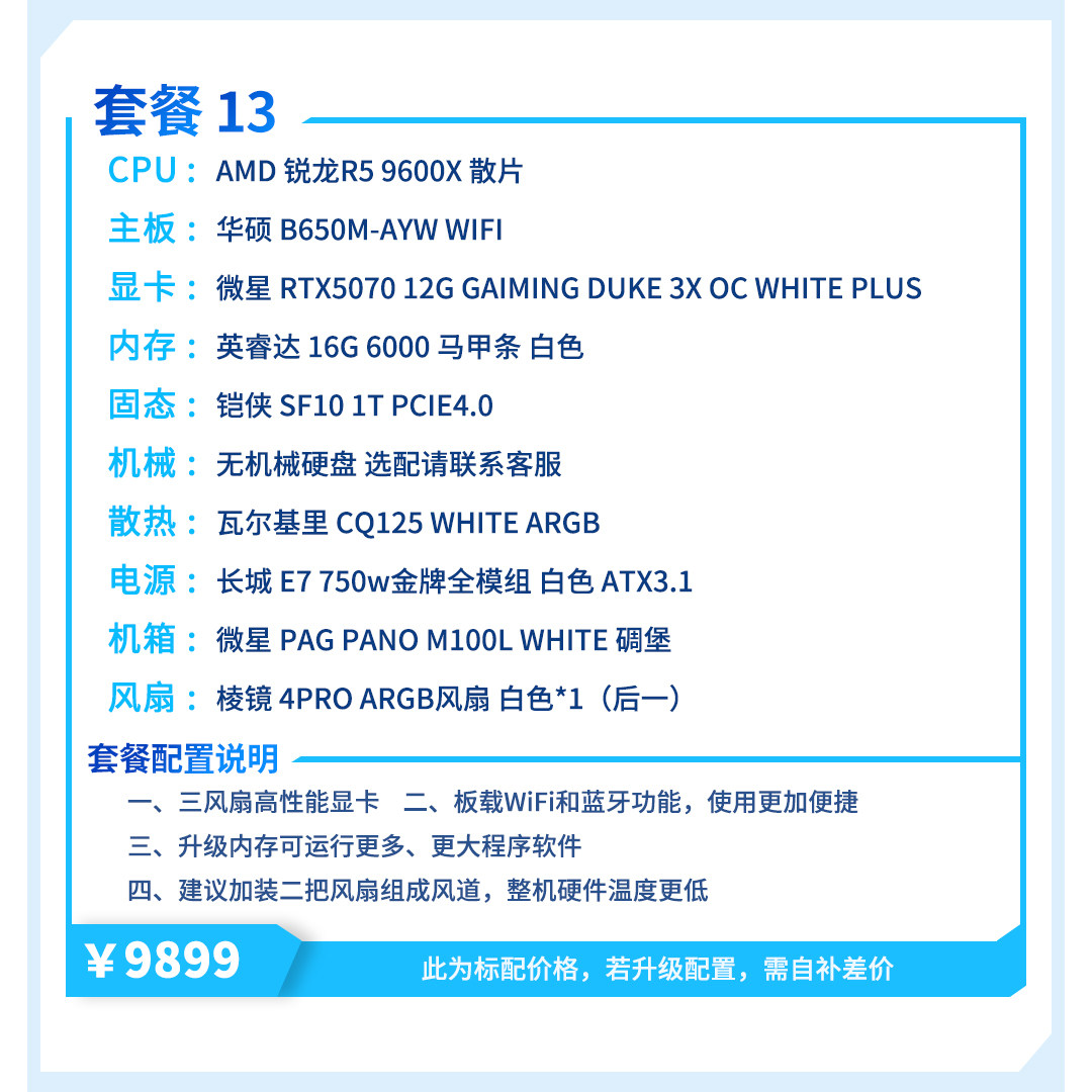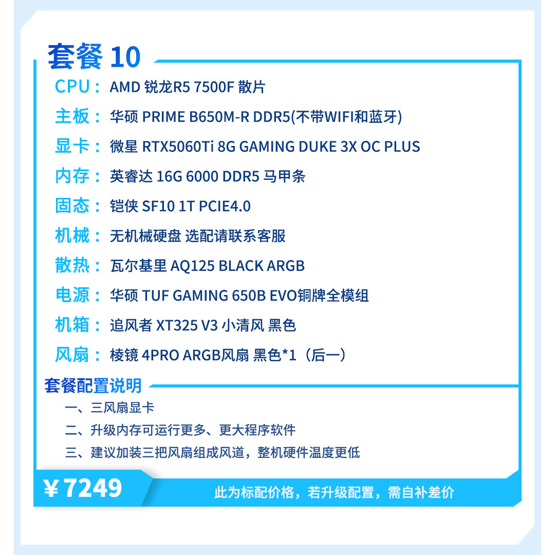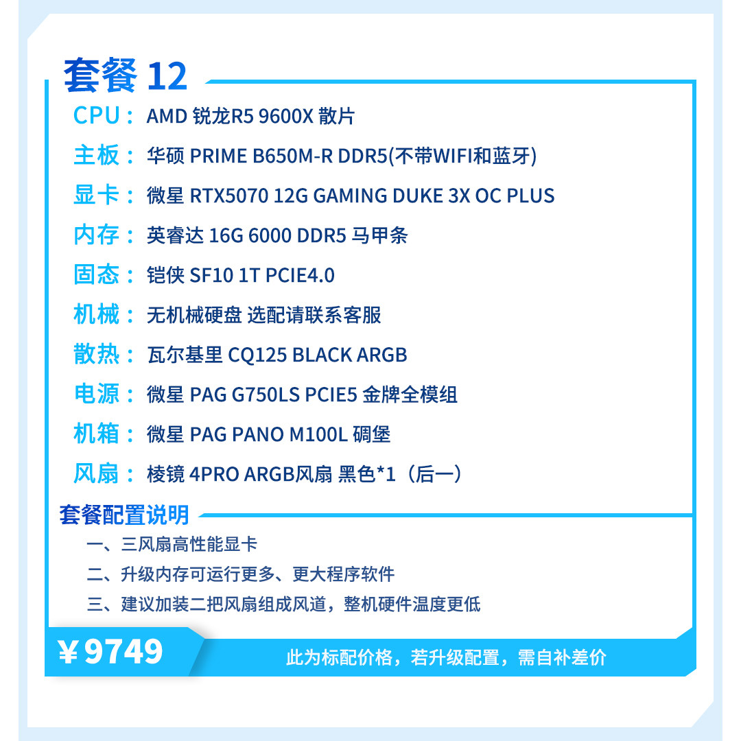 | Package Type | Package 1 (5600Gt + Integrated Graphics Card),Package 2 (5500+Rtx3050),Package 3 (5600+Rtx5050),Package 4 (5600+Rtx5060),Package 5 (5700X+Rtx5060),Package 6 (5700X+Rtx5060),Package 7 (7500F+Rtx5060),Package 8 (9600X+Rtx5060),Package 9 (5700X+Rtx5060Ti),Package 10 (7500F+Rtx5060Ti),Package 11 (9600X+Rtx5060Ti),Package 12 (9600X+Rtx5070),Package 13 (9600X+Rtx5070),Package 14 (9700X+Rtx5070),Package 15 (7800X3D+Rtx5070),Package 16 (9700X+Rtx5070Ti),Package 17 (7800X3D+Rtx5070Ti),Package 18 (9800X3D+Rtx5070Ti U),Package 19 (9800X3D+Rtx5080),Package 20 (9800X3D+Rtx5080),Package 21 (9950X3D+Rtx5080) |