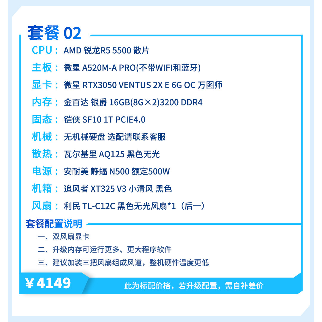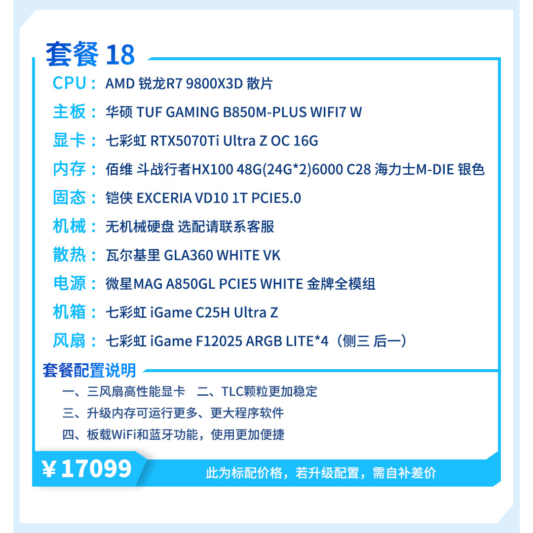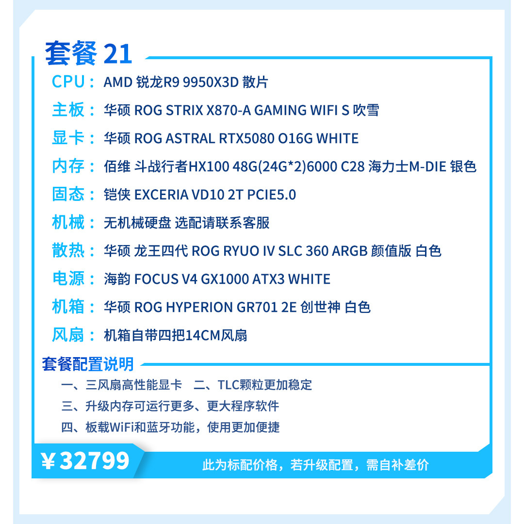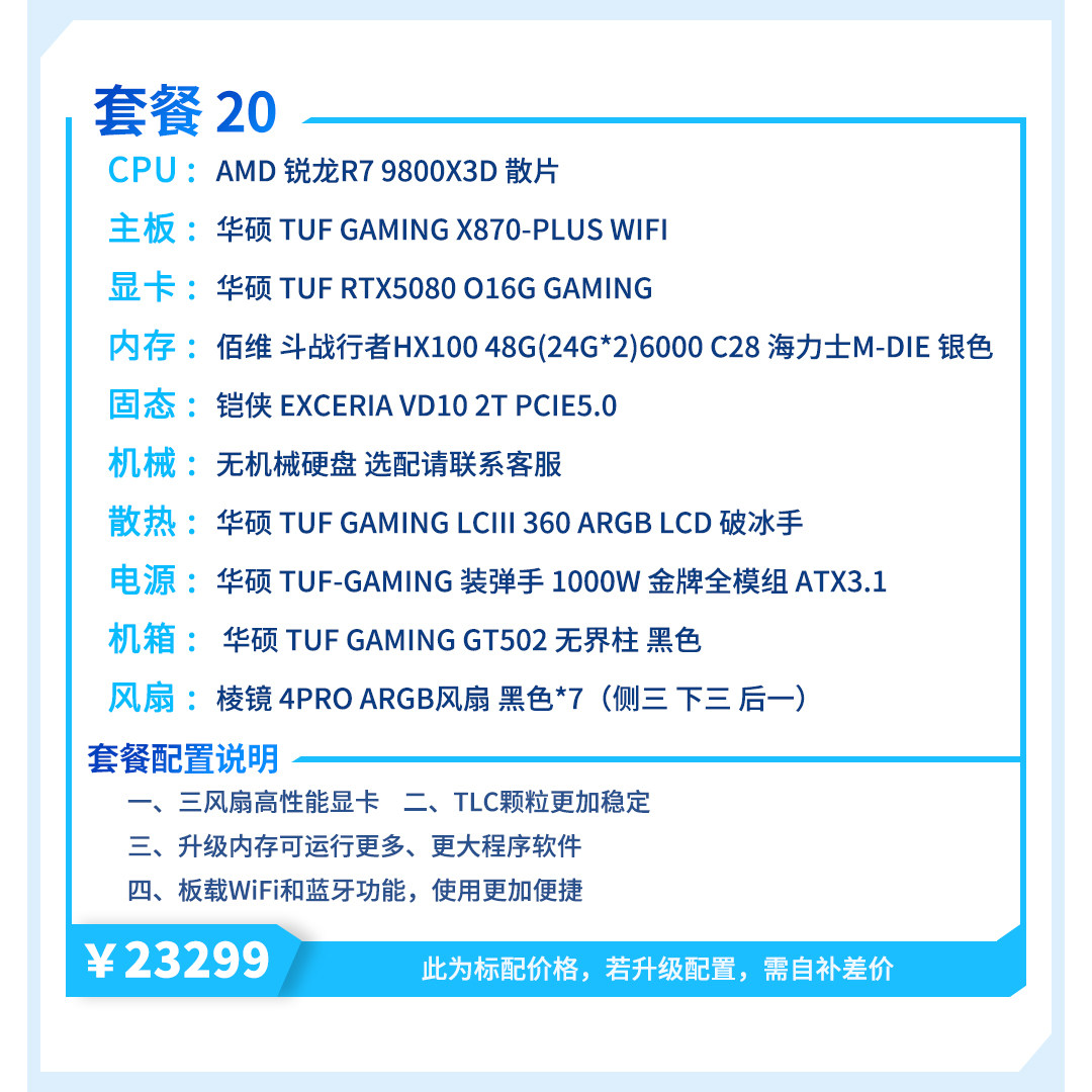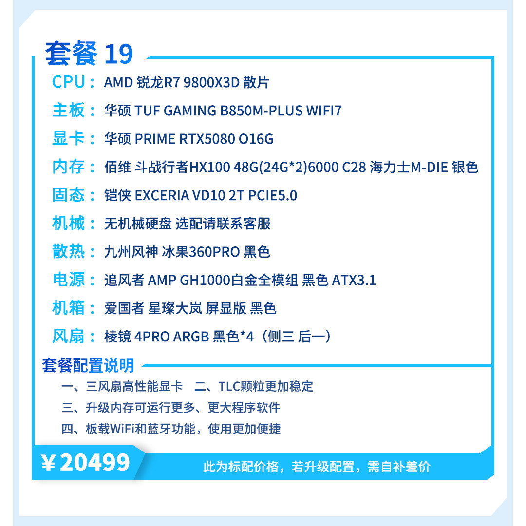 | Package Type | Package 1 (5600Gt + Integrated Graphics Card),Package 2 (5500+Rtx3050),Package 3 (5600+Rtx5050),Package 4 (5600+Rtx5060),Package 5 (5700X+Rtx5060),Package 6 (5700X+Rtx5060),Package 7 (7500F+Rtx5060),Package 8 (9600X+Rtx5060),Package 9 (5700X+Rtx5060Ti),Package 10 (7500F+Rtx5060Ti),Package 11 (9600X+Rtx5060Ti),Package 12 (9600X+Rtx5070),Package 13 (9600X+Rtx5070),Package 14 (9700X+Rtx5070),Package 15 (7800X3D+Rtx5070),Package 16 (9700X+Rtx5070Ti),Package 17 (7800X3D+Rtx5070Ti),Package 18 (9800X3D+Rtx5070Ti U),Package 19 (9800X3D+Rtx5080),Package 20 (9800X3D+Rtx5080),Package 21 (9950X3D+Rtx5080) |