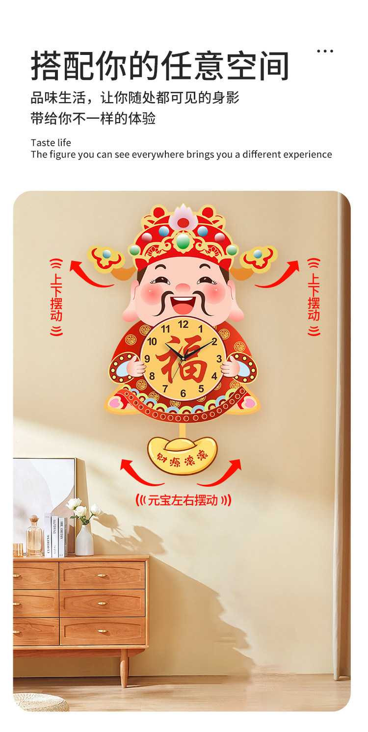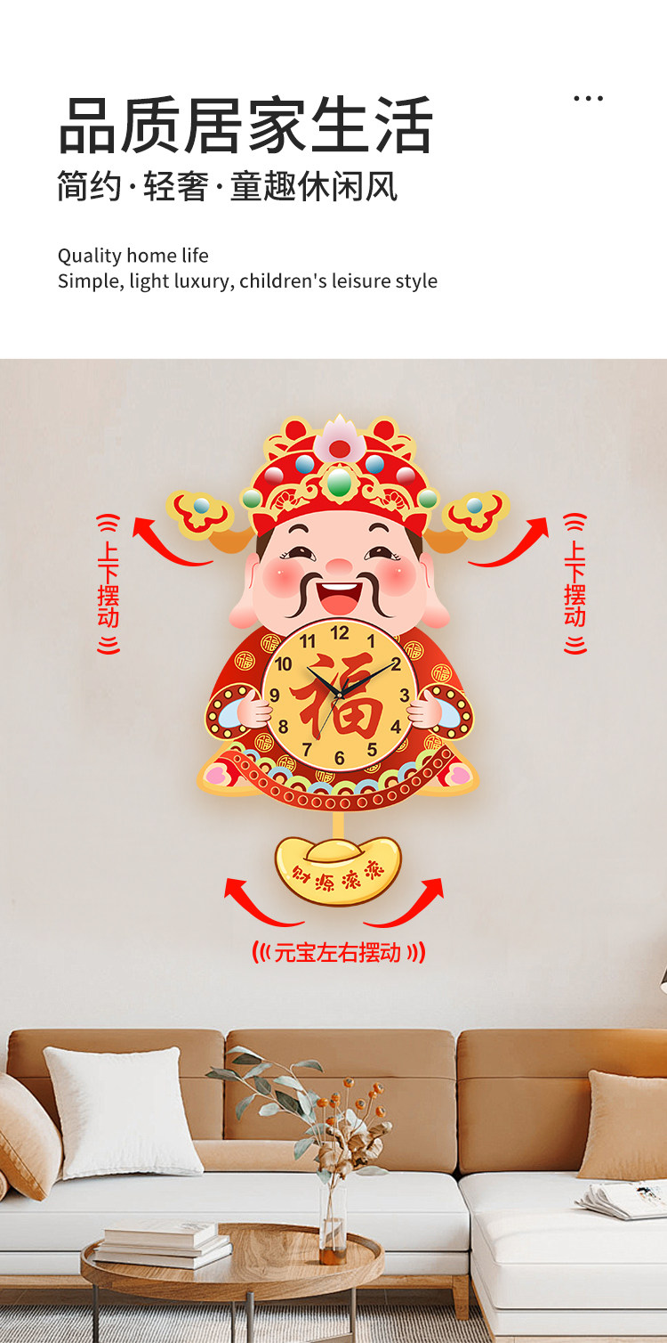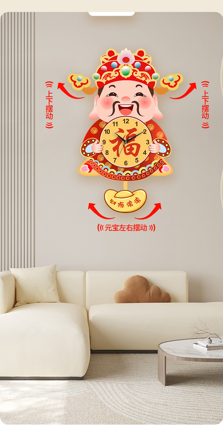 Fortune God Wall Clock for Living Room, New Chinese Style Home Clock, Swinging Clock, Festive Quartz Clock, Creative Housewarming Wall Clock
