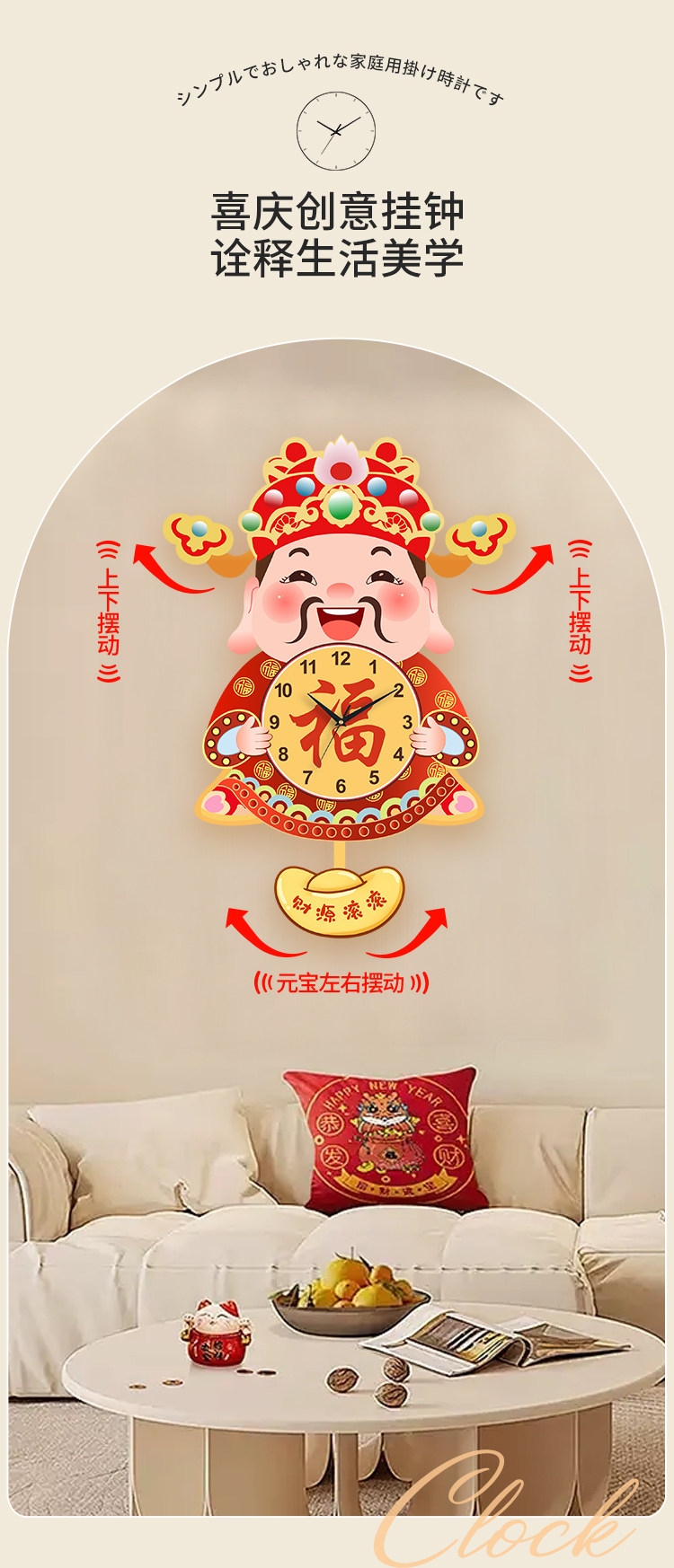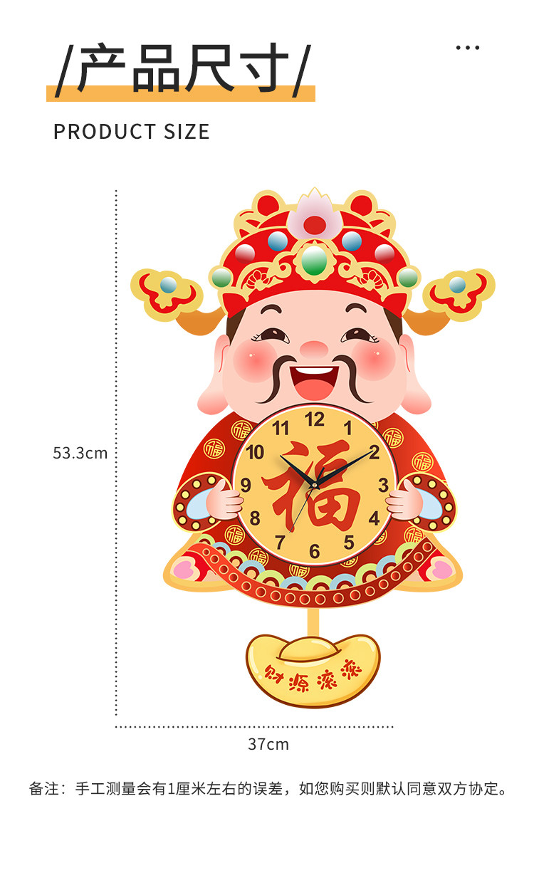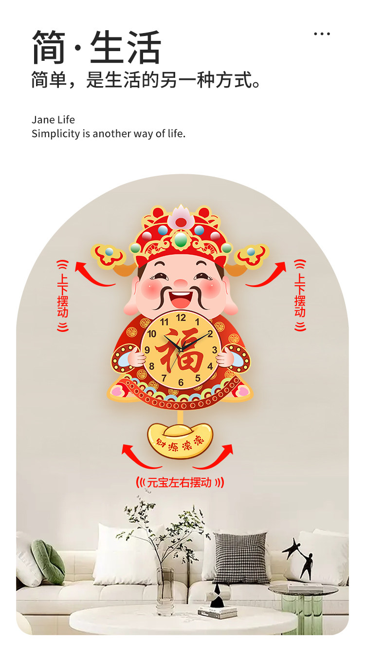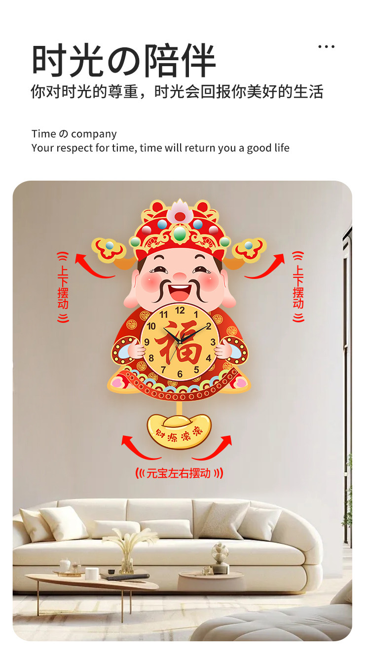 Fortune God Wall Clock for Living Room, New Chinese Style Home Clock, Swinging Clock, Festive Quartz Clock, Creative Housewarming Wall Clock