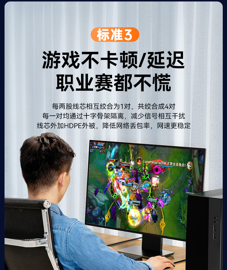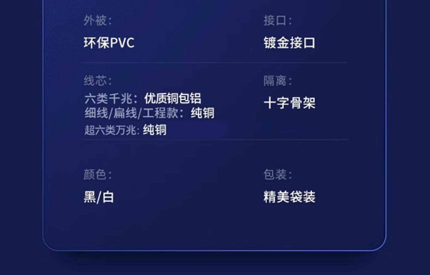 | Color Classification | Cat5E Gigabit Black,Cat5E Gigabit White,Category 6 Gigabit Black[Hot Selling Model],Cat6 Gigabit White,Category 6 Gigabit Blue,Category 6 Gigabit Gray,Category 6[Round Wire Pure Copper]Poe Power Supply,Category 6[Flat Wire Pure Copper]Gigabit Black,Category 6[Flat Wire Pure Copper]Gigabit White,Category 6[Flat Wire Pure Copper]Gigabit Blue,Category 6A[Thin Wire Pure Copper]10g Black,Category 6A[Thin Wire Pure Copper]10g White,Category 6A[Thin Wire Pure Copper]10g Blue,Category 6A[Chunky Knit Classic]10g Black,Category 6A[Thick Wire Pure Copper]Poe Power Supply,Category 7[Three-Shield Strong Anti-Interference]Pure Copper Black,Category 7[Three-Shield Strong Anti-Interference]Pure Copper White,Category 7[Three-Shield Strong Anti-Interference]Pure Copper Blue,Category 8[Double Shielded 40g Classic]Pure Copper Black,Category 8[Double Shielded 40g Wear-Resistant]Pure Copper Cotton Mesh,Category 8[Double Shielded 40g Bold]Pure Copper Upgrade |