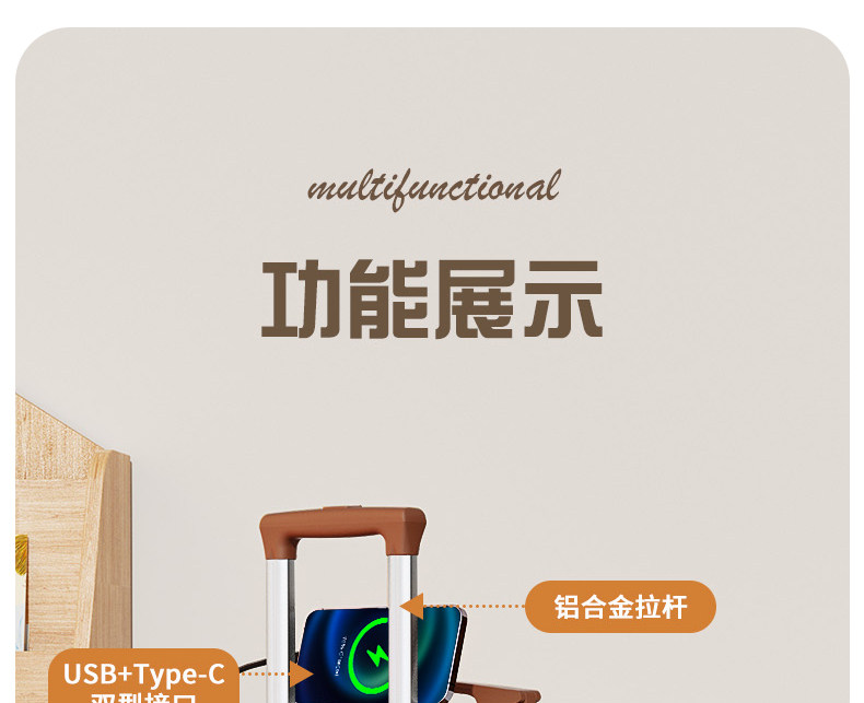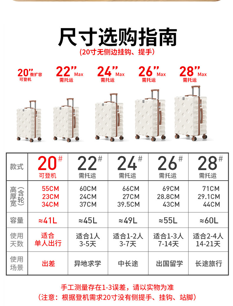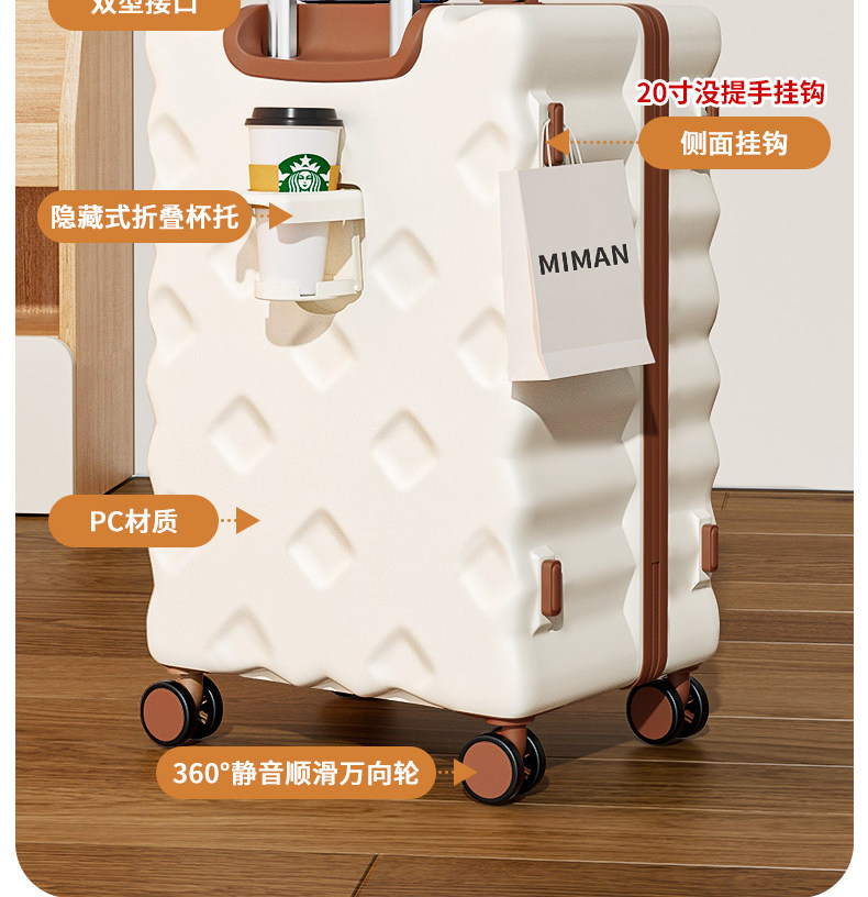 | Size | 22inch[37% Expanded Capacity + Front Hook + Foldable Cup Holder + Phone Charging Port],24inch[37% Expanded Capacity + Front Hook + Foldable Cup Holder + Phone Charging Port],26inch[37% Expanded Capacity + Front Hook + Foldable Cup Holder + Phone Charging Port],28inch[37% Expanded Capacity + Front Hook + Foldable Cup Holder + Phone Charging Port],20inch Airline Approved[37% Expanded Capacity + Front Hook + Foldable Cup Holder + Phone Charging Port] |