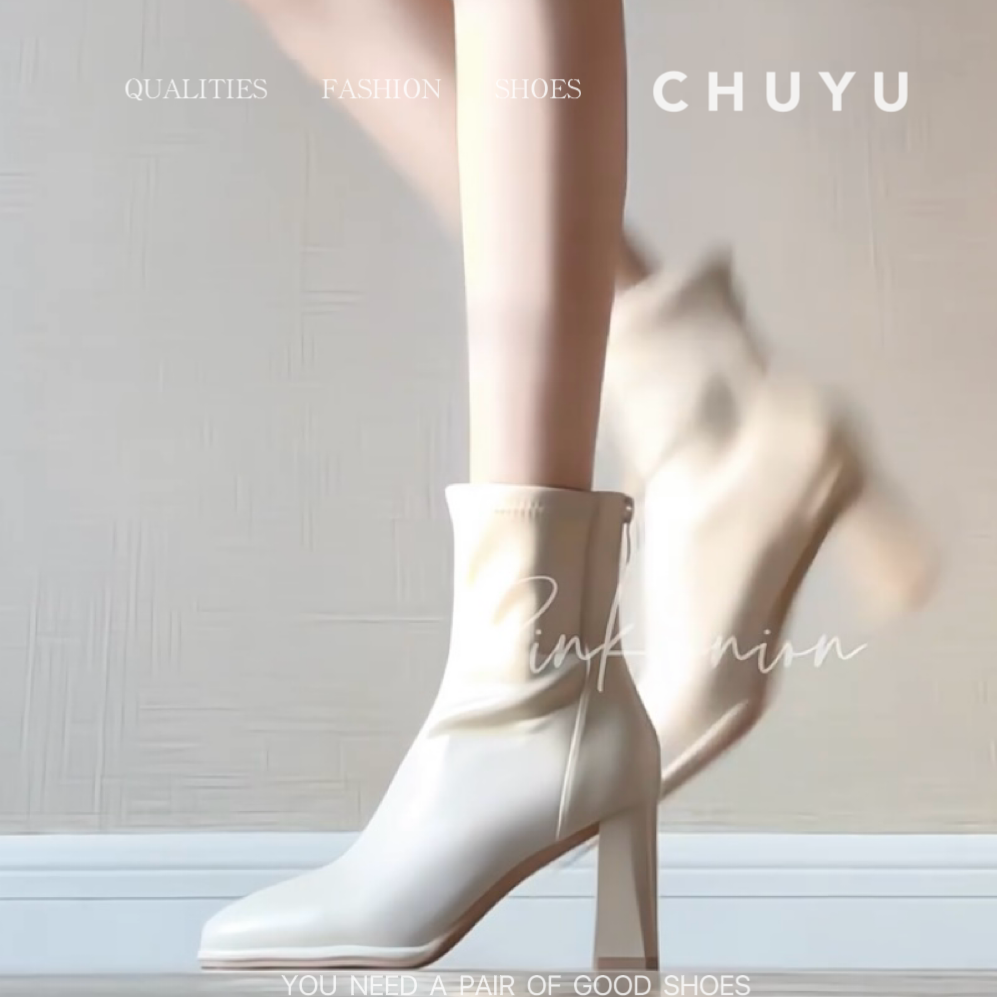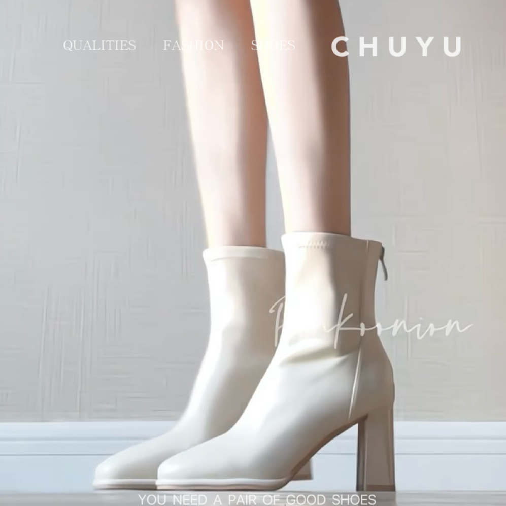 Off-White Short Boots for Women, New Autumn and Winter Boots with Plush Lining, Chunky Heel, High Heel Boots, Korean Drama Heroine Style, Slim Boots, Square Toe
