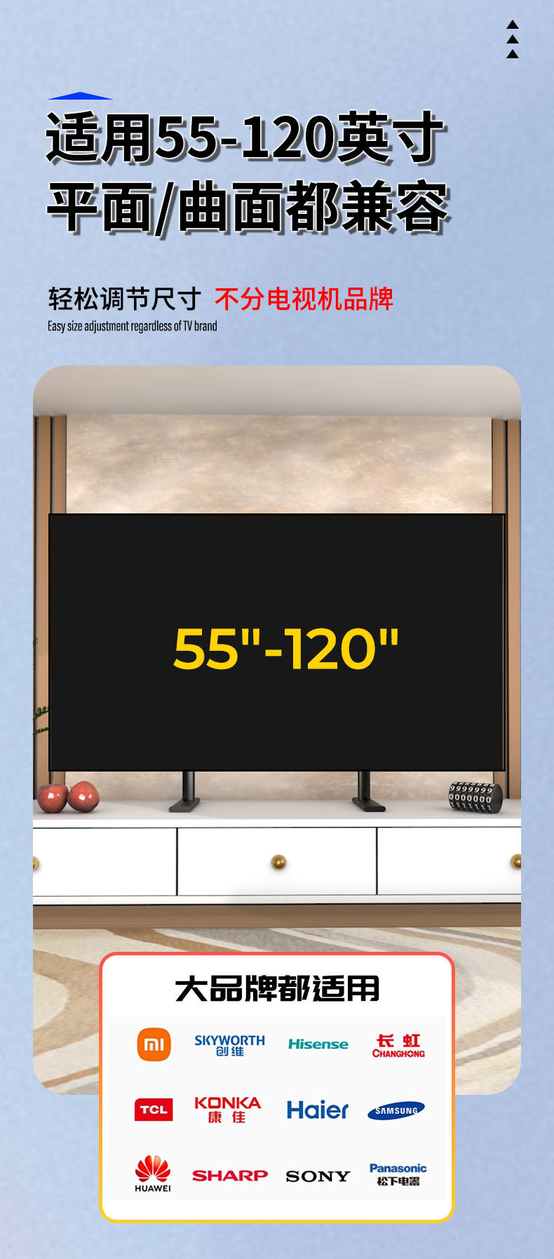 | Color Classification | [Desktop Model] 55-75inch Tv Base,[Desktop Model] 65-100inch Tv Base,[Floor-Standing Model] 55-80inch Large Screen Tv Floor-Standing Bracket,[Floor-Standing Model] 55-120inch Large Screen Tv Floor-Standing Bracket,【Floor-Standing Movable Model】 55-120inch Large Screen Floor Stand,The Length of the Bottom Foot Can Be Personalized. if You Have Special Requirements, Please Note the Size of the Bottom Foot. |