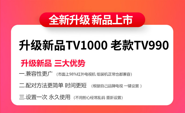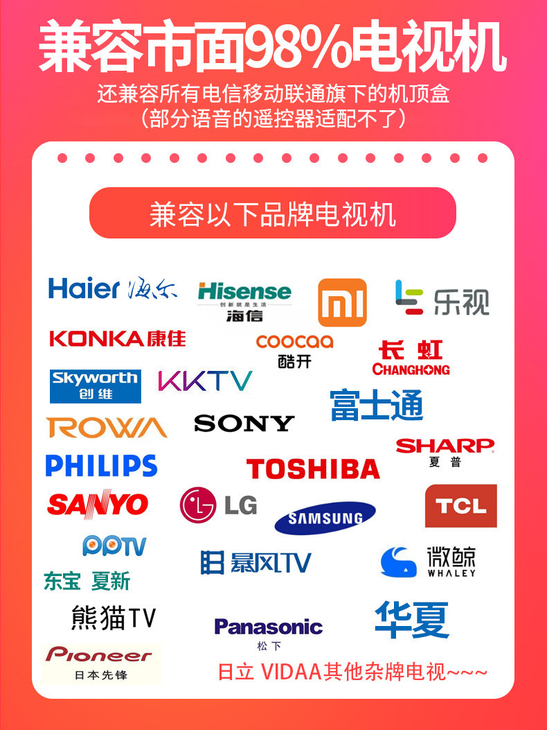 | Color Classification | Universal Tv Remote Control + Free Batteries (Compatible with All Tvs),(Niche Brands Can Only Be Used if They Are the Same as Old Remote Controls) + Free Battery,Universal Tv Remote 1+ with Free Battery (Compatible with All Tvs),Universal Xiaomi Infrared Tv Remote Control + Free Batteries,Universal Tv Remote Control for Leeco + Free Batteries Included,Compatible with Skyworth Universal Remote Control + Free Battery,Universal Konka Tv Remote Control + Free Batteries,Universal Haier Tv Remote Control + Free Batteries,Suitable for Tcl Universal Tv Remote Control + Free Battery,Compatible Hisense Universal Tv Remote Control + Free Batteries Included,Universal Tv Remote Control for Summer Use + Free Batteries Included,Suitable for Samsung Universal Tv Remote Control + Free Battery,(Applicable to Konka Universal Edition) Universal Tv + Free Battery,Suitable for Sony Universal Tv Remote Control + Free Battery,(Applicable to Skyworth Universal Edition) Universal Tv + Free Battery,(Compatible with Skyworth Universal) Universal Skyworth Tv + Free Battery,(Applicable to Haier Universal Version) Universal Tv + Free Battery,(Applicable to Tcl Universal) Universal Tv + Free Battery,(Applicable to Hisense Universal Version) Universal Tv + Free Battery,(Compatible with Pioneer Universal) Universal Pioneer Tv Remote + Free Battery,(Compatible with Philips Universal) Universal Philips Tv Remote + Free Battery,(Applicable to Tsinghua Tongfang Universal) Universal Tsinghua Tongfang Tv + Free Battery,(Compatible with Toshiba Universal) Universal Toshiba Tv Remote + Free Battery,(Compatible with Older Changhong Universal Remotes) Universal Changhong Tv Remote + Free Battery,(Suitable for Sanyo Universal) Universal Sanyo Tv Remote + Free Battery,(Compatible with Panasonic Universal) Universal Panasonic Tv Remote + Free Battery,(Sony Universal Compatible) Universal Sony Tv Remote + Free Battery |